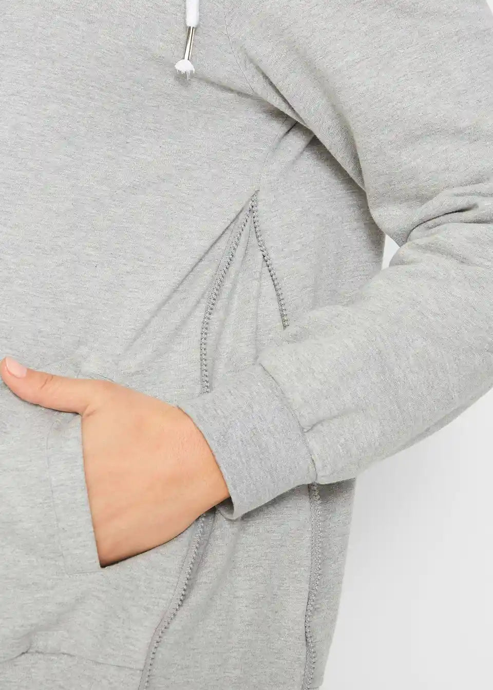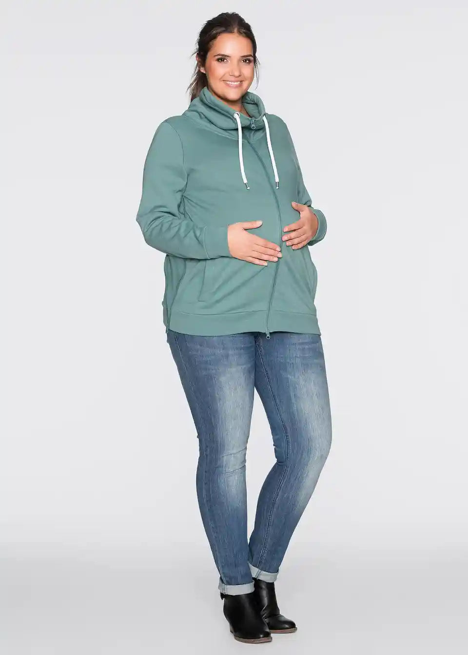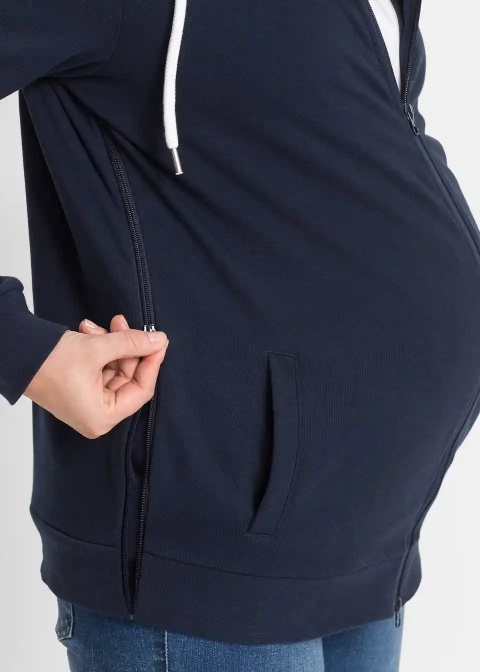 Jopica z mehko brušeno notranjo stranjo ima stoječi ovratnik z vlečnimi vrvicami. Stranske zadrge omogočajo prilagoditev širine, kar omogoča nošenje tako med nosečnostjo kot po njej. Z uporabnimi sprednjimi žepi. Mehki vložek za dojenčke ohranja otroka toplega.