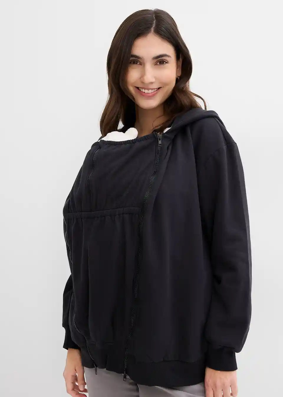 Ohlapno krojena jopica z dodatnim prostorom za trebušček iz čistega bombaža z mehko brušeno notranjo stranjo. S kapuco in praktičnimi žepi spredaj. Rokavi in rob so zaključeni z mehkimi rebrastimi patenti. Mehki vložek za dojenčka ga ohranja prijetno toplega in ima majhno zadrgo pri glavi.