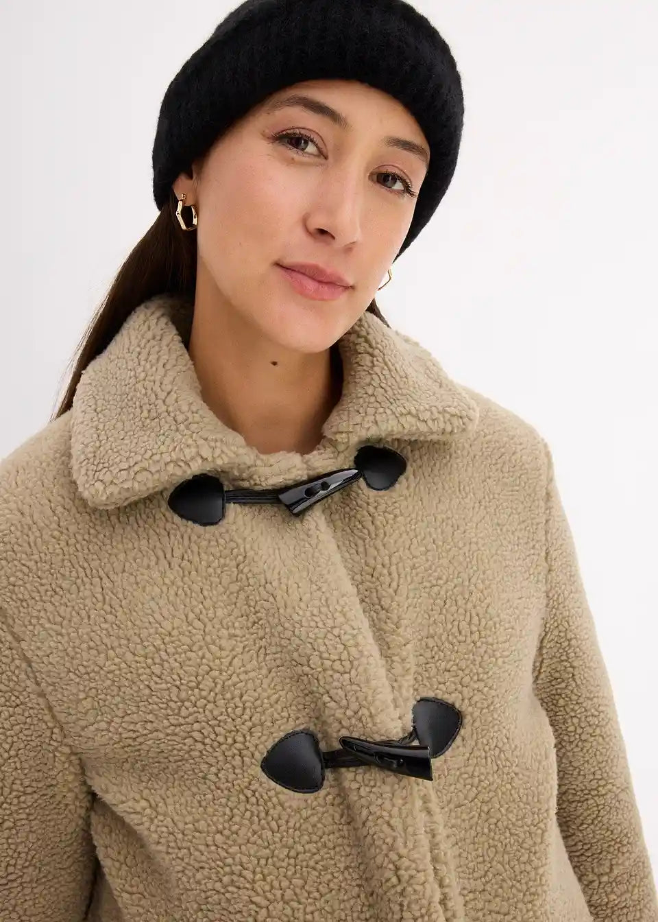 Plašč iz puhaste tkanine z ovratnikom in dekorativnimi gumbi. Z žepi na strani. Plašč se zapenja z gumbi, nosilni vložek pa se pritrdi z zadrgami. Vrat ostane topel tudi z nosilnim vložkom, saj se lahko zgornji gumb zapre.