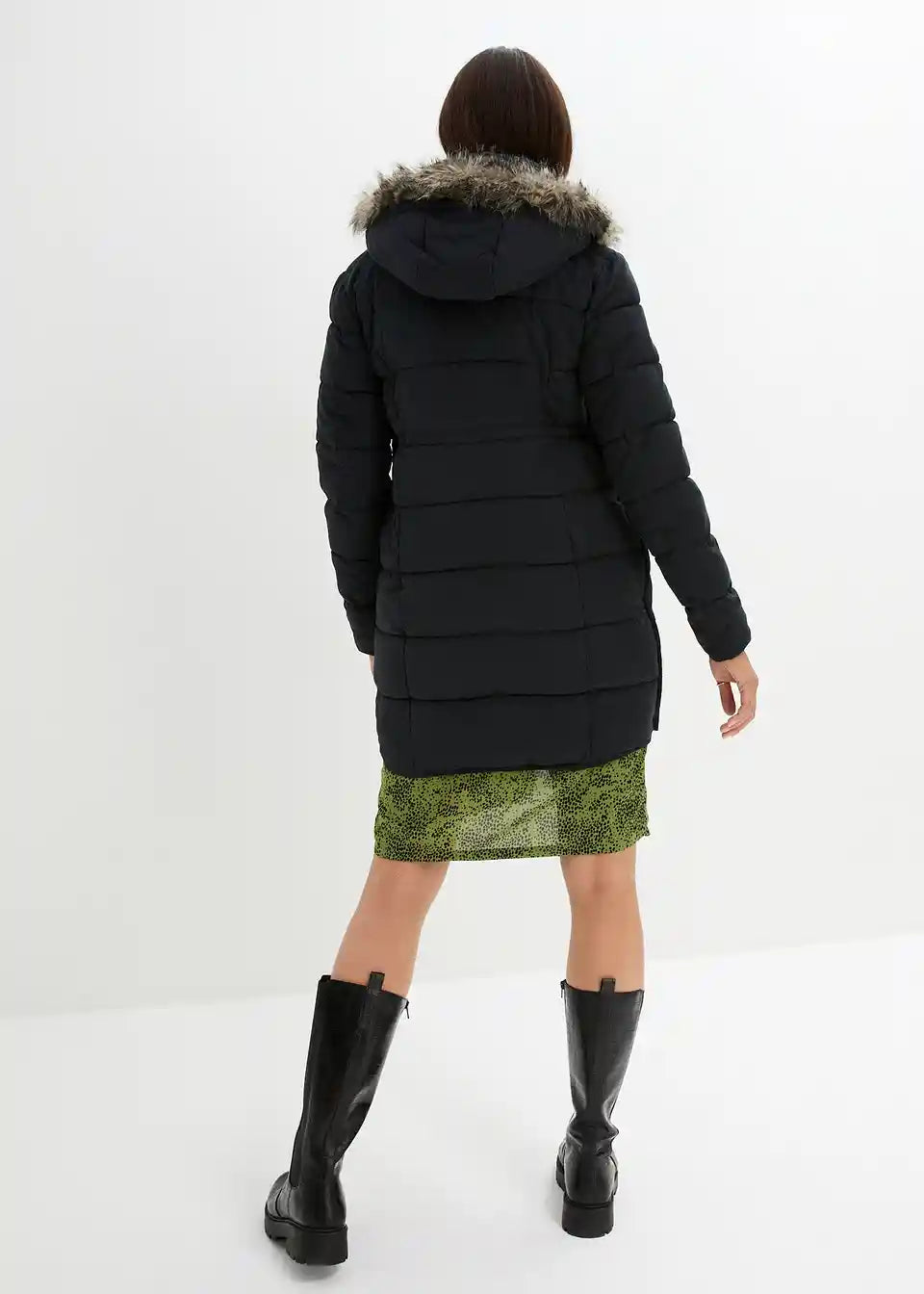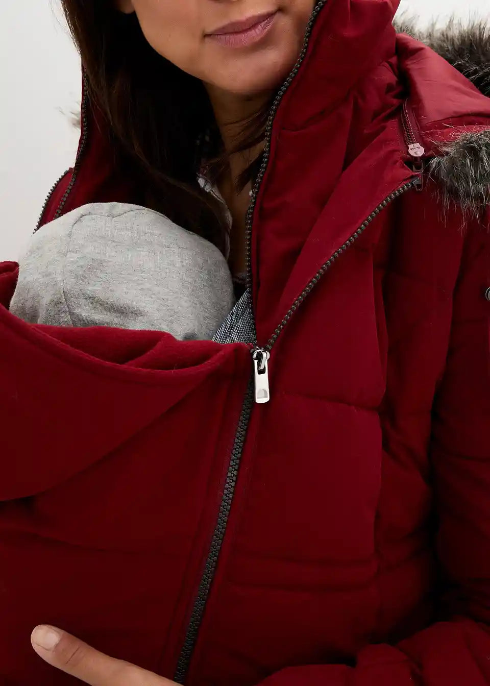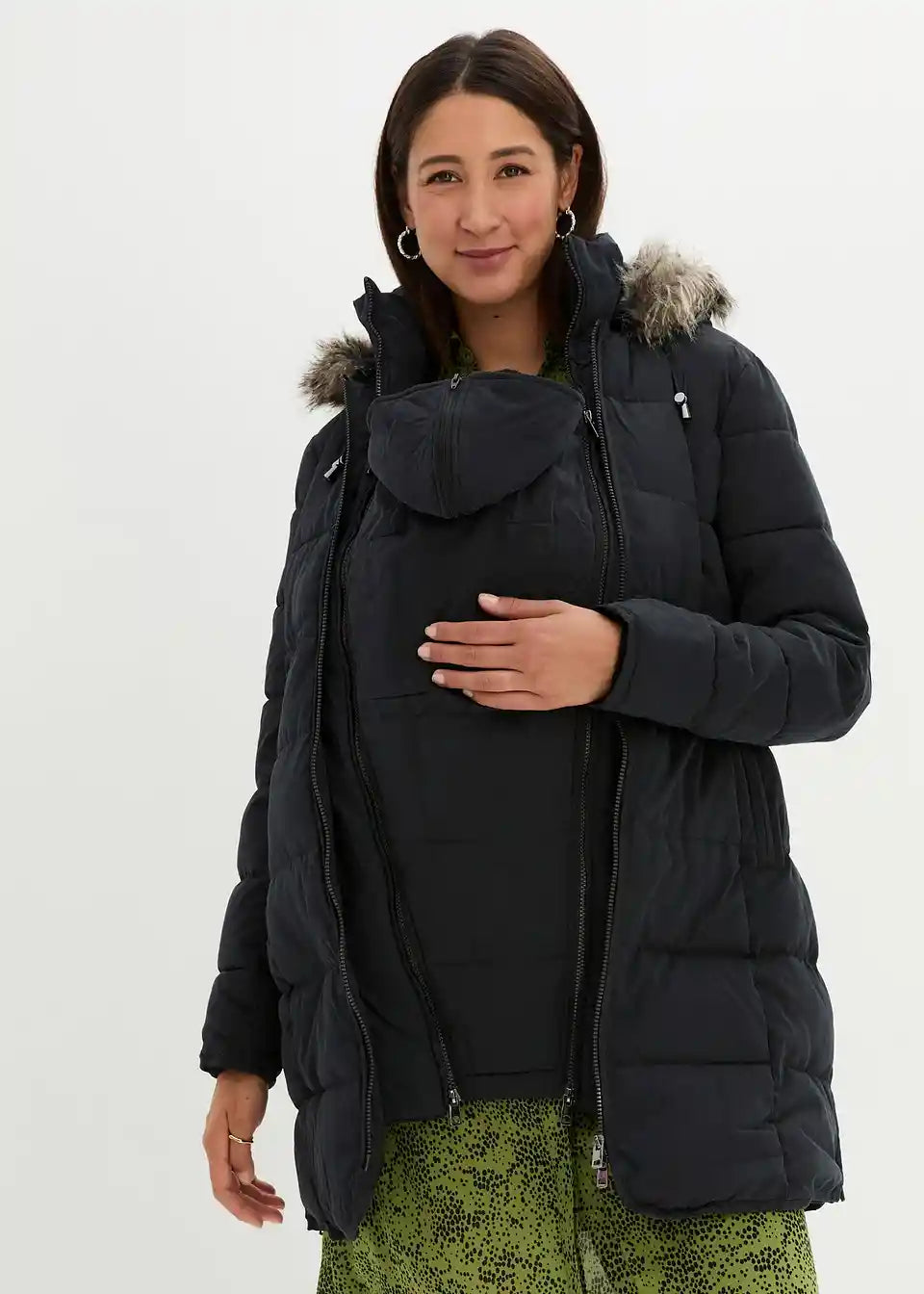 Podložena prešita jakna z dodatkom za nošenje otroka in s stranskimi zadrgami za prilagoditev širine, kar omogoča nošenje med nosečnostjo in po njej. Snemljiva kapuca je opremljena s krznatimi aplikacijami in zategovalnimi trakovi z zaponkami. Dodatek za otroke, praktični žepi z zadrgo in rokavni robovi so podloženi s prijetnim flisom. Notranja prilagoditev pasu omogoča dodatno prilagoditev širine. Z dvosmerno zadrgo.