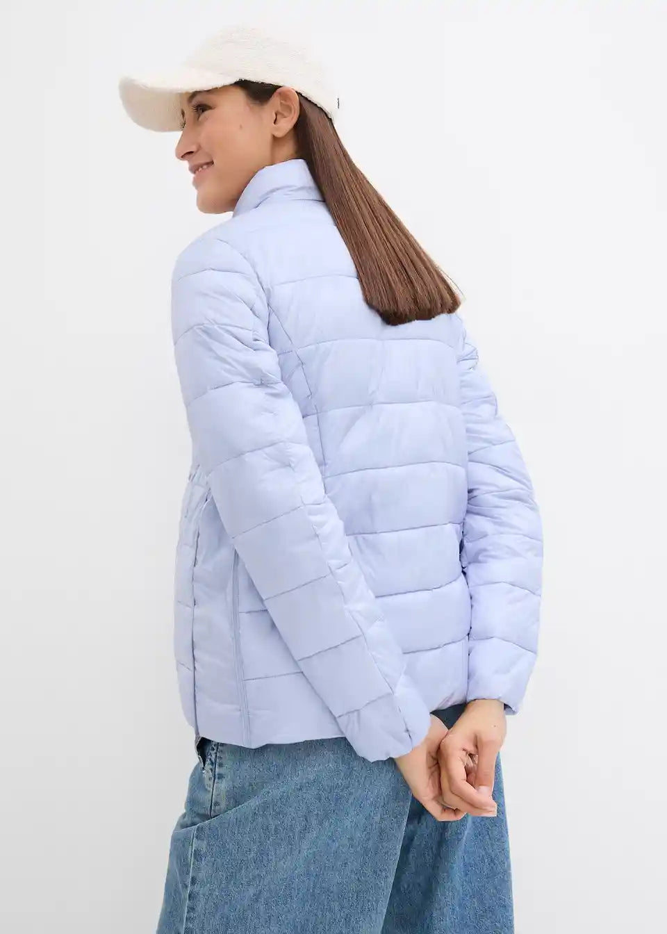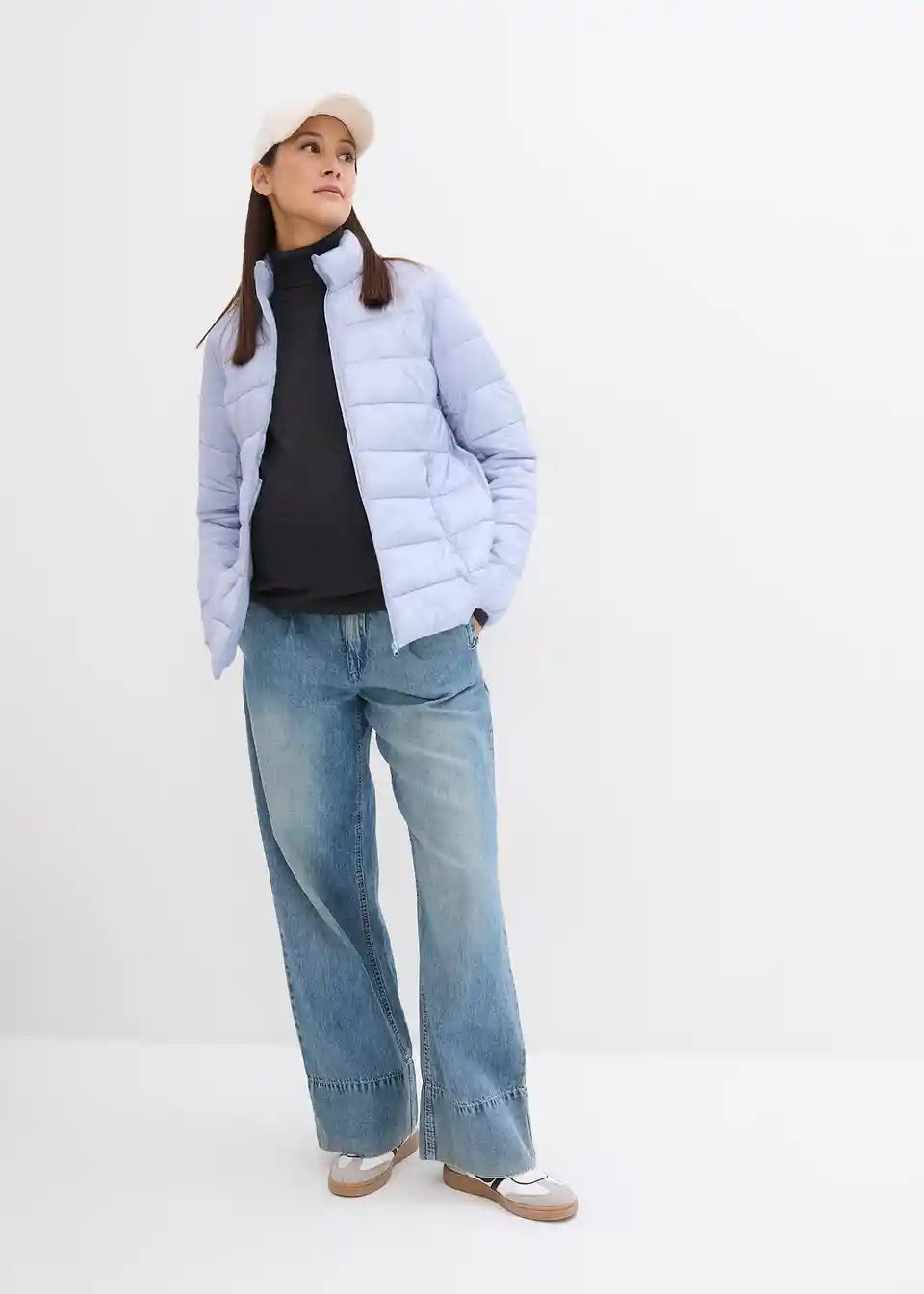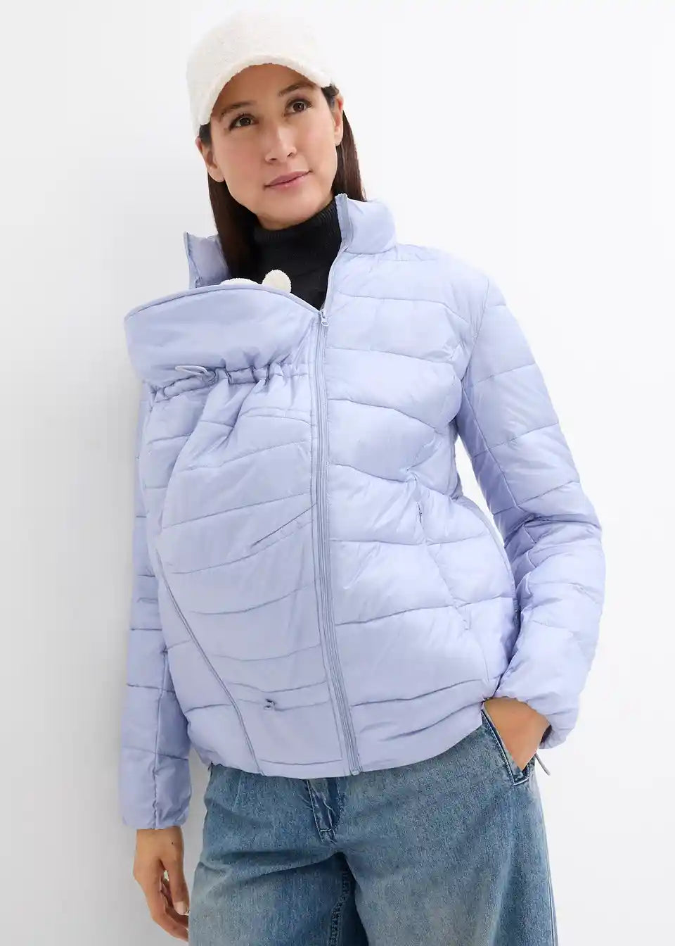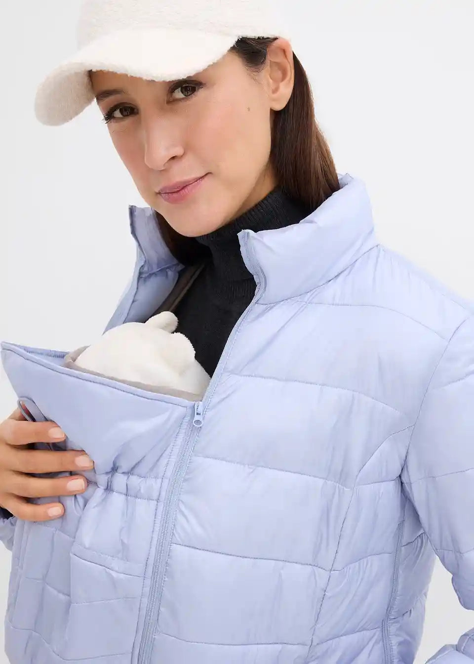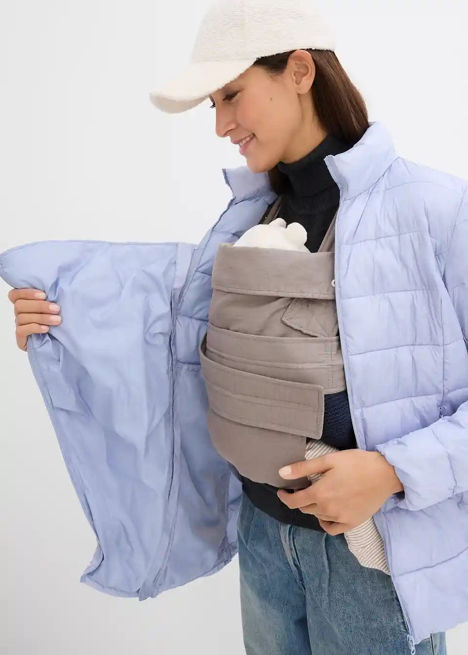 Ultralahka prešita nosečniška jakna z vložkom za nošenje otroka. S stranskimi zadrgami za regulacijo širine, ki omogočajo nošenje tako med kot po nosečnosti. Z zadrgnjenimi žepi. Priložena vrečka omogoča enostavno shranjevanje jakne za nošenje. Tako je stalni spremljevalec, bodisi v otroškem vozičku, previjalni torbi ali nahrbtniku.