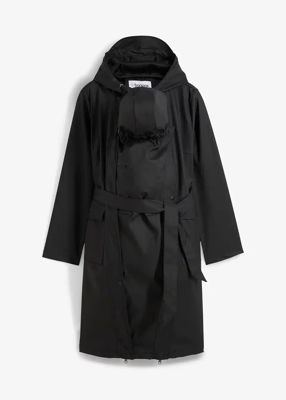 Vetrovno in vodoodporno nosečniško jakno nudi optimalno zaščito v nestanovitnem vremenu, tako za mamo kot dojenčka. Dežni plašč ima dva vstavka: razširitveni vstavek za nosečnost in nosilni vstavek za dojenčka, ki je opremljen z majhno kapuco. Tudi mamica je zaščitena z veliko kapuco. Poleg tega plašč ponuja velike našite žepe in odstranljiv pas za individualno prilagajanje širine. Zračne luknjice pod pazduhami zagotavljajo prijetno prezračevanje.