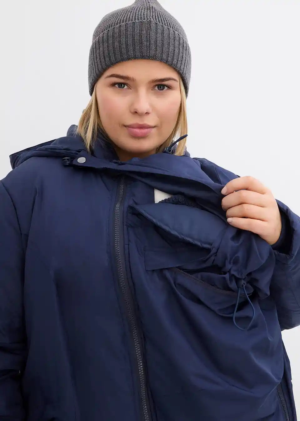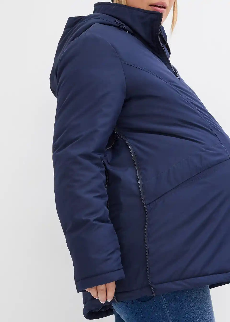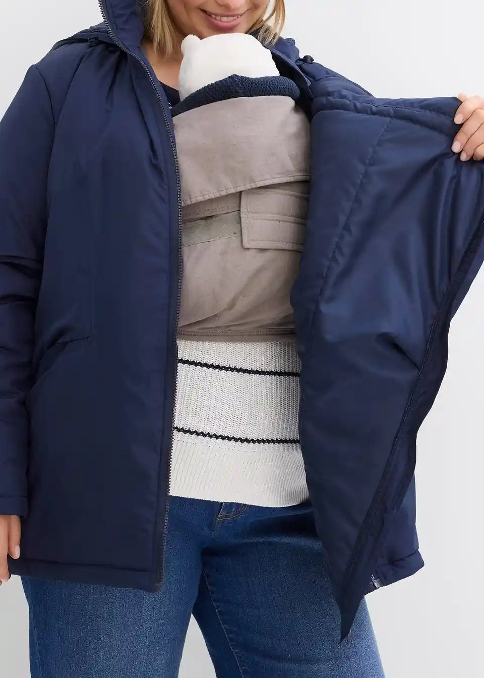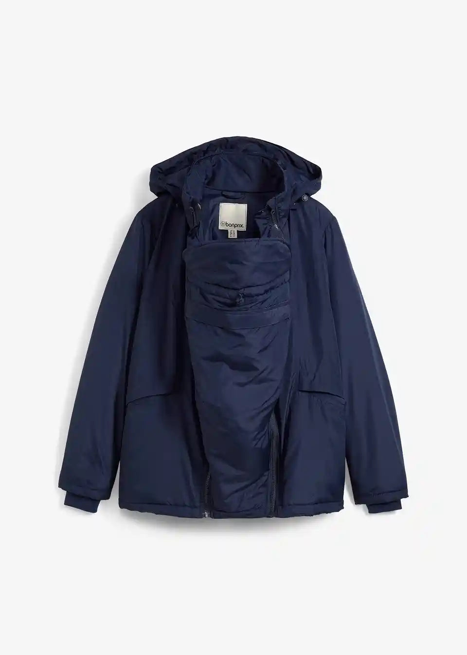 Lahko podložena, dežju in vetru odporna funkcijska jakna z nosilnim vložkom za otroka. Nosilni vložek ima našit žep z zadrgo. V tem žepu se skriva zaščita pred dežjem, soncem oz. vetrom za otroka. Velika kapuca z elastično vrvico in robom proti dežju ščiti mamo pred vetrom in vremenskimi razmerami. Jakna ima stranske zadrge za prilagoditev širine, ki omogočajo nošenje tako med nosečnostjo kot po njej. S praktičnimi žepi na zadrgo.