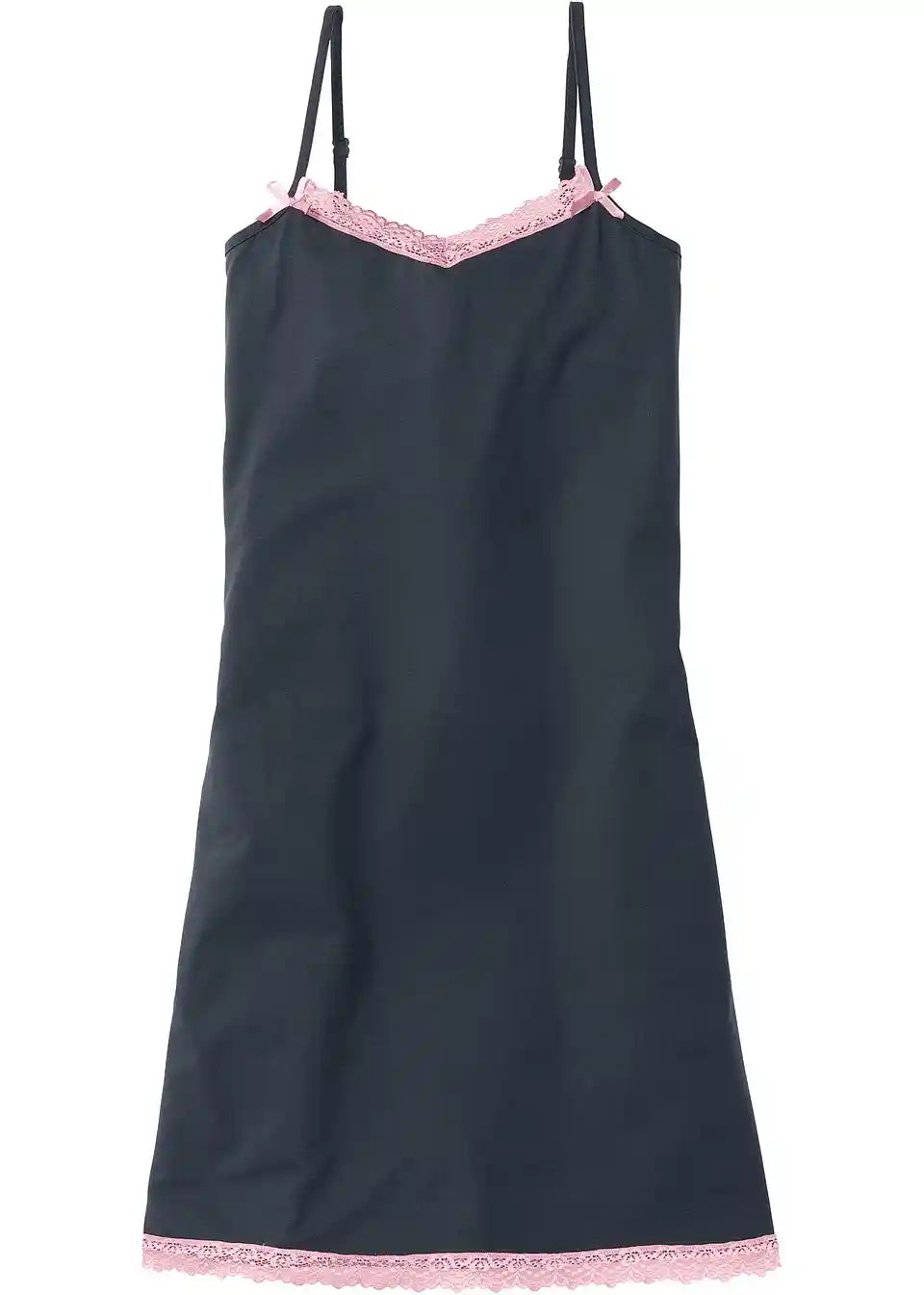Ta nočna srajca daje ženskam lahkoten in sproščen občutek med nošenjem: odlikuje jo ohlapen kroj. Fina čipkasta obroba v kontrastni barvi krasi rob in dekolte modela. Dva simpatična lokca dopolnjujeta eleganten videz. Ozke spaghetti naramnice so individualno nastavljive.
