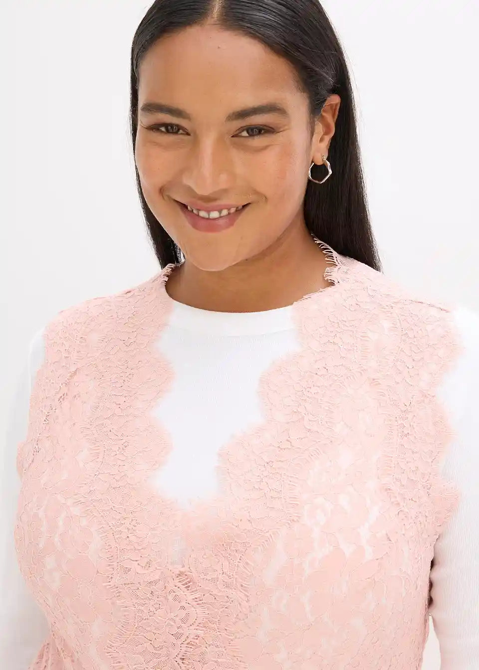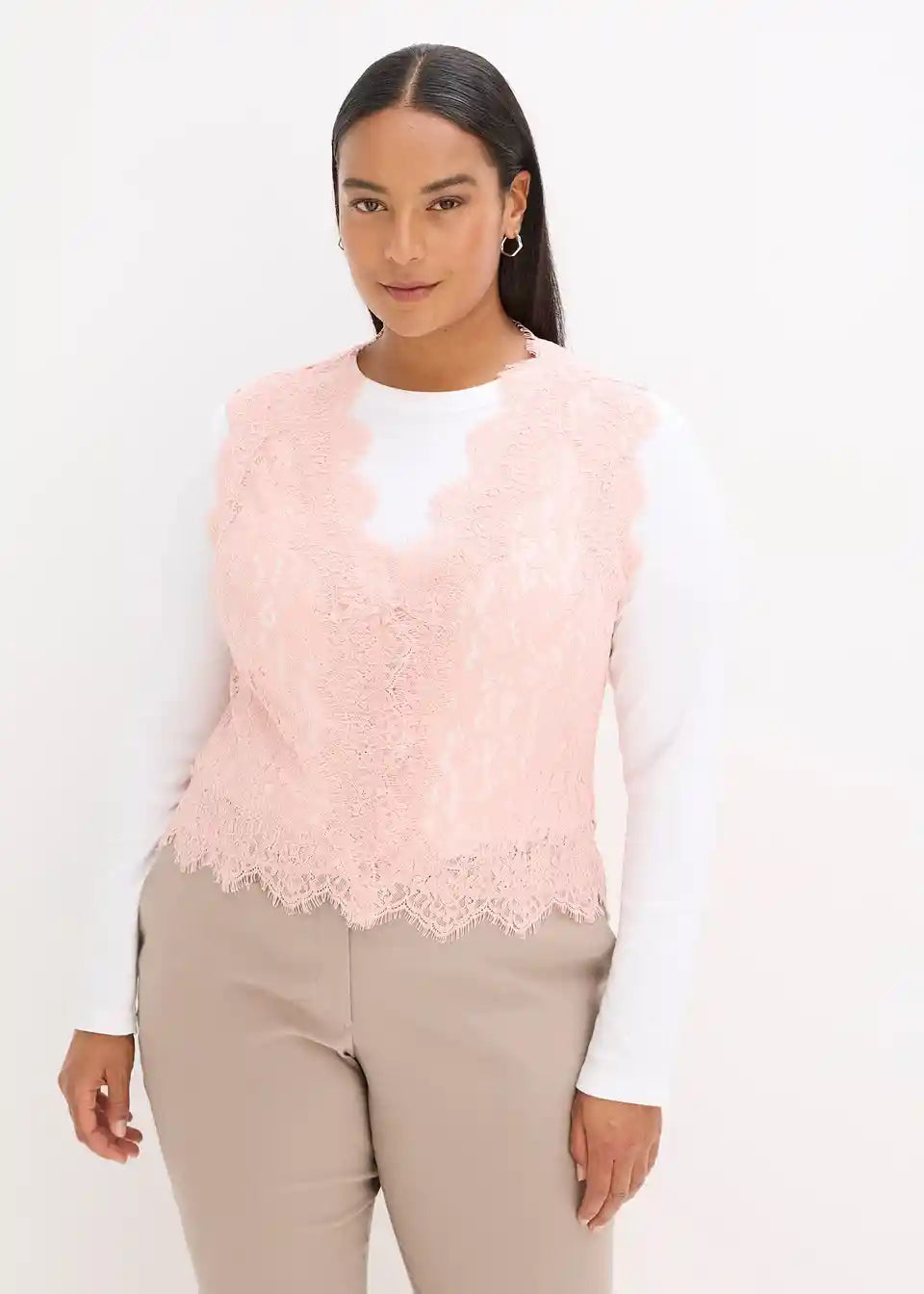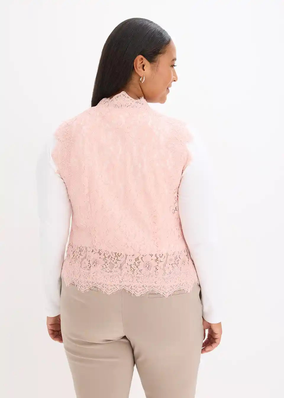 <V kombinaciji z bluzo ali preprosto majico z dolgimi rokavi ustvari ta eleganten čipkast telovnik prefinjen videz.