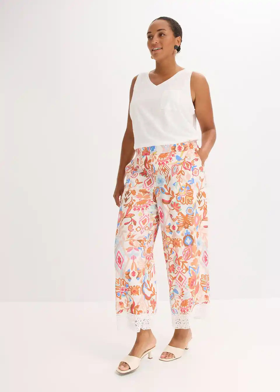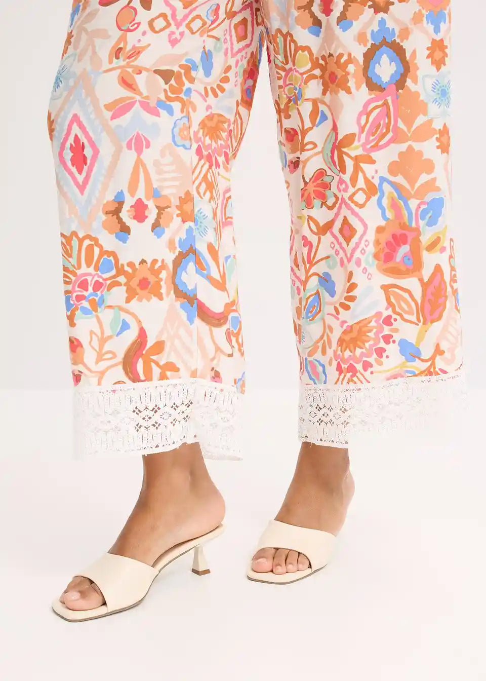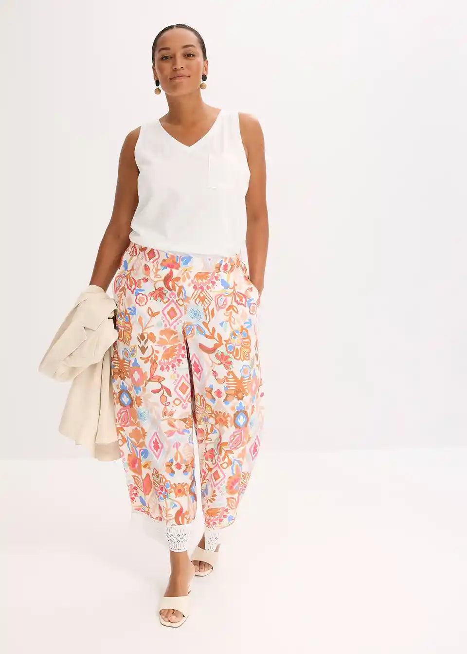 poletne, ohlapno krojene hlače z udobnim elastičnim pasom in kvačkano čipko na robu
