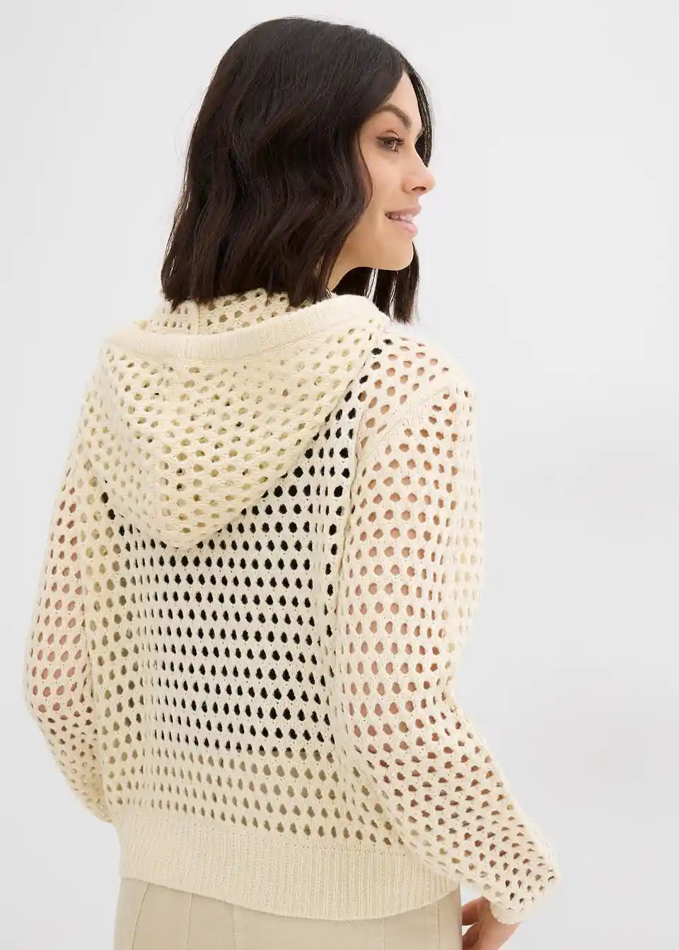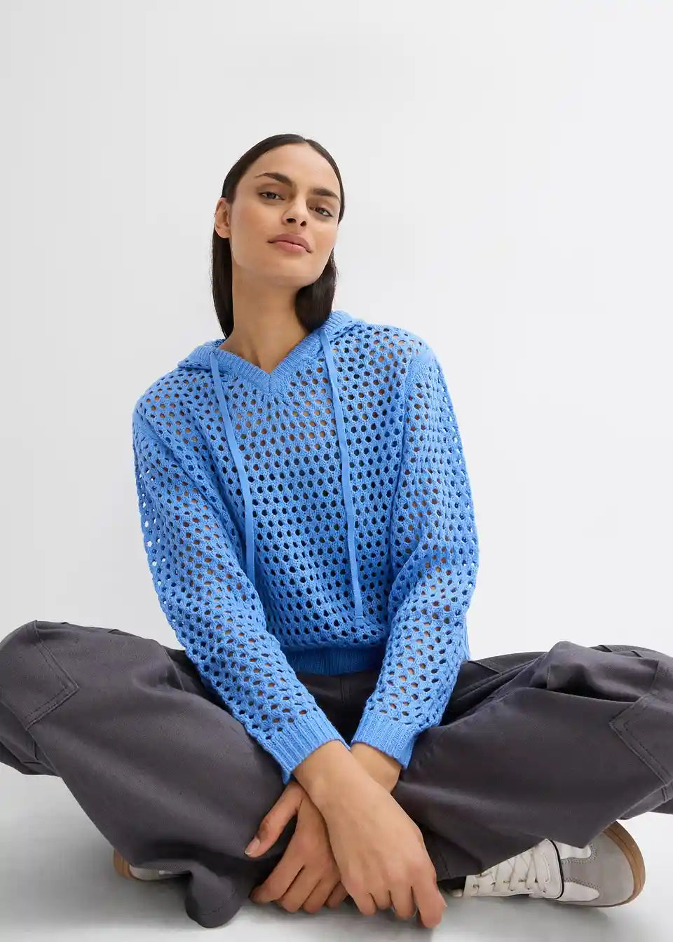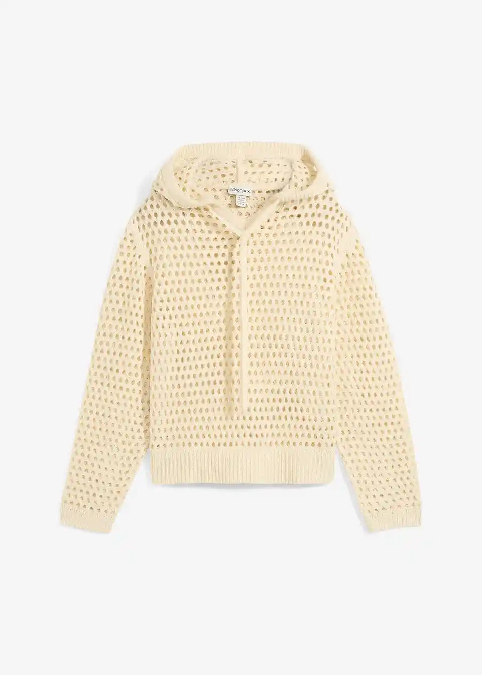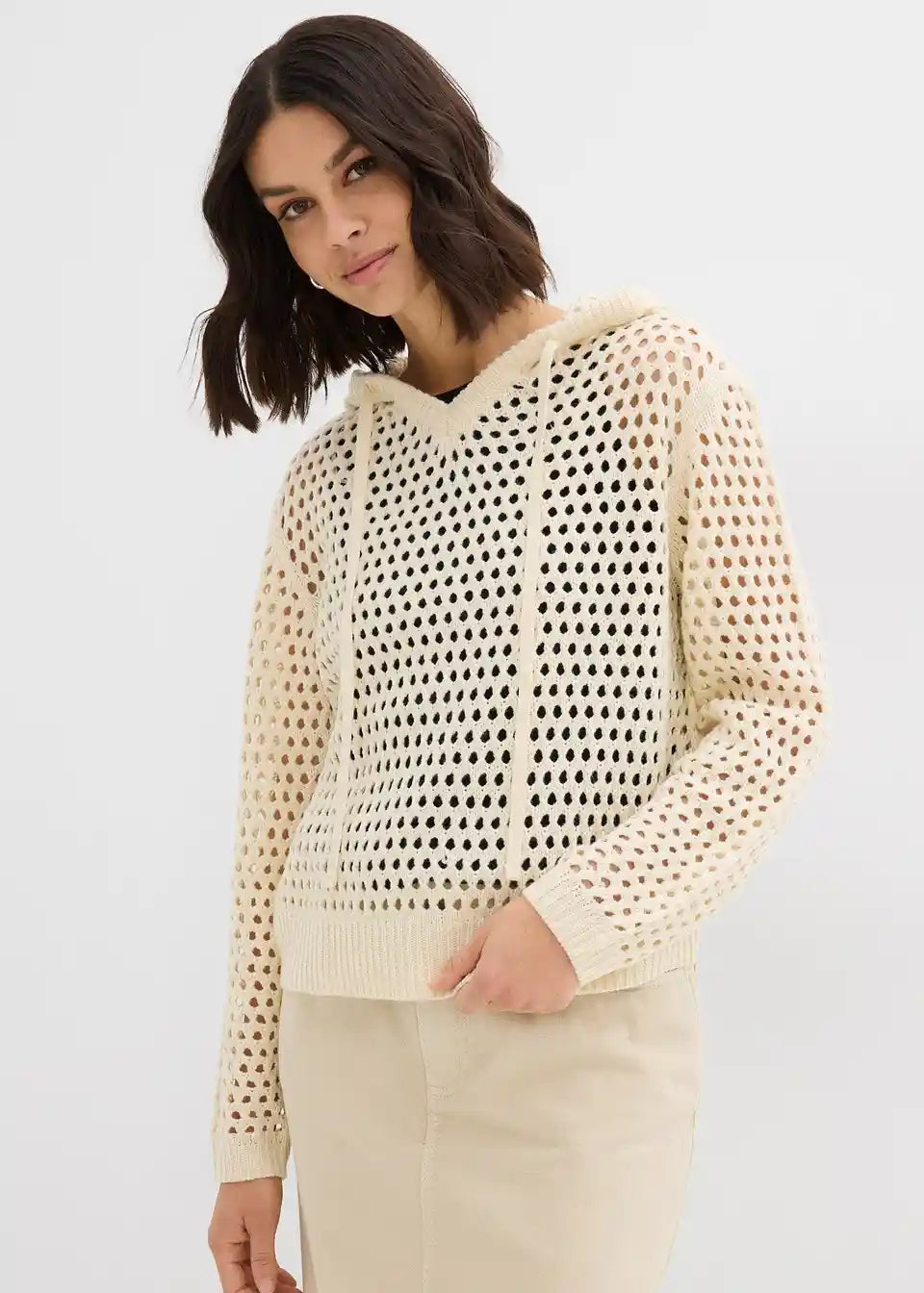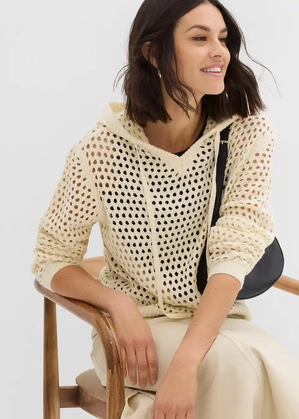 Ležeren Ajour-pulover s kapuco in luknjičastim vzorcem