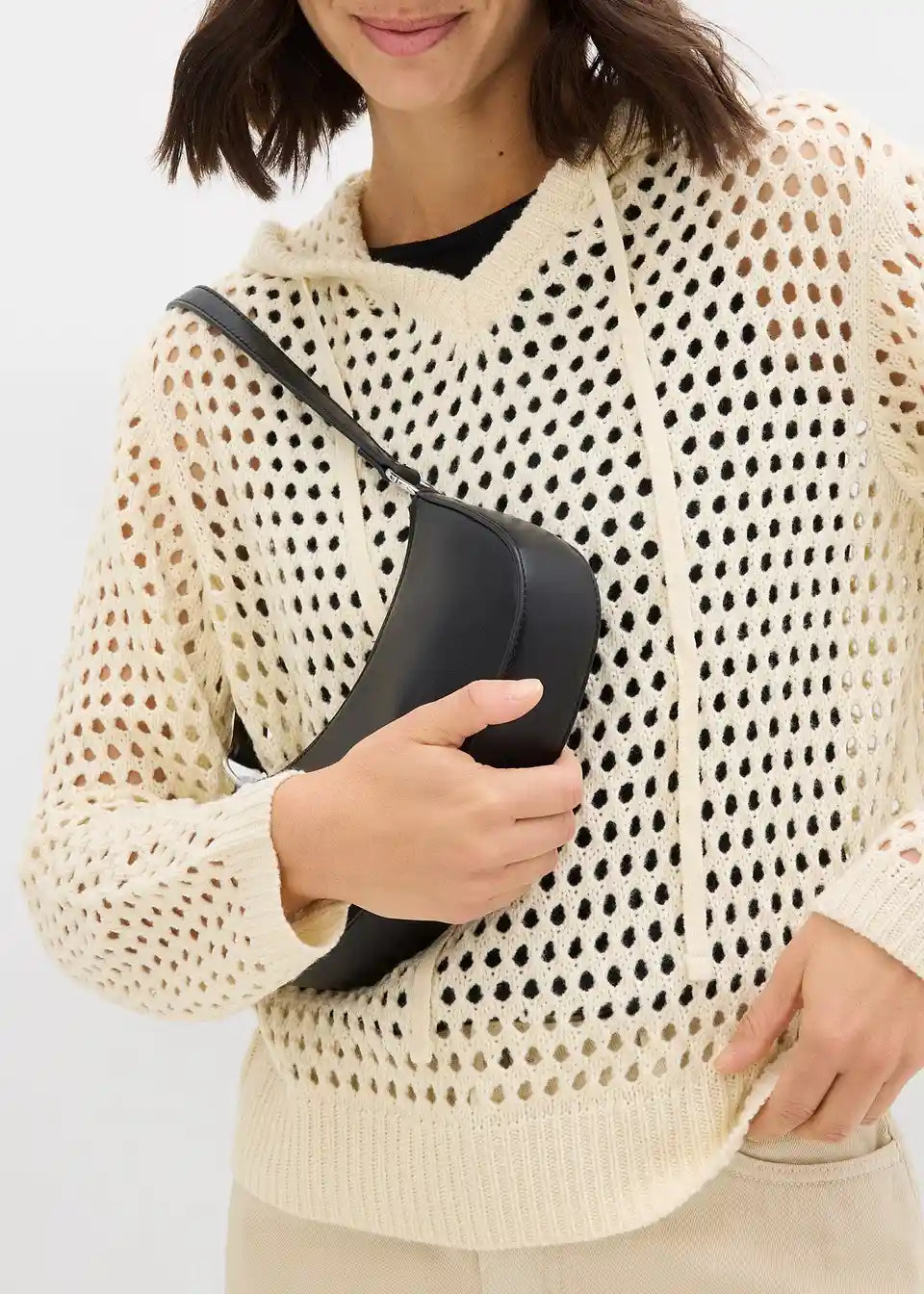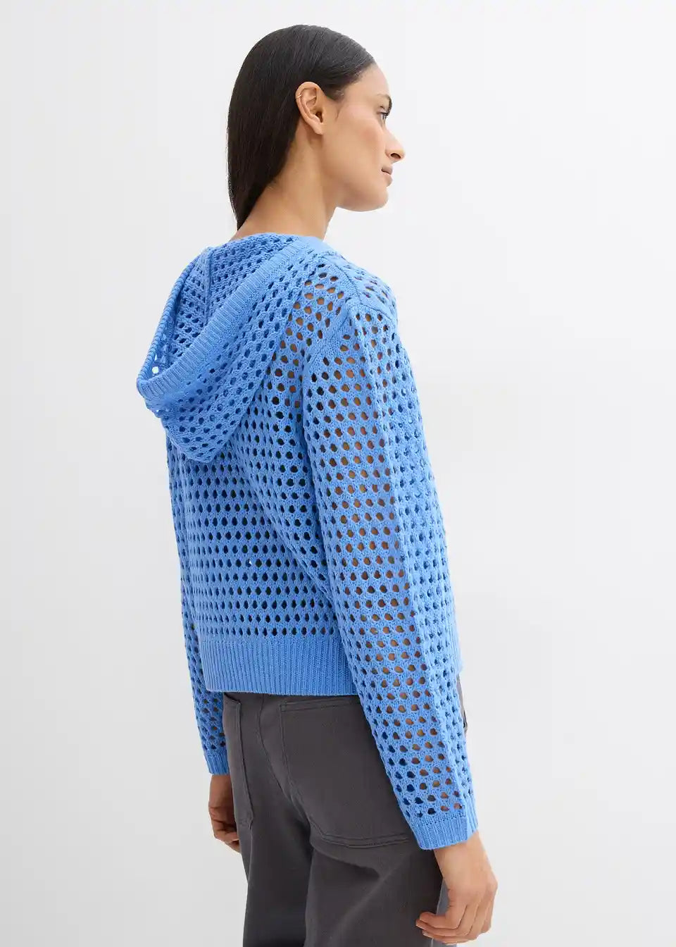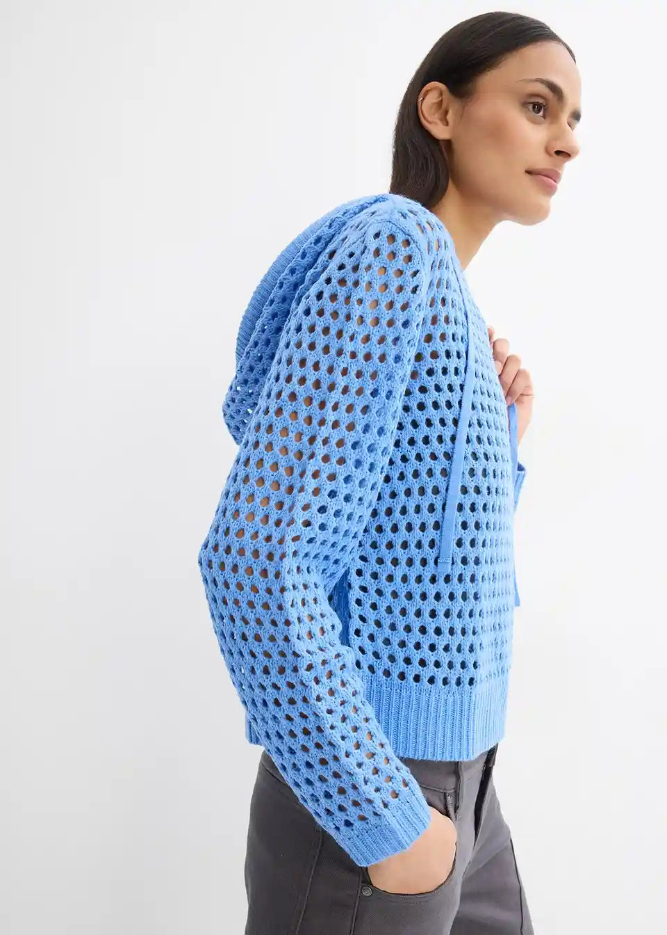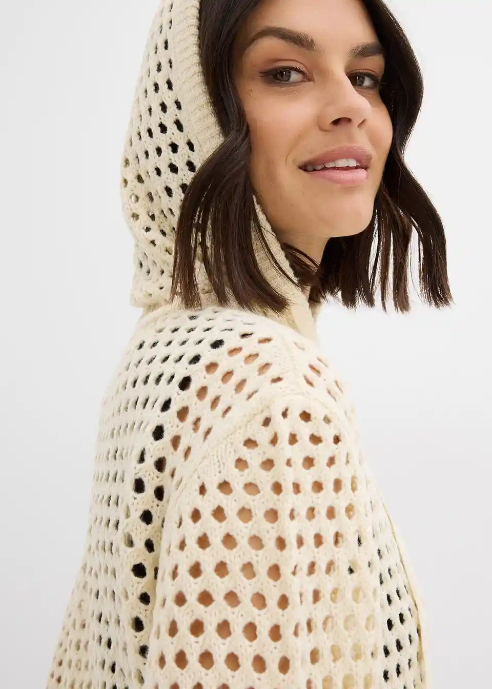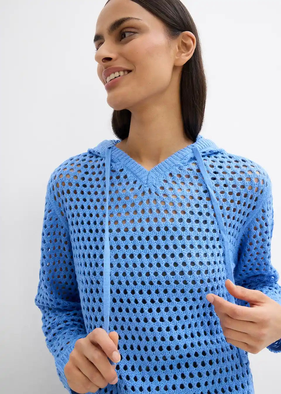 Ležeren Ajour-pulover s kapuco in luknjičastim vzorcem