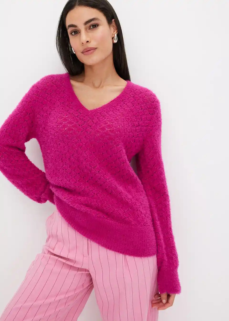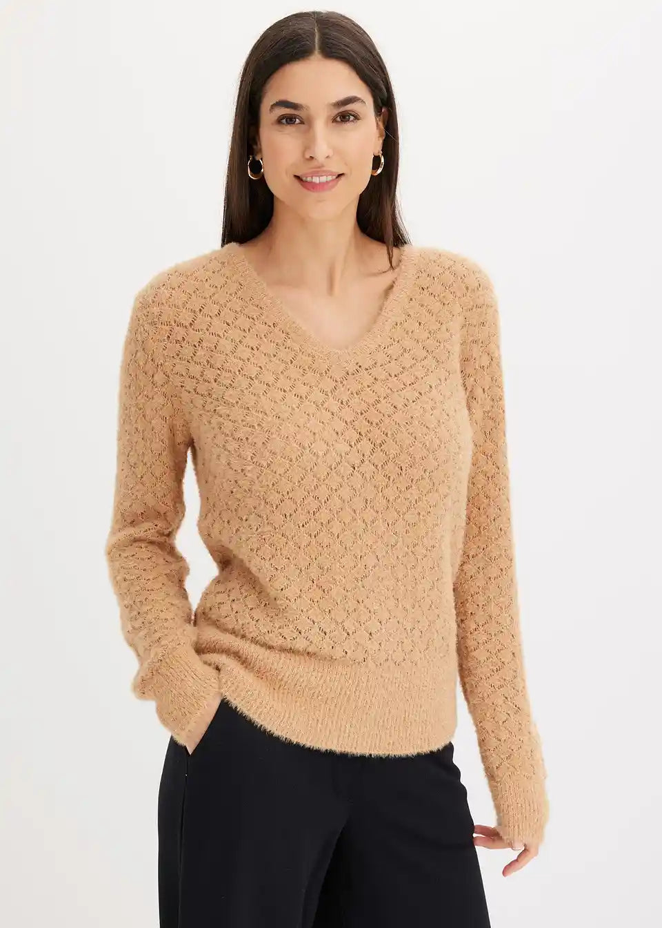 Eleganten ajour-pulover z ovitim videzom in perjastim prejo