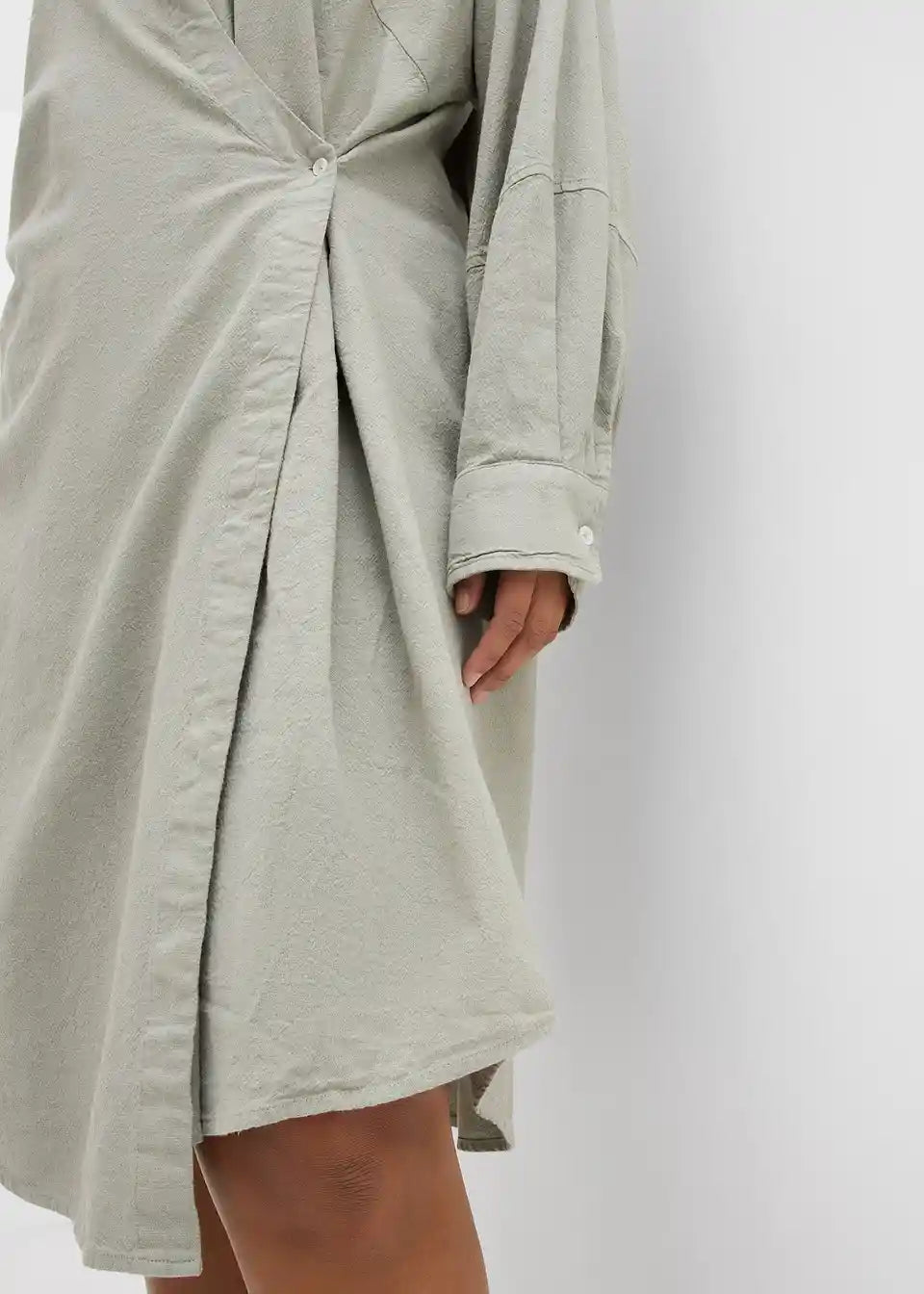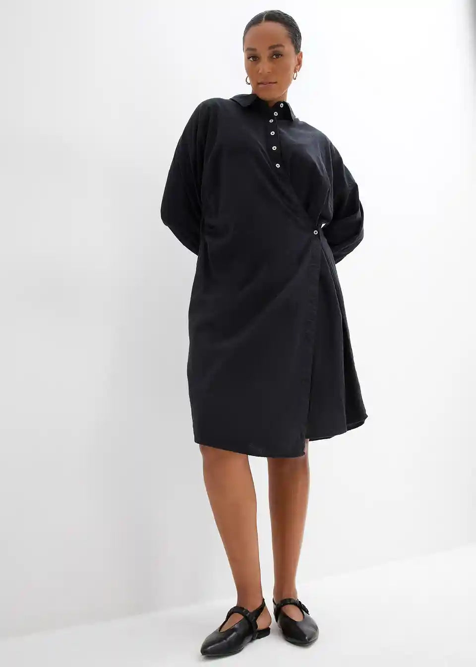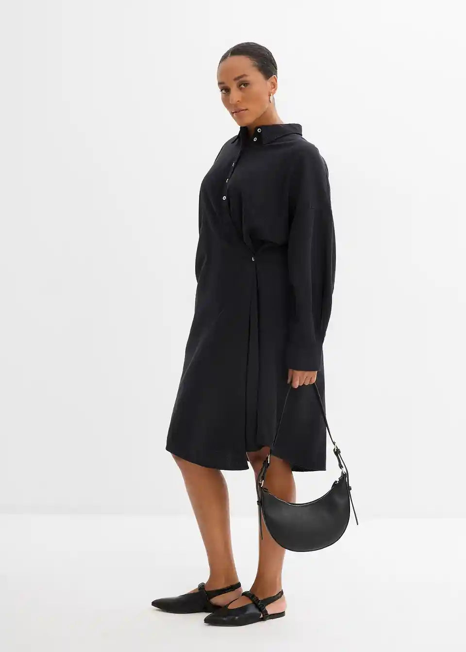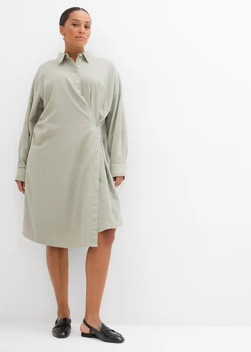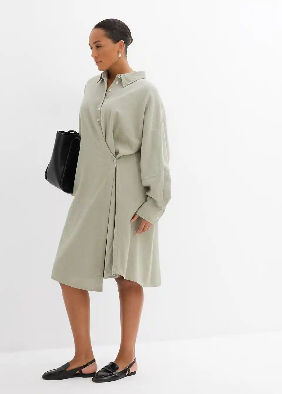 Srajčna obleka srednje dolžine z asimetričnim sprednjim delom za preklop in tankim zavezovalnim trakom na zunanji strani