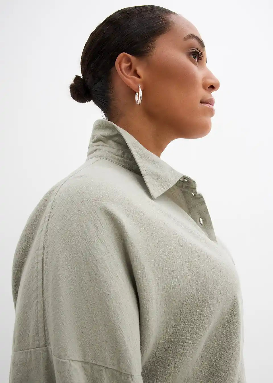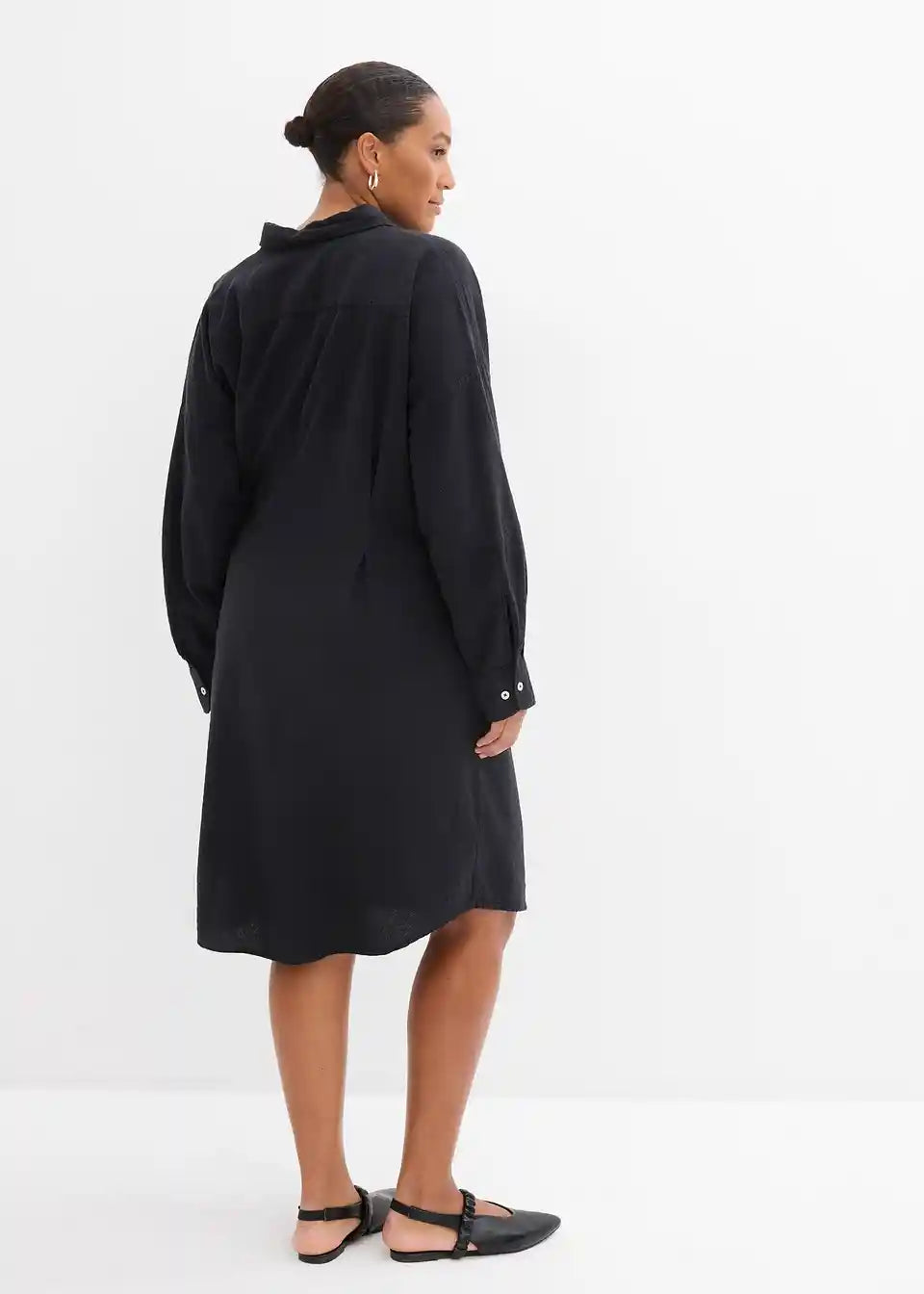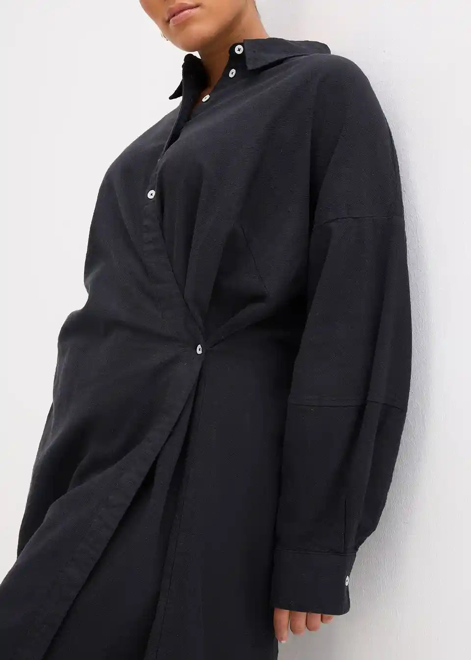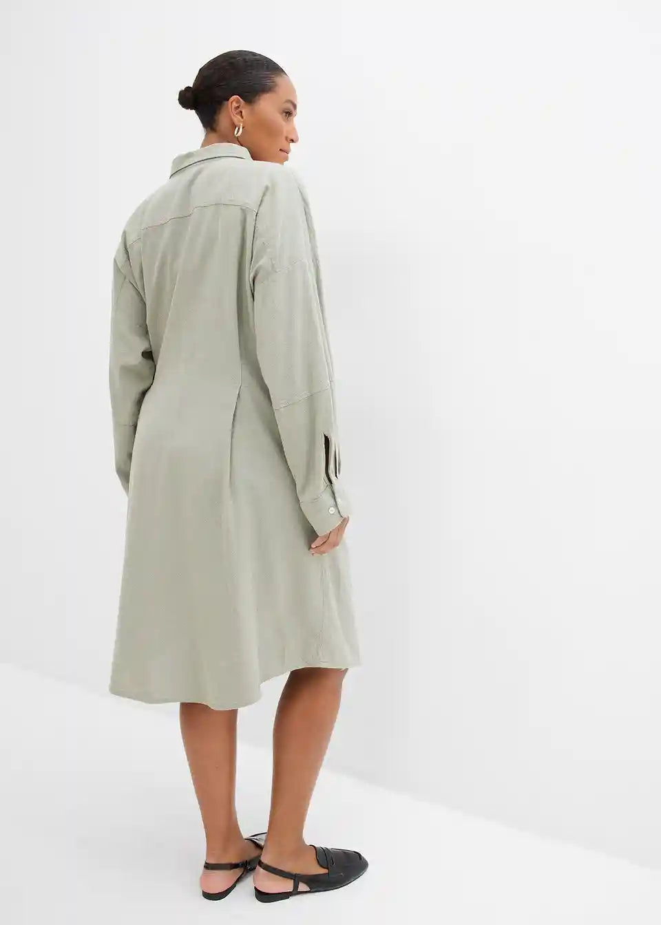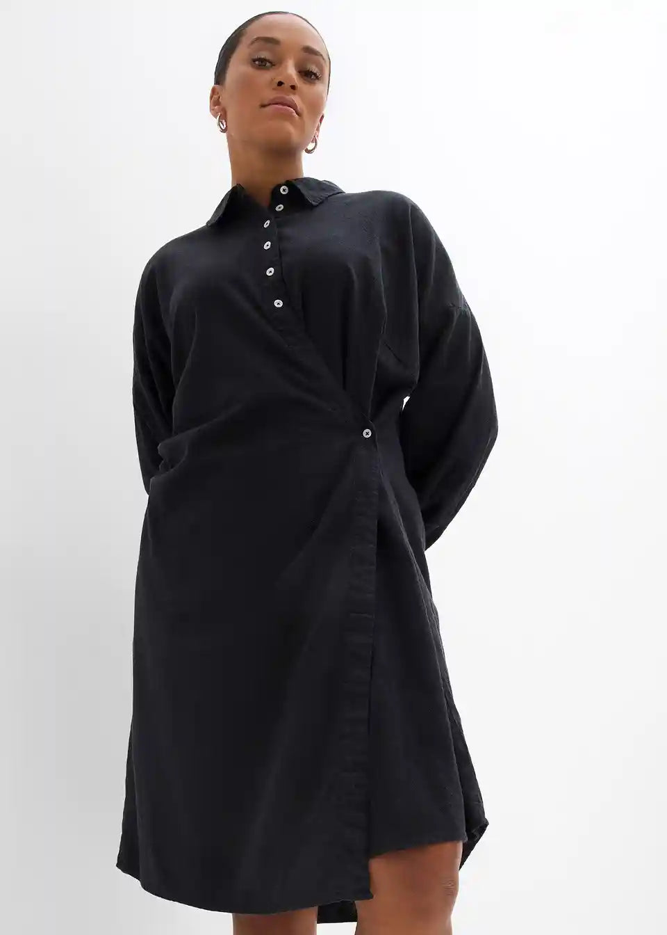 Srajčna obleka srednje dolžine z asimetričnim sprednjim delom za preklop in tankim zavezovalnim trakom na zunanji strani