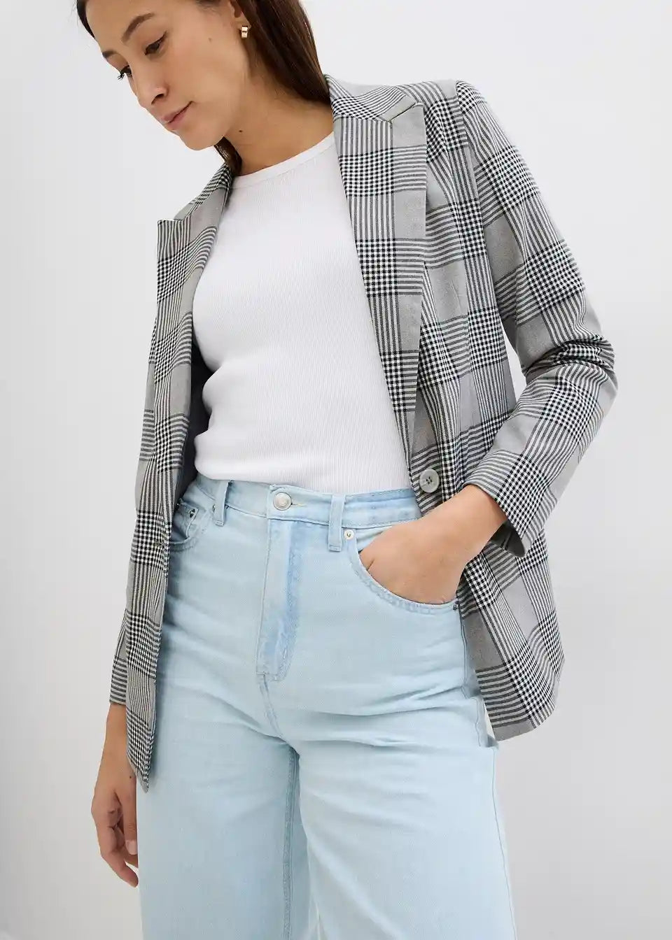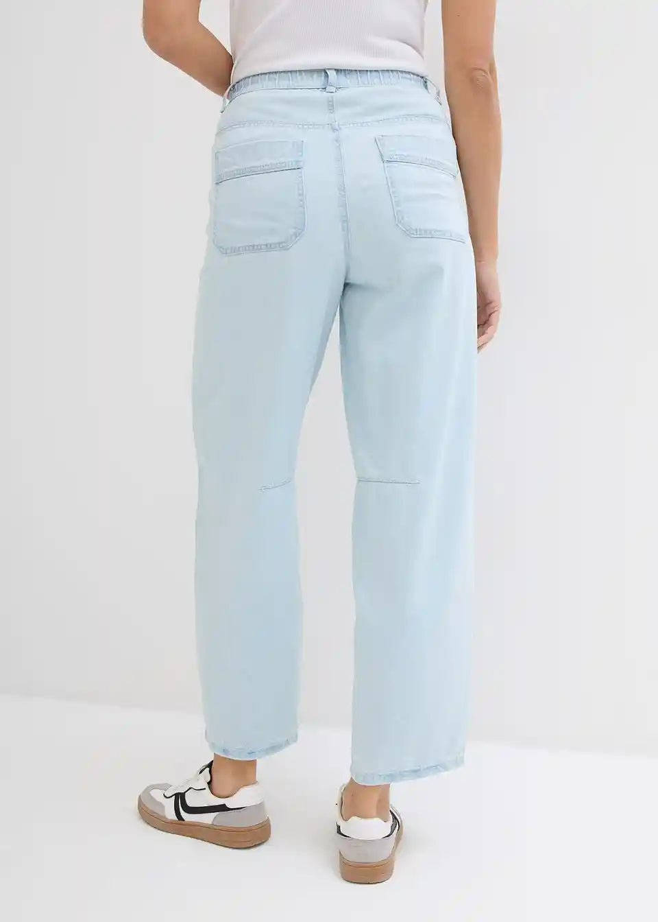 5-žepne jeans hlače iz izjemno mehke, peresno lahke džins tkanine. Ohlapno prileganje z voluminoznimi, zaobljenimi hlačnicami od bokov do stegen in zožano linijo navzdol. Visok pas z elastičnim udobnim pasom zadaj in skrajšana dolžina hlačnic. Notranja dolžina hlačnic v velikosti 42 cca 69,5 cm, primerno za pranje v pralnem stroju