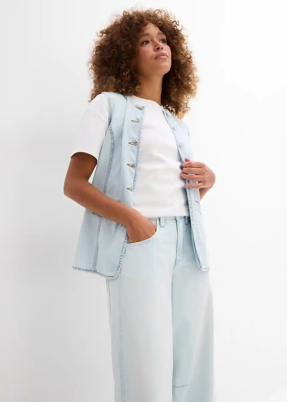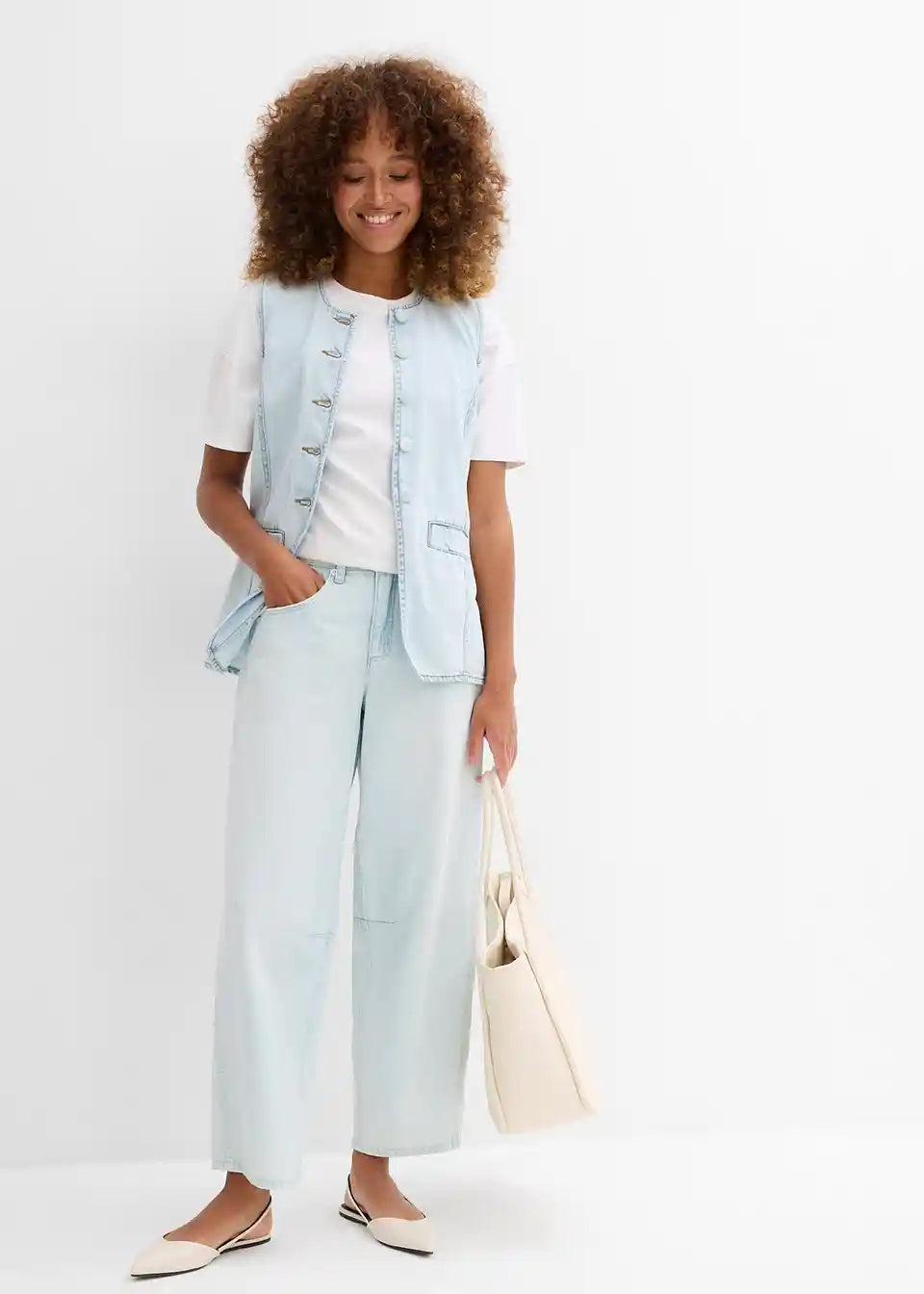 5-žepne jeans hlače iz izredno lahkega low stretch denima. Sproščen kroj z voluminozno, zaobljeno hlačnico od bokov do stegen in ožjim zaključkom spodaj. Srednje visok pas in skrajšana dolžina hlačnic. Dolžina notranjega šiva pri velikosti 42 cca 70,5 cm, primerno za strojno pranje.