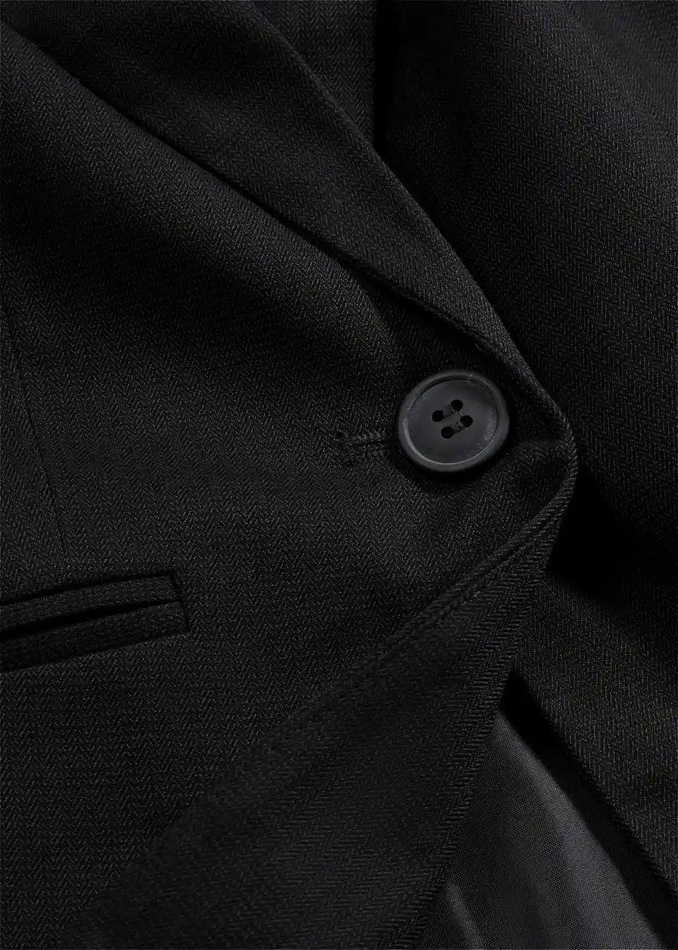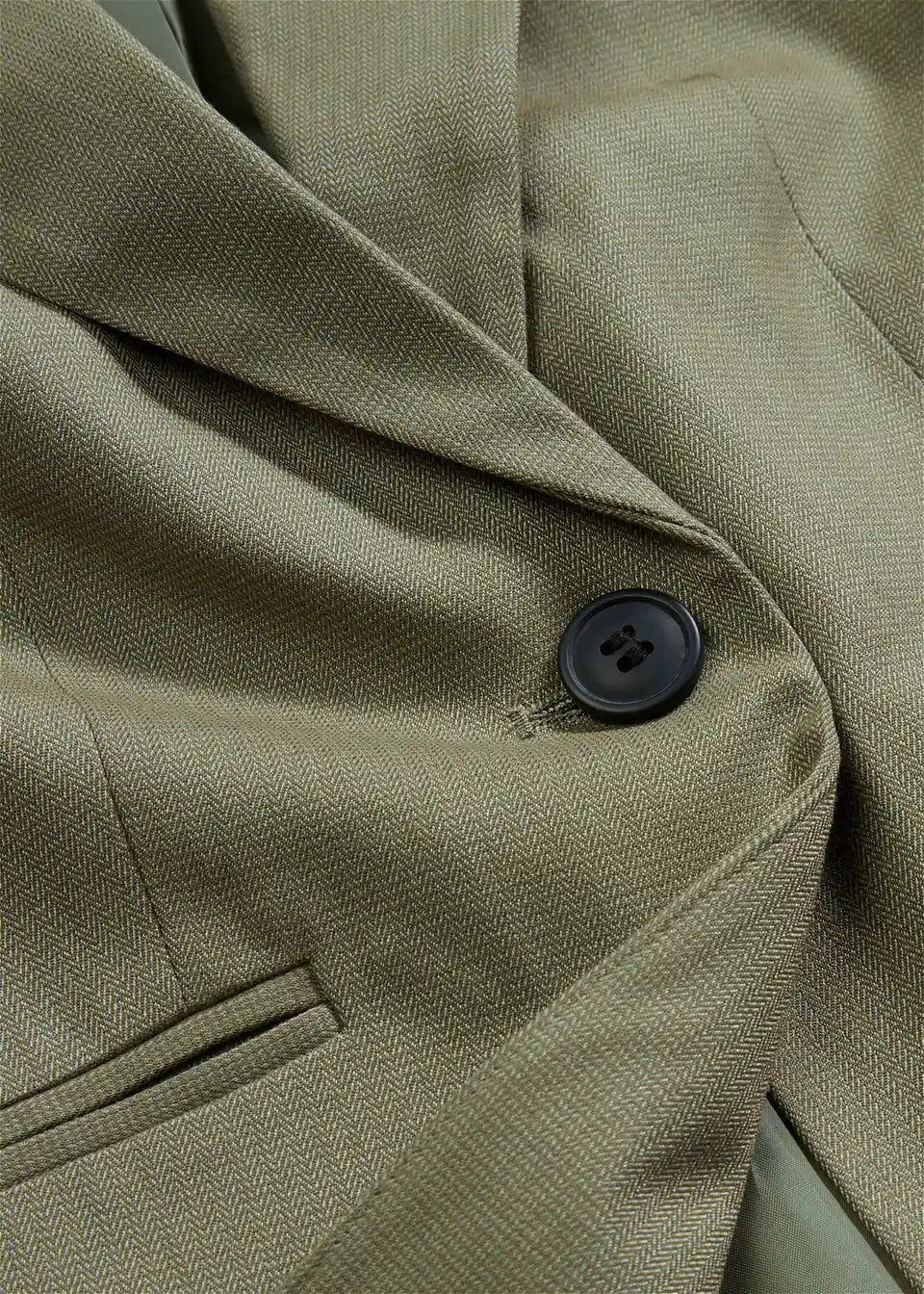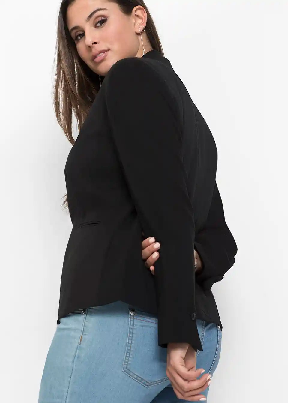 Blazer s paspuliranimi žepi v oprijetem kroju. Oba rokava sta zaključena z gumbom. Dolžina pri vel. 38 pribl. 58 cm.
