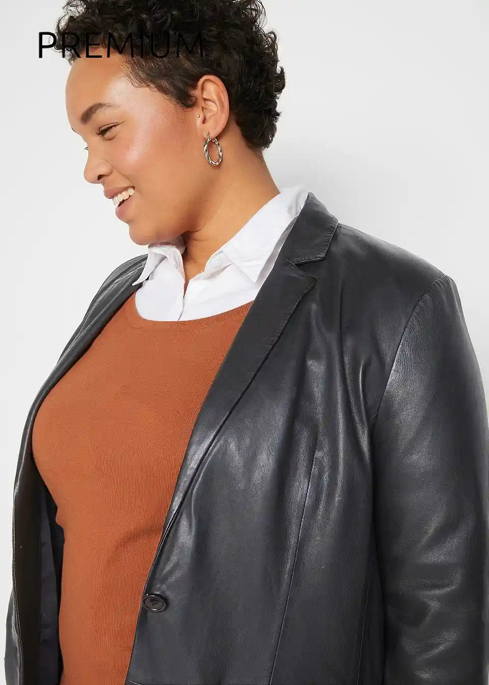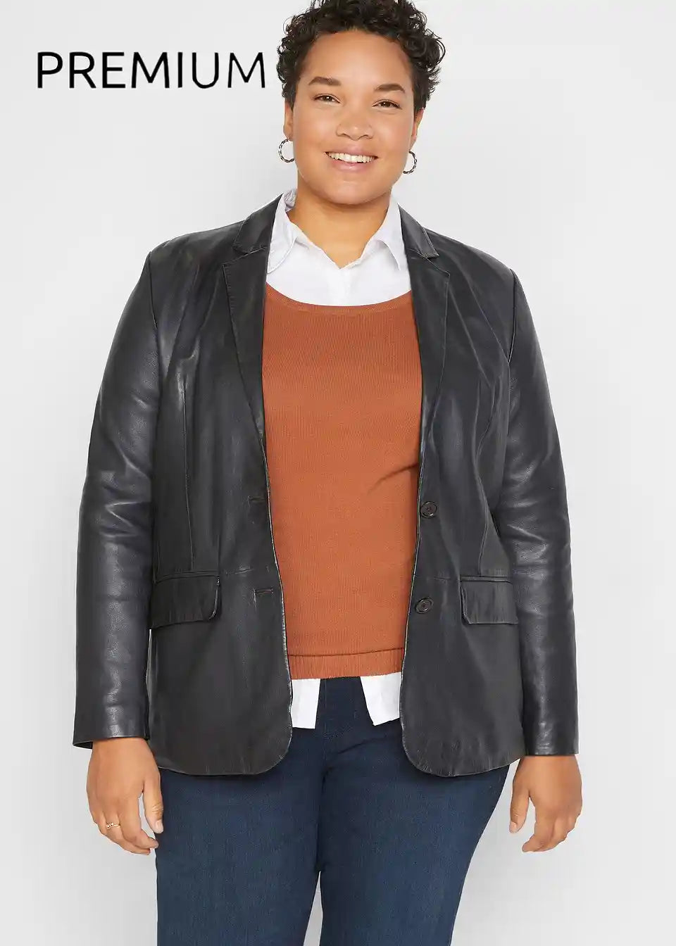 Modni usnjeni blazer iz jagenjčkovega napa usnja s poklopnimi žepi, vsestransko kombiniran.
