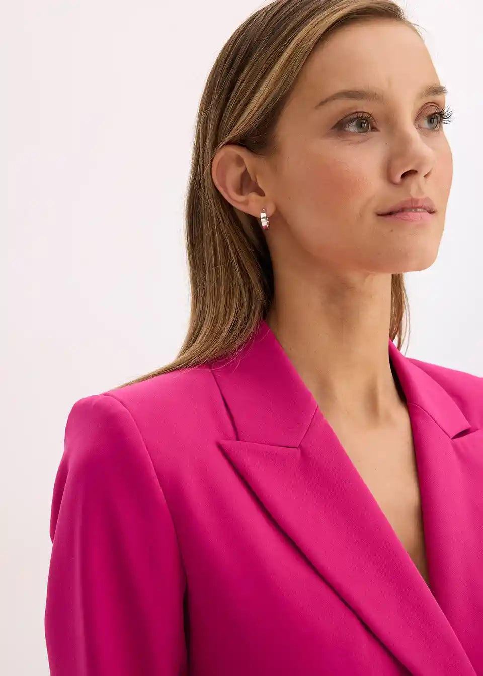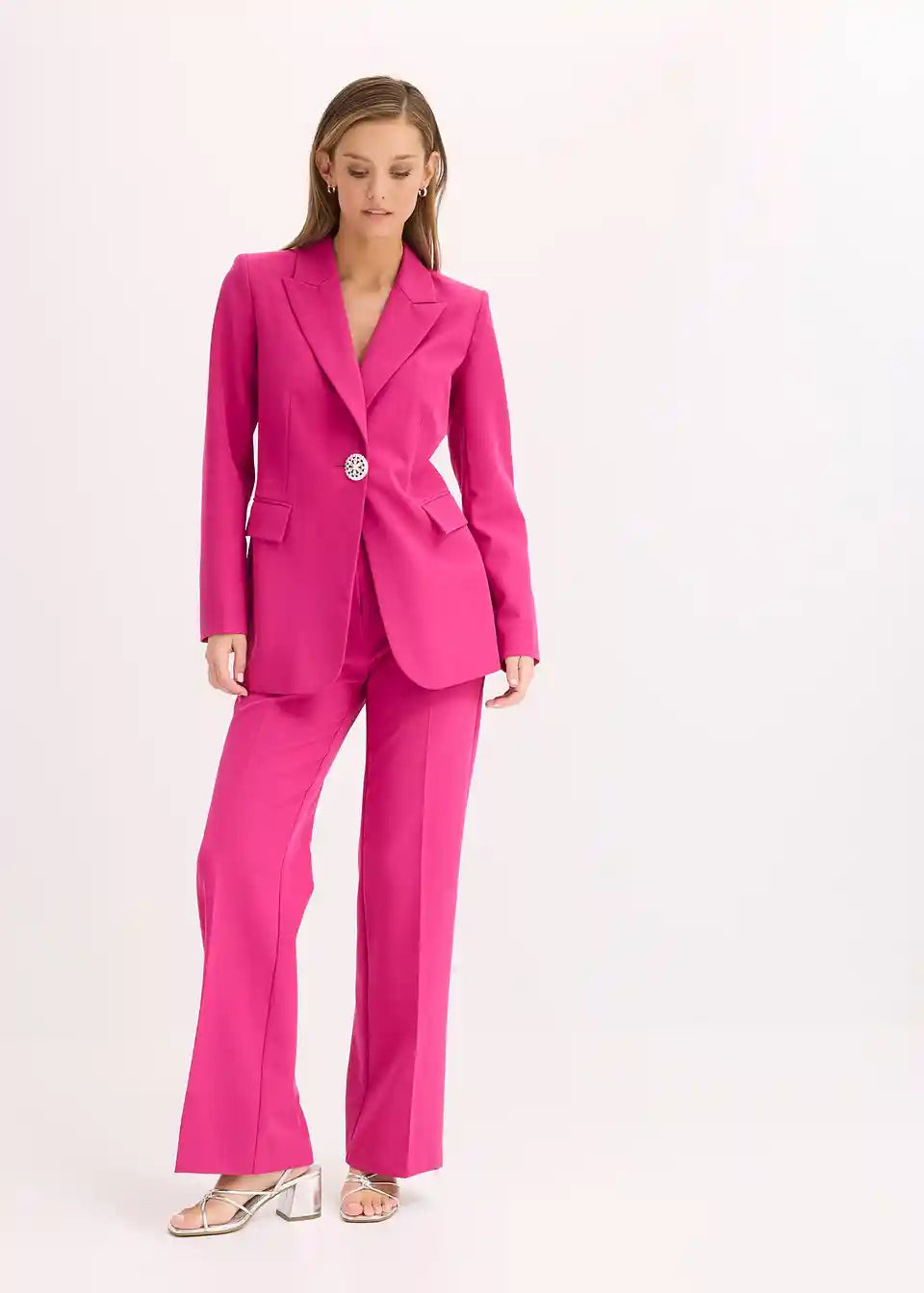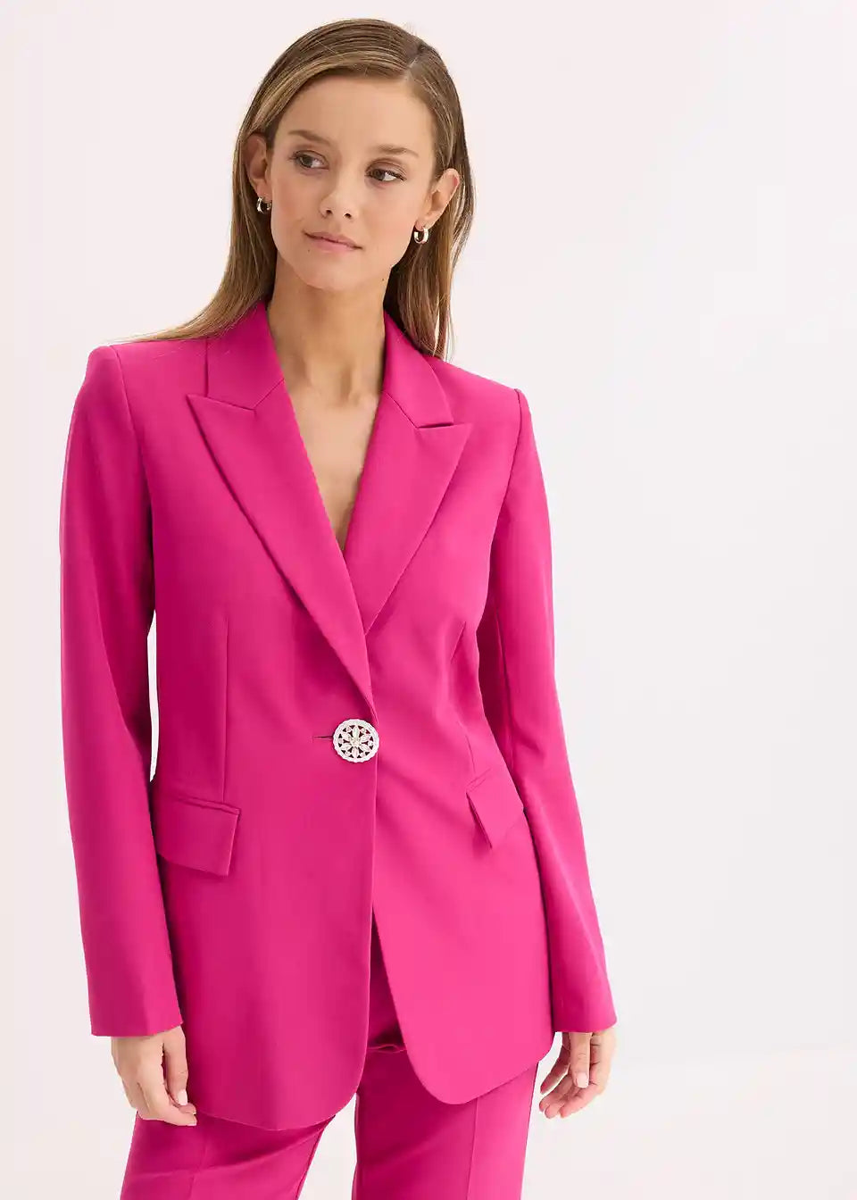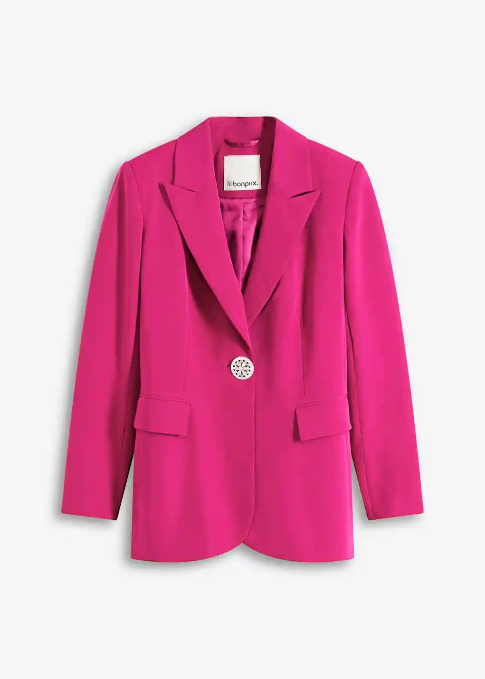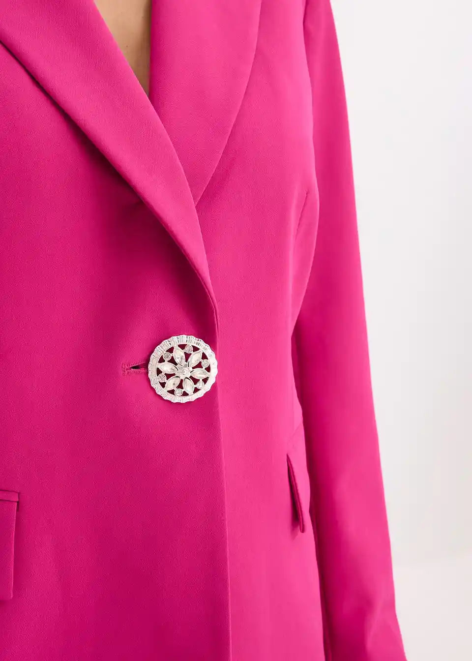 Moderen in ženstven: Blazer z rahlo oprijetim krojem in okrasnim gumbom z okrasnimi kamenčki