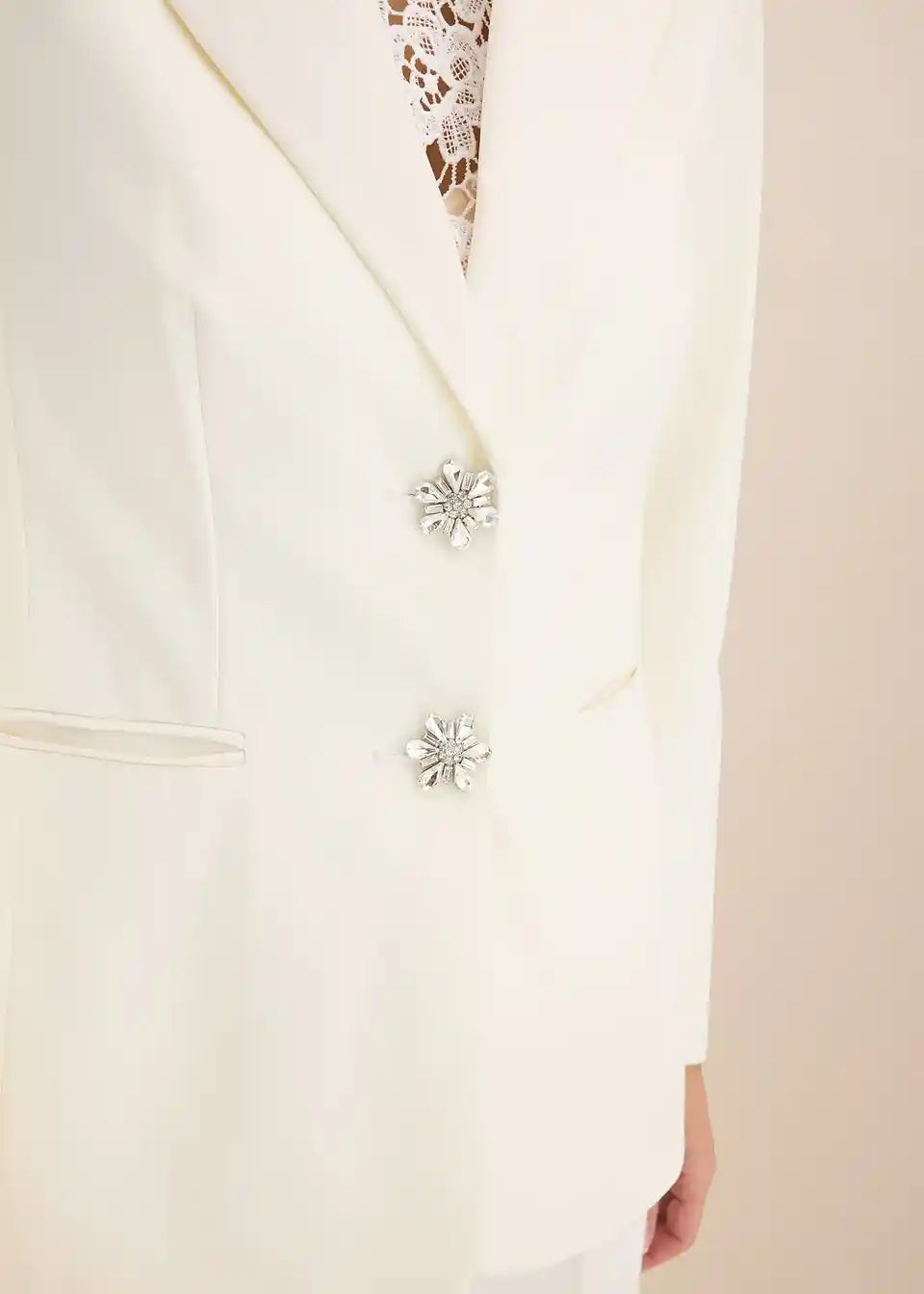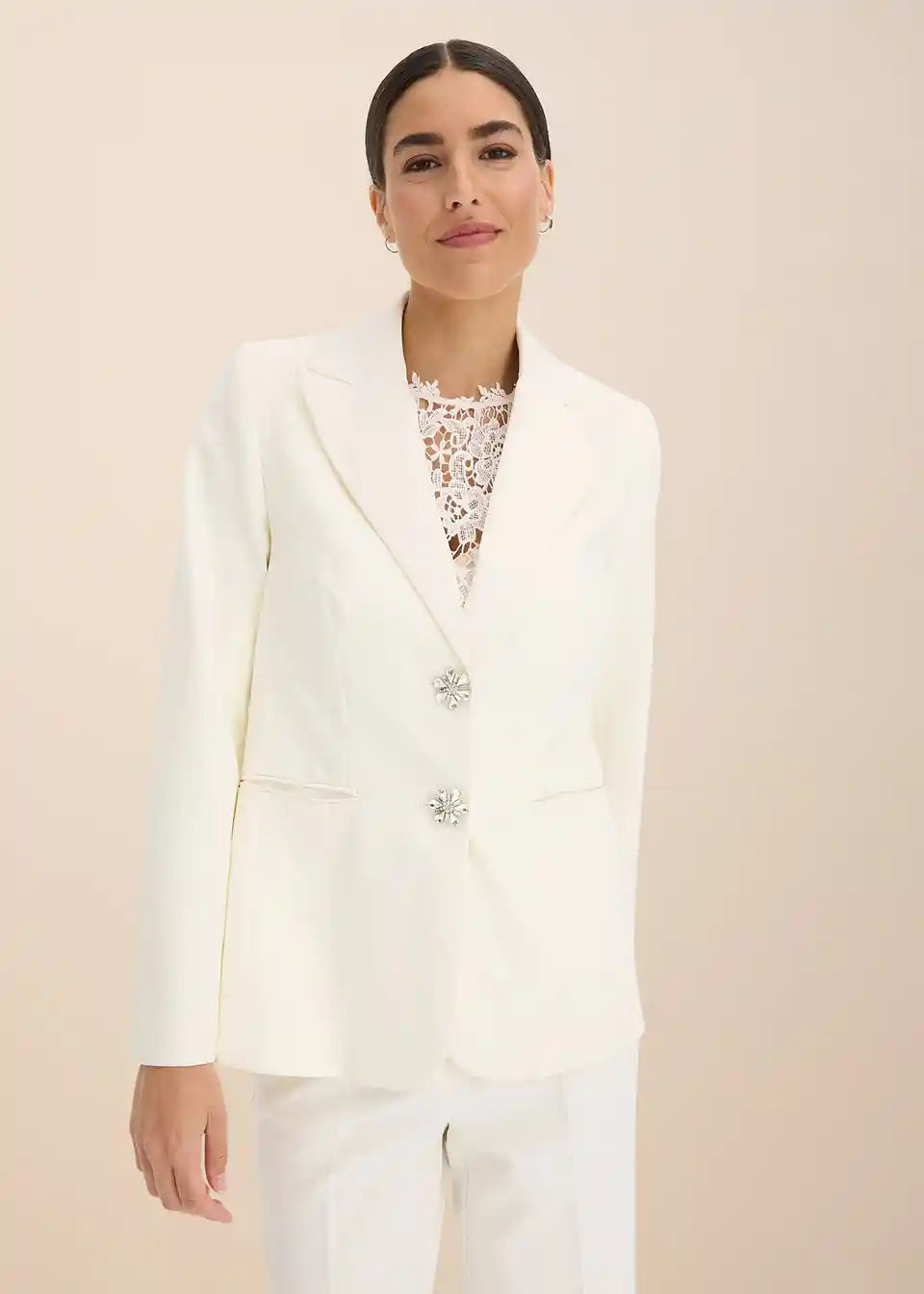 Sodoben in ženstven: blazer s satenastim ovratnikom in okrasnimi gumbi