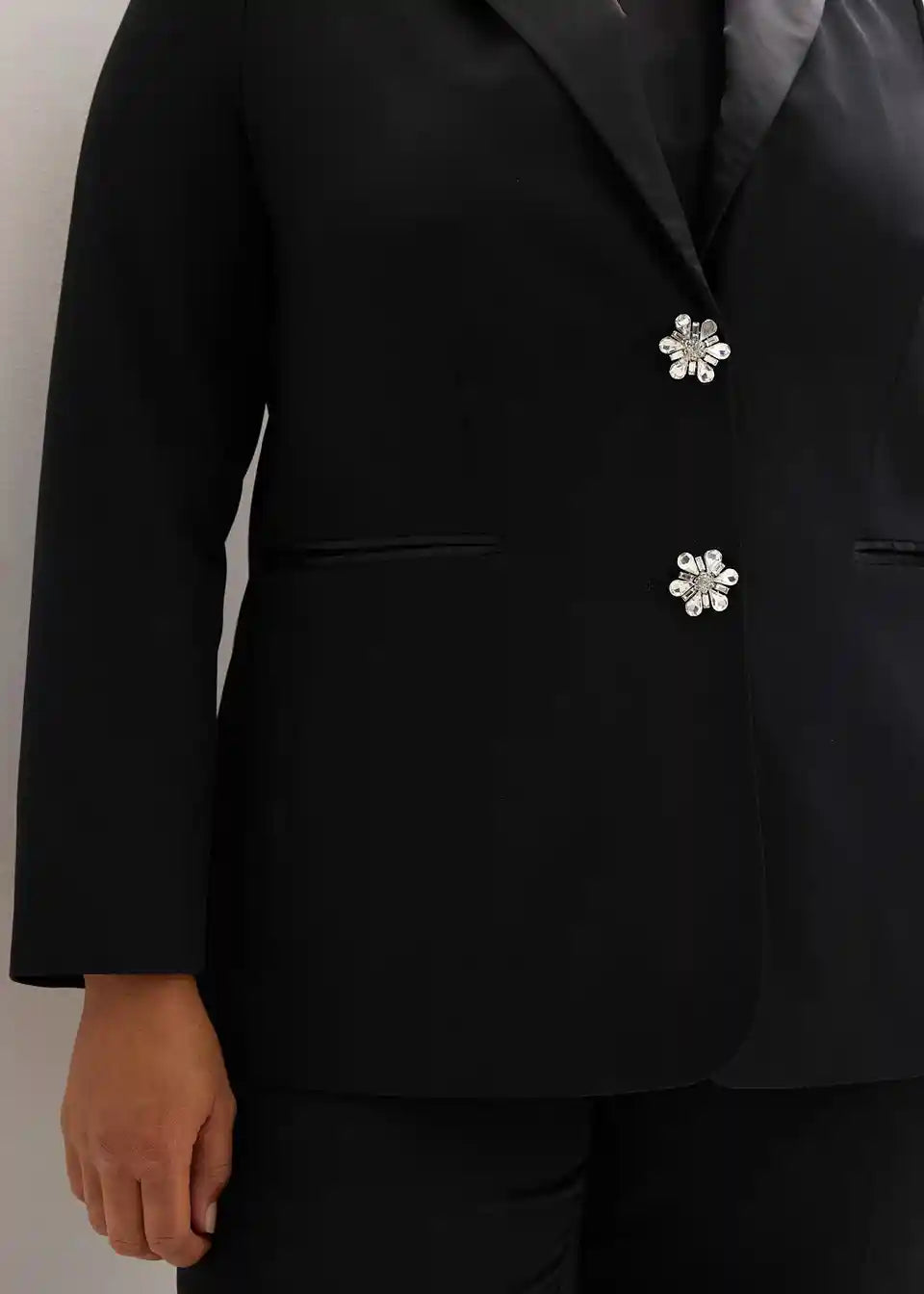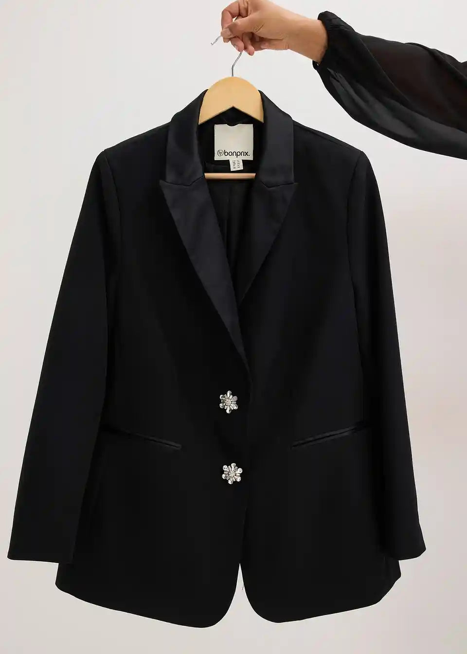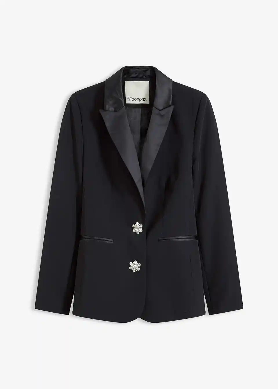 Moderno in ženstveno: blazer s sijočim ovratnikom iz satena ter okrasnimi gumbi