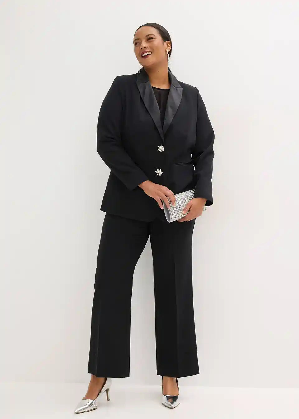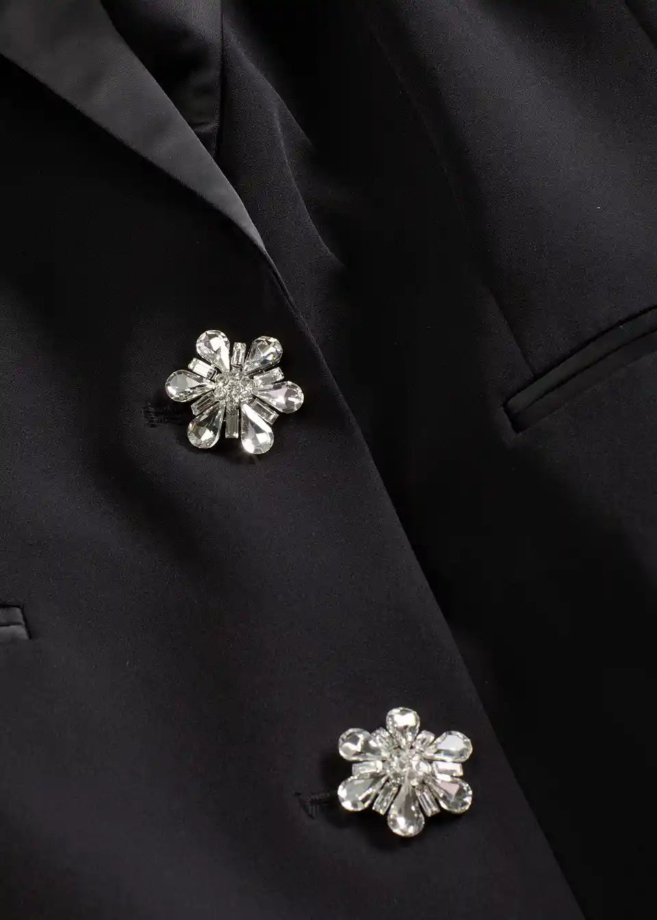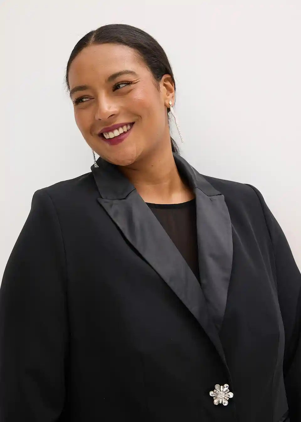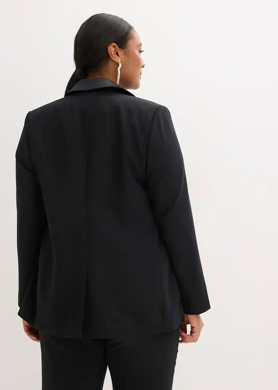 Moderno in ženstveno: blazer s sijočim ovratnikom iz satena ter okrasnimi gumbi