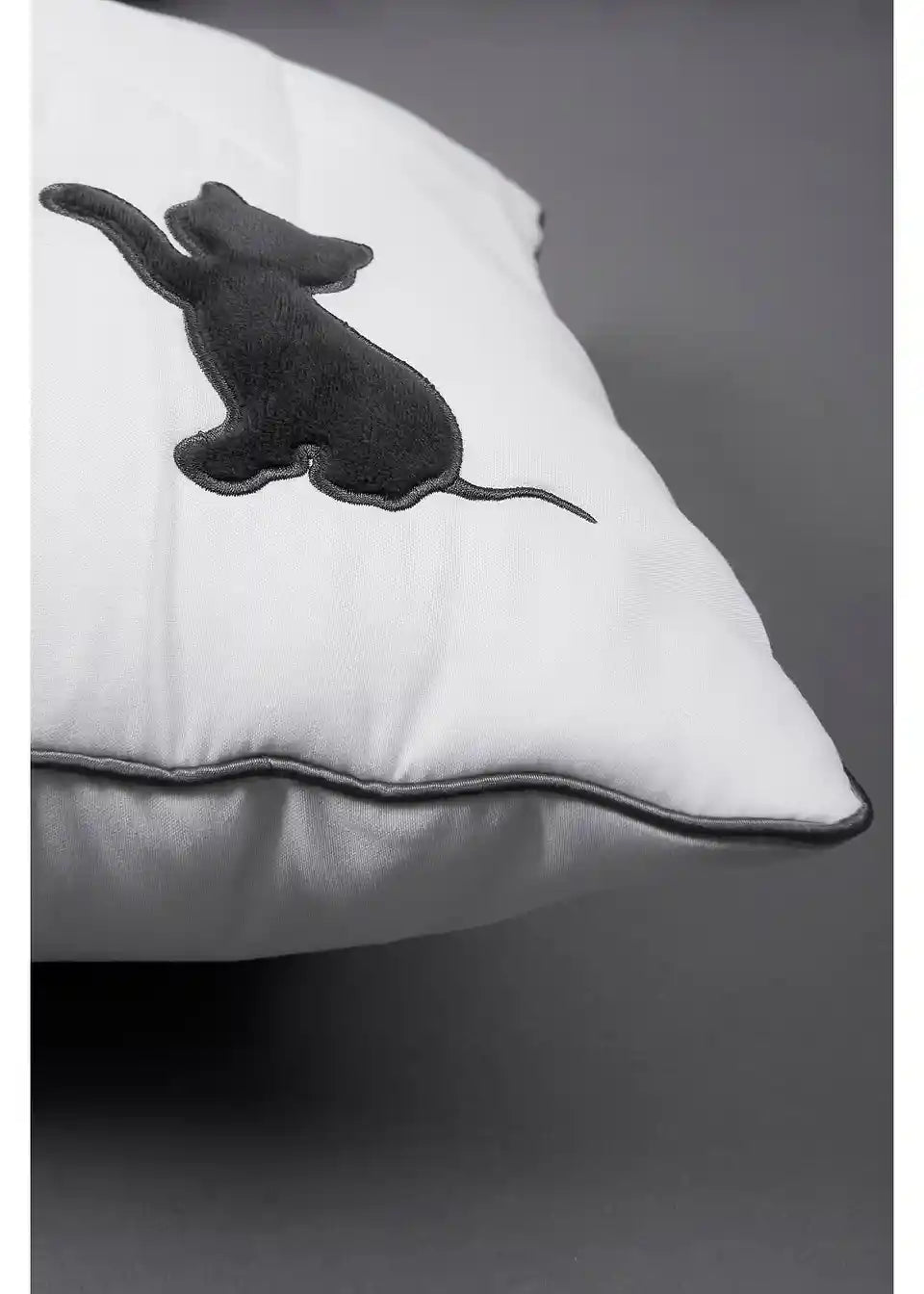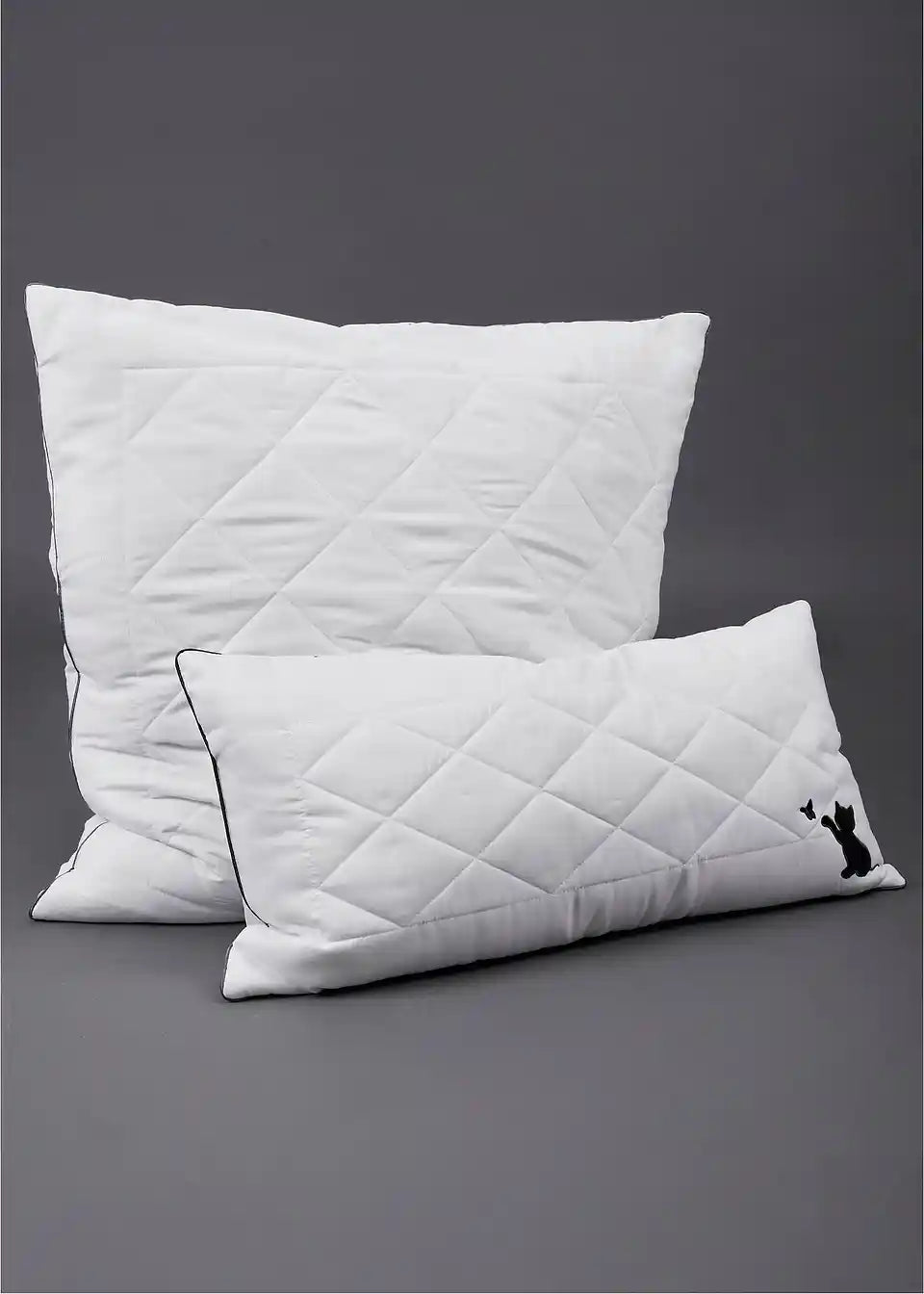 Ta blazina je v mehki kakovosti in kljub temu udobna. Občutek je kot pri pravi blazini iz perja, vendar je opremljena s polnilom iz preprosto negovanega poliestra. Okrašena z motivom mačke.
