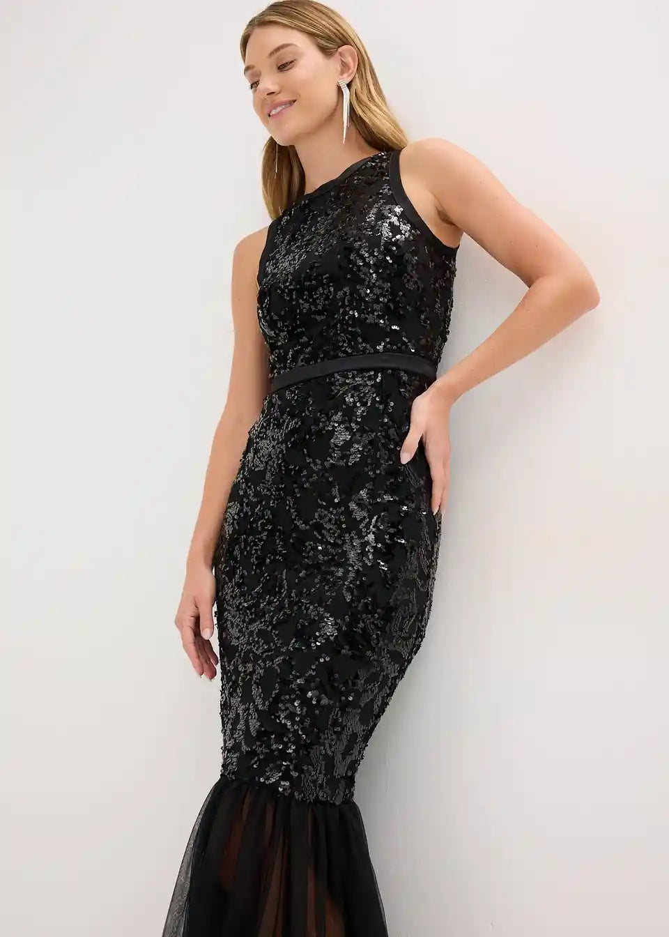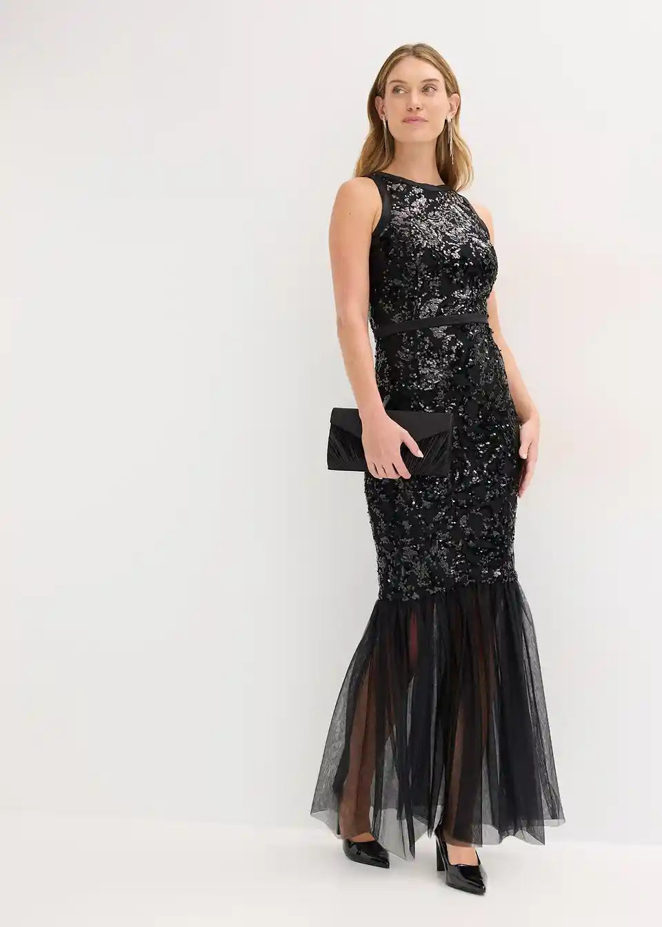Moderno in ženstveno: očarljiva svečana obleka v stilu morske deklice z vezenino iz bleščic in volani iz nežnega tila