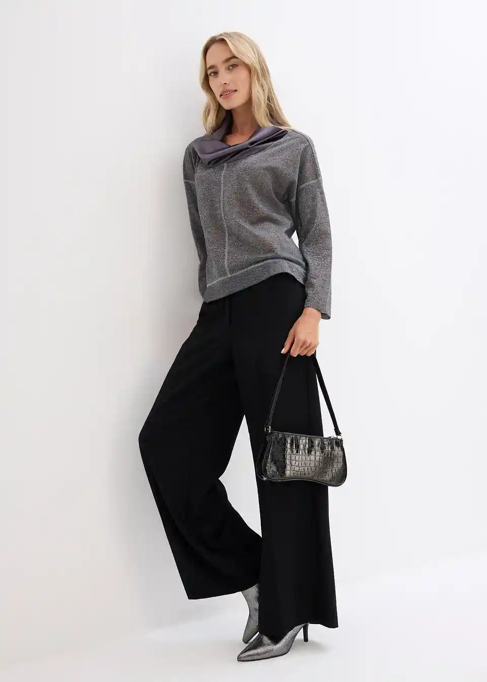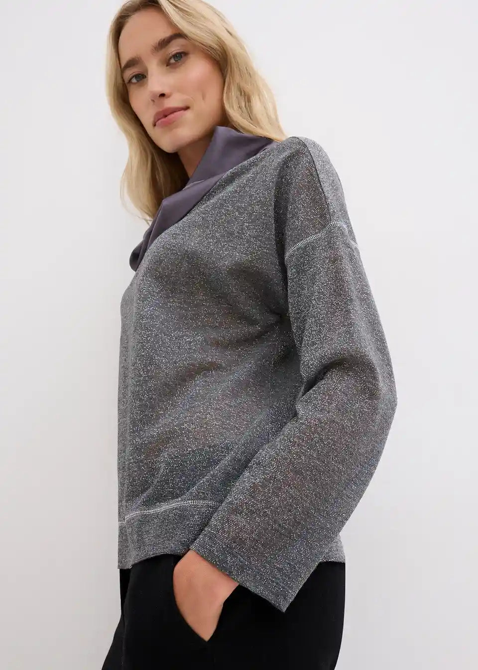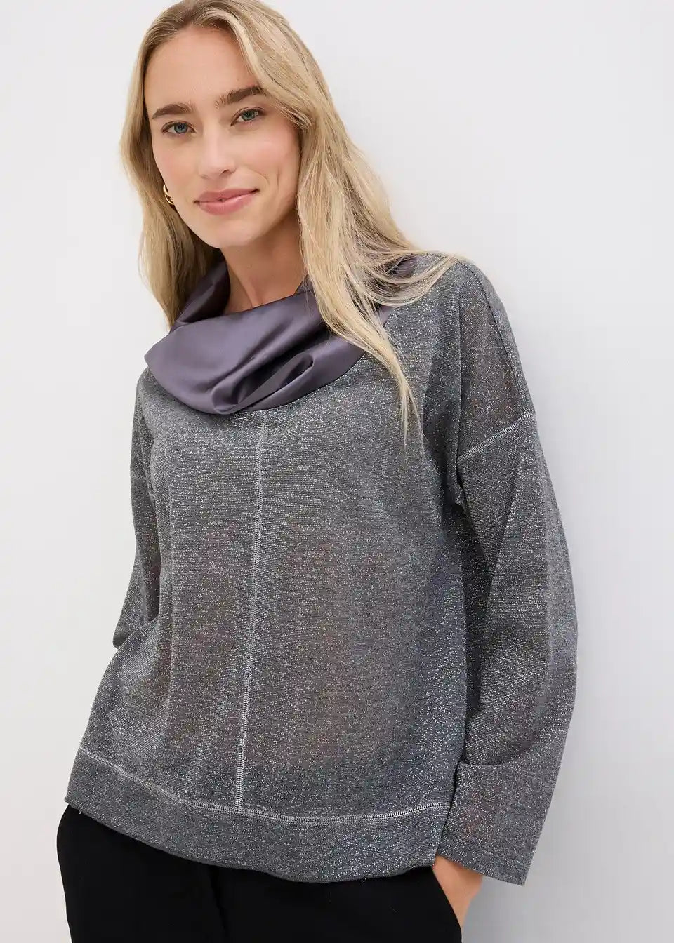 Udobna in elegantna: Majica z dolgimi rokavi iz bleščeče preje in satenastim, elegantnim ovratnikom
