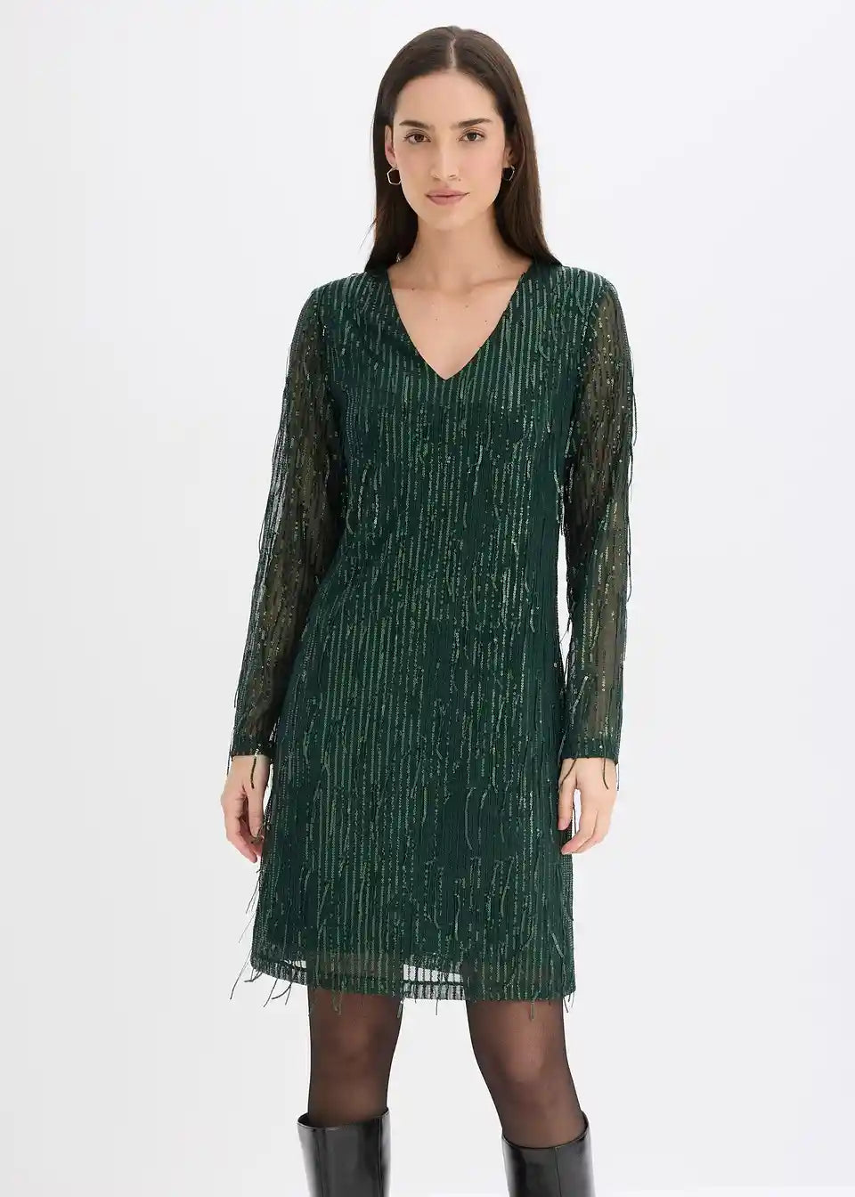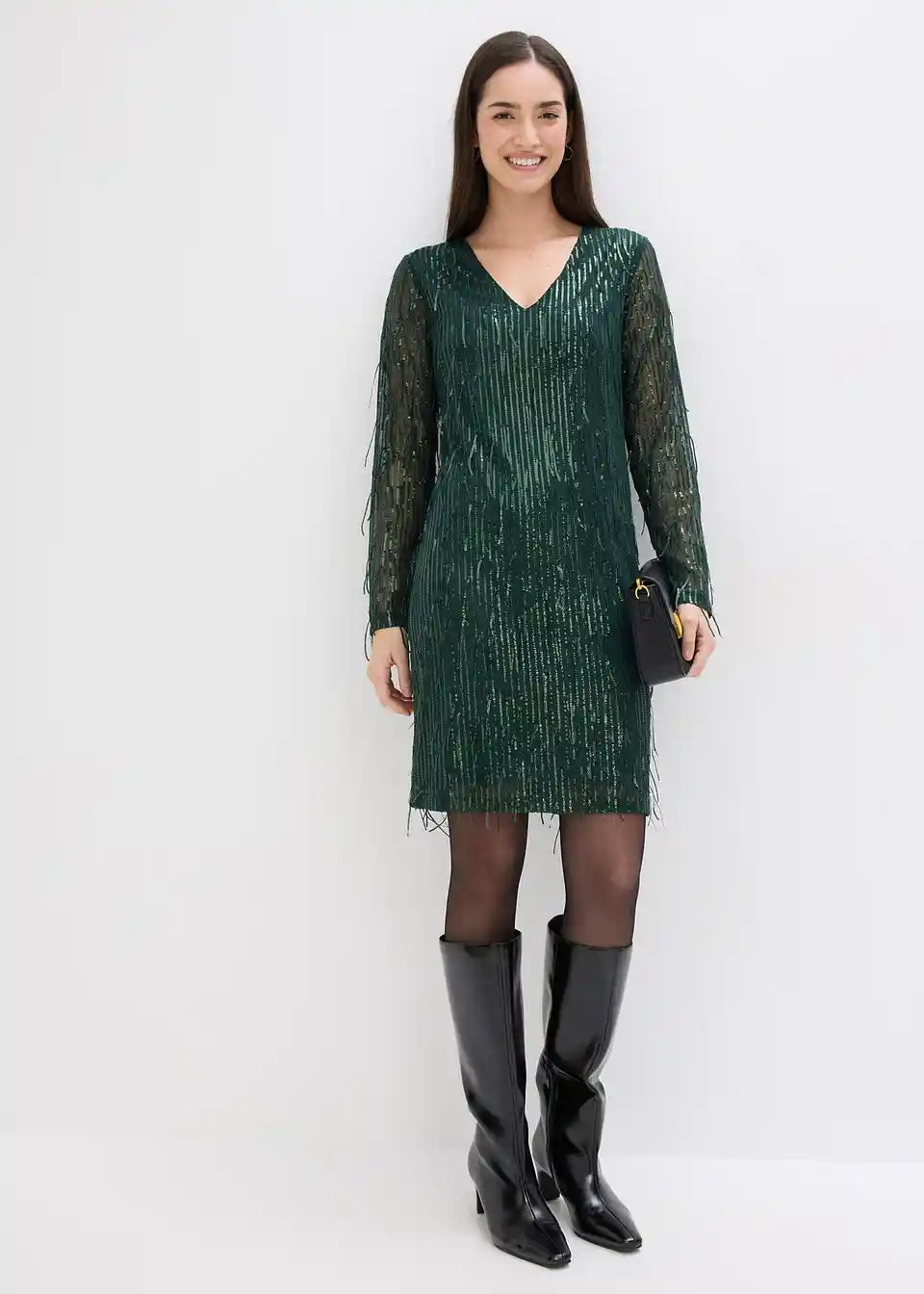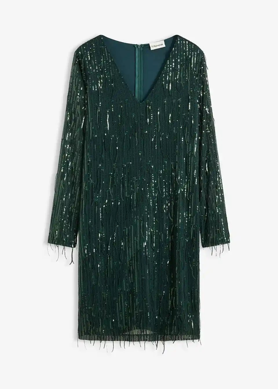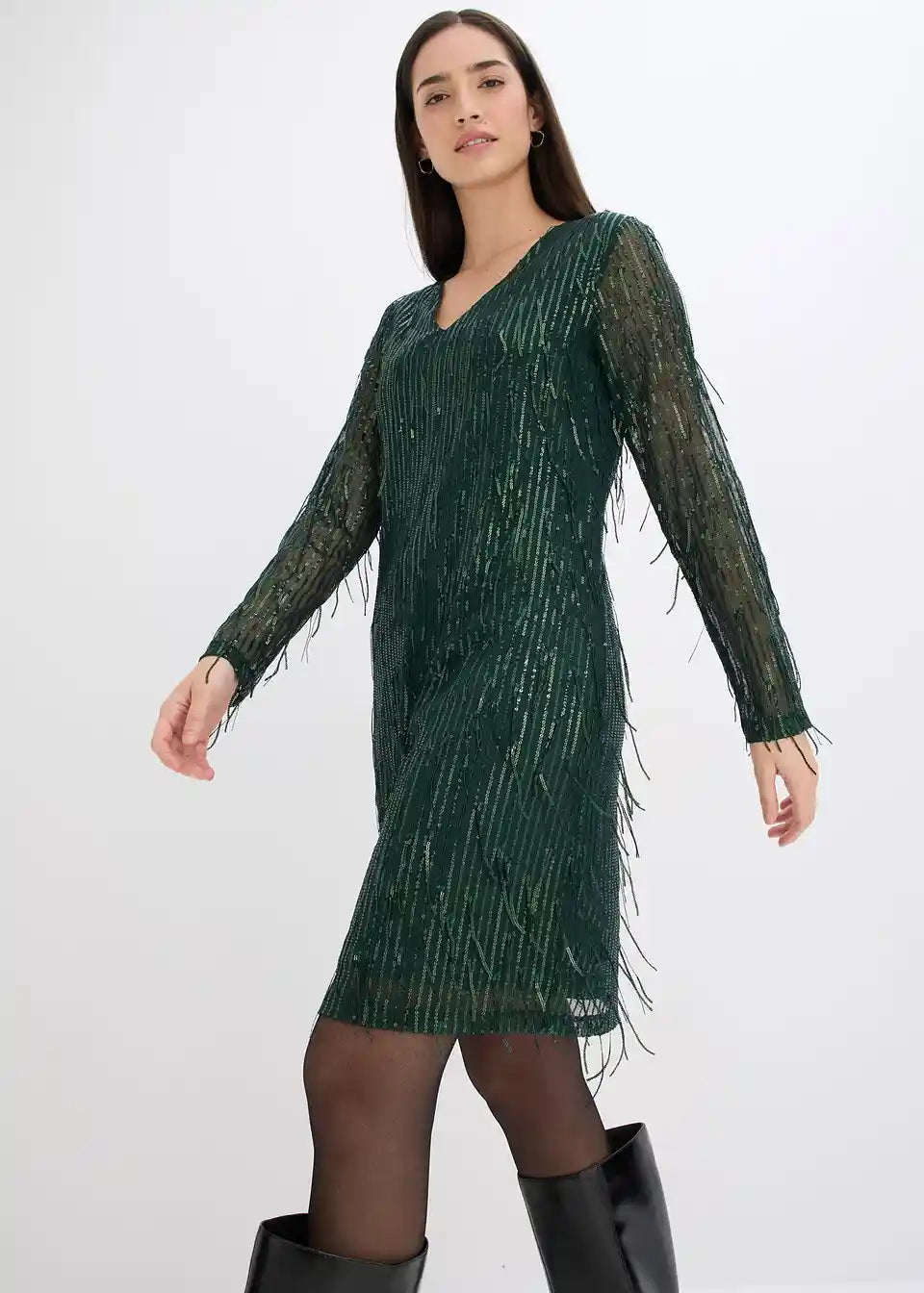 Moderna obleka z bleščicami posutimi resami in globokim V-izrezom spredaj