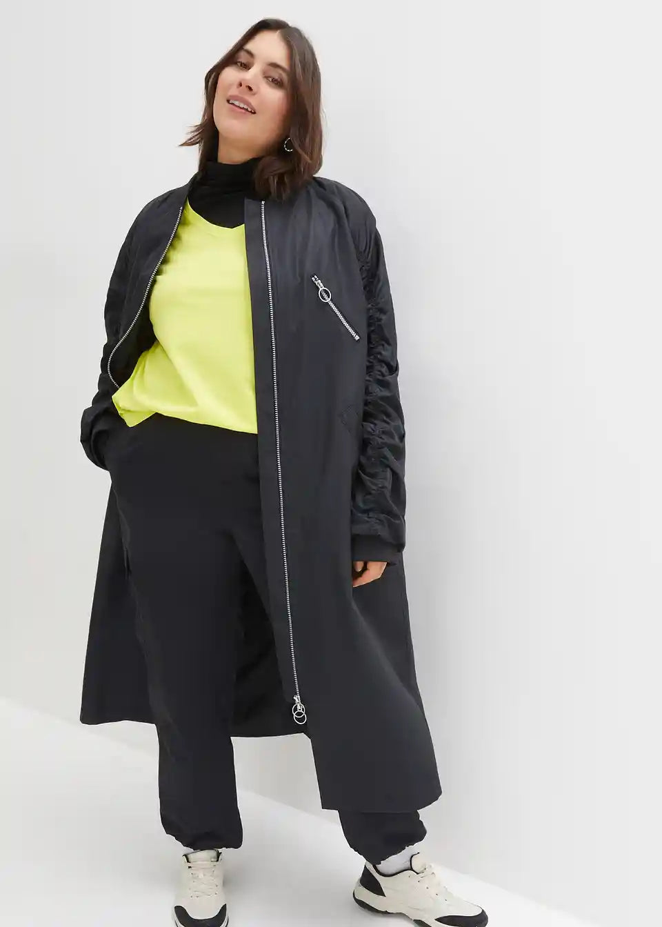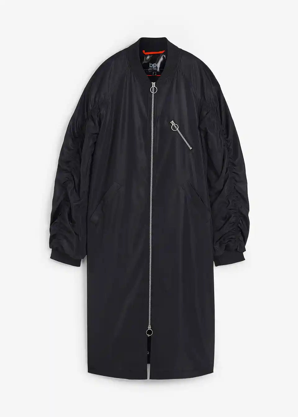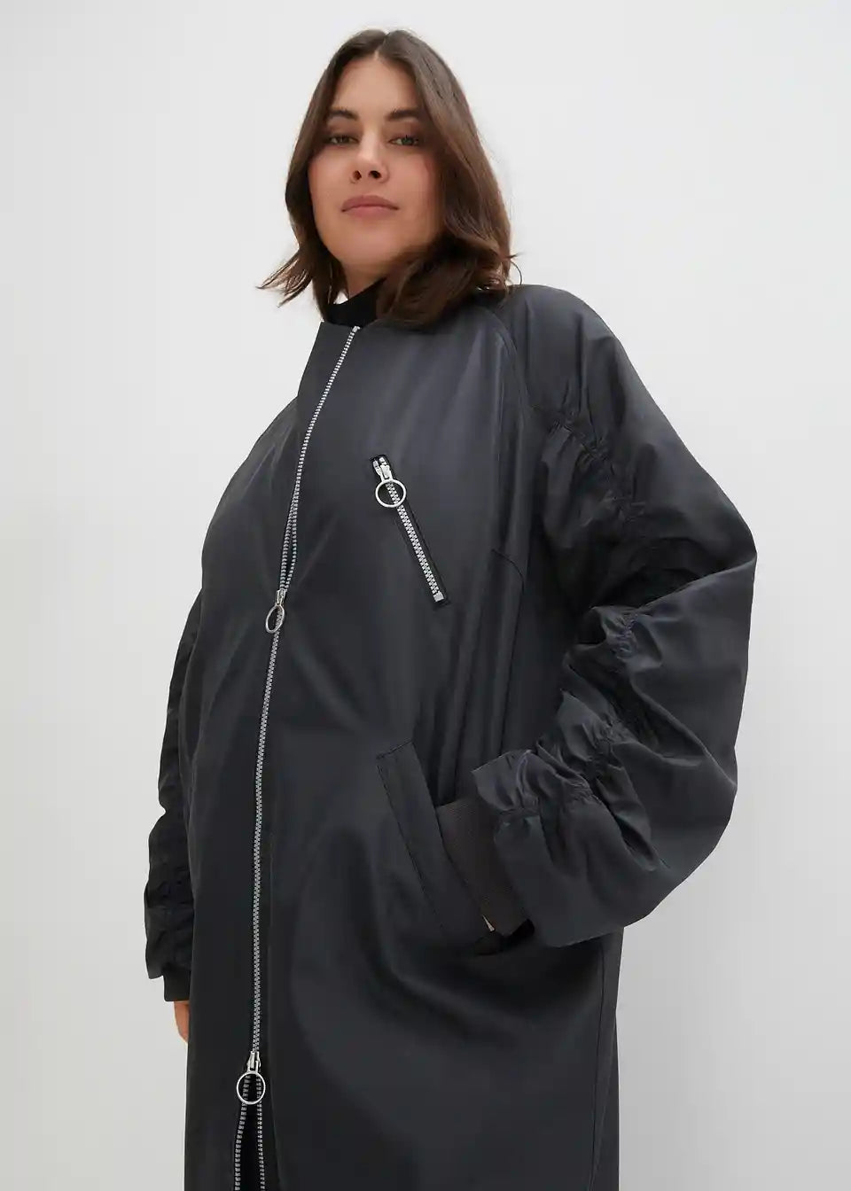 Ležeren, moderen plašč z naborkom na rokavu, pletenimi patenti in okrasnimi žepi