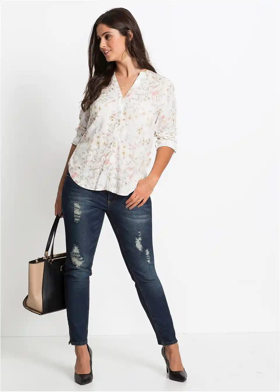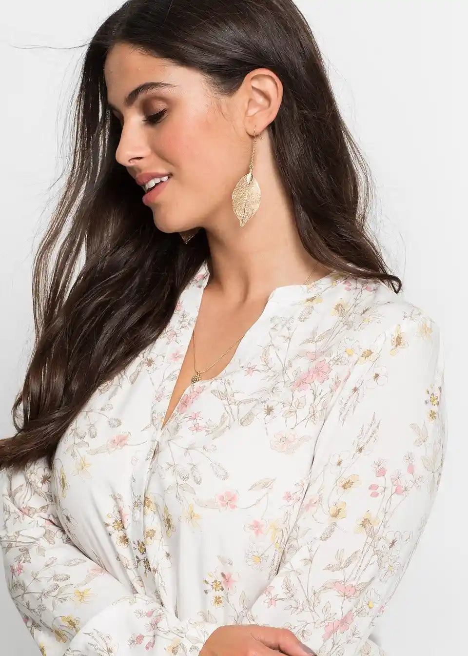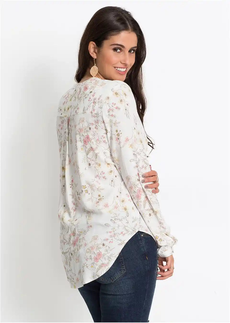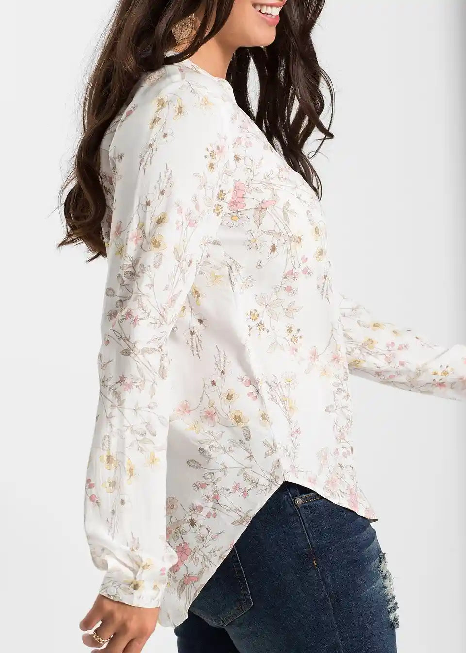 Potiskana bluza z V-izrezom, lahkim stoječim ovratnikom in zaobljenim robom. Dolžina pri št. 38 ca. 70 cm.