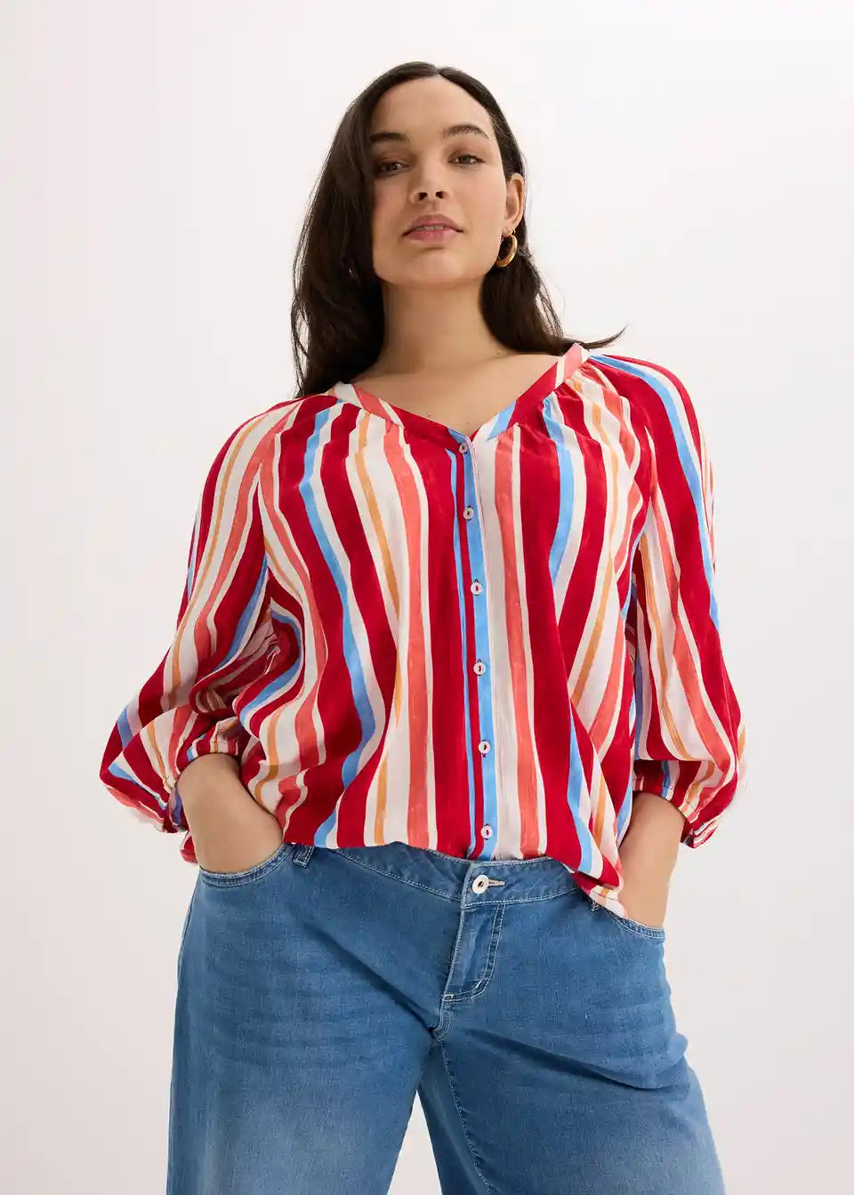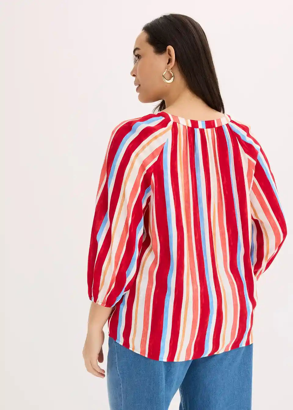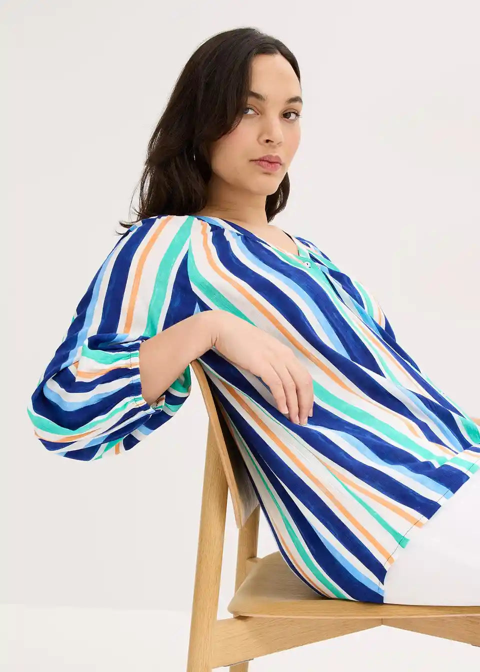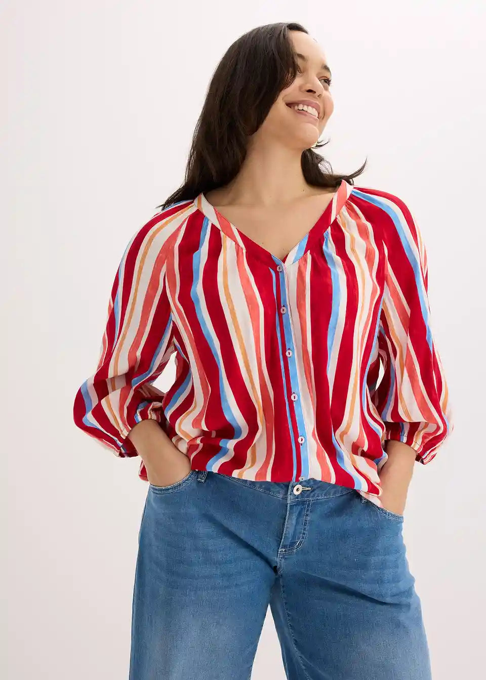 poletna bluza iz strukturirane viskoze z balonastimi rokavi 3/4 dolžine