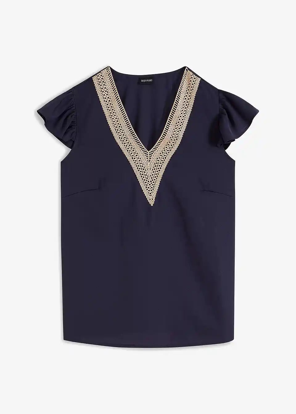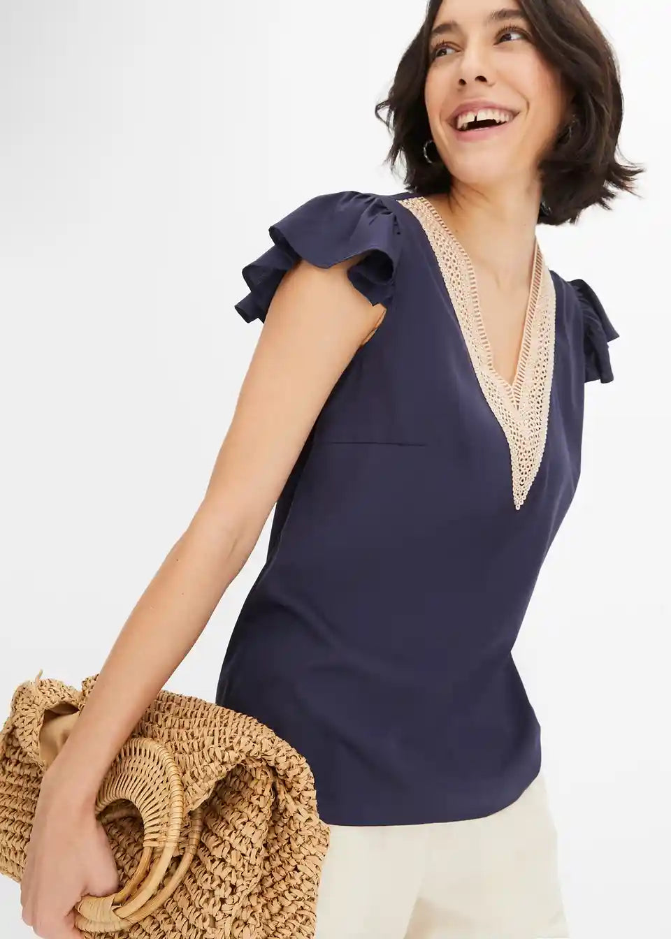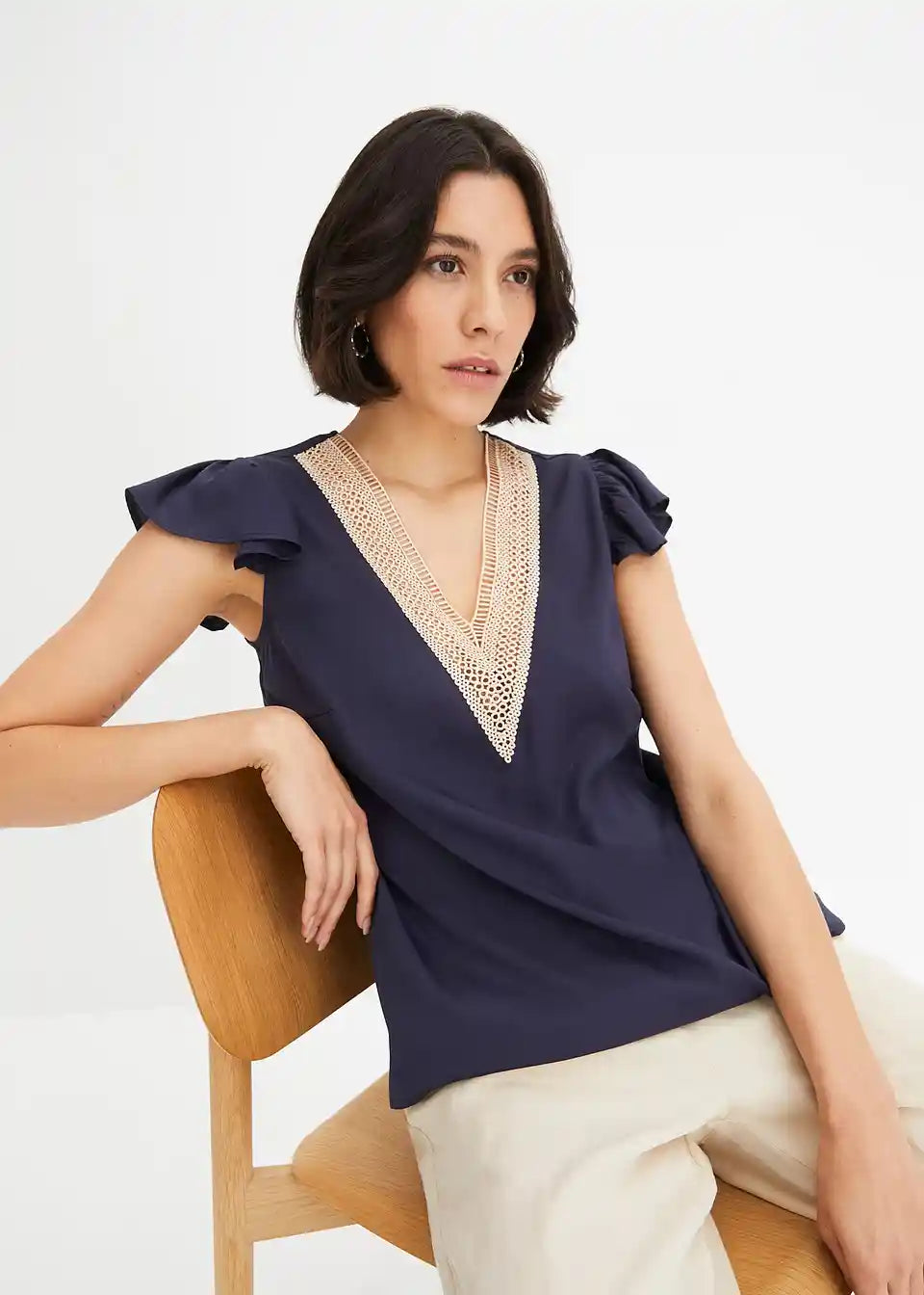 Kratko rokavna bluza s čipkastimi detajli na izrezu