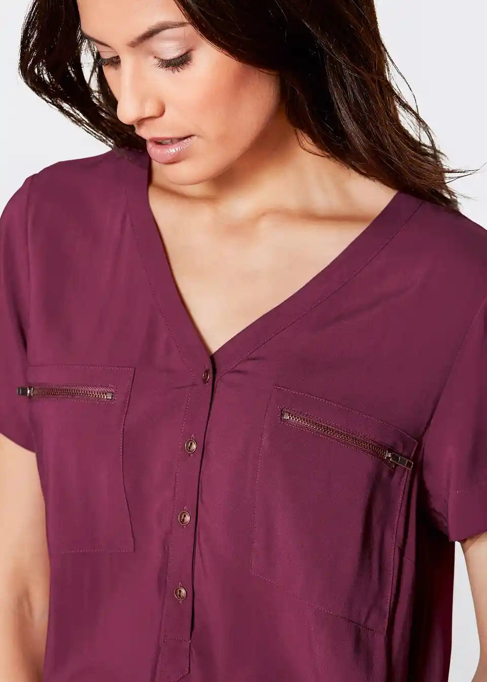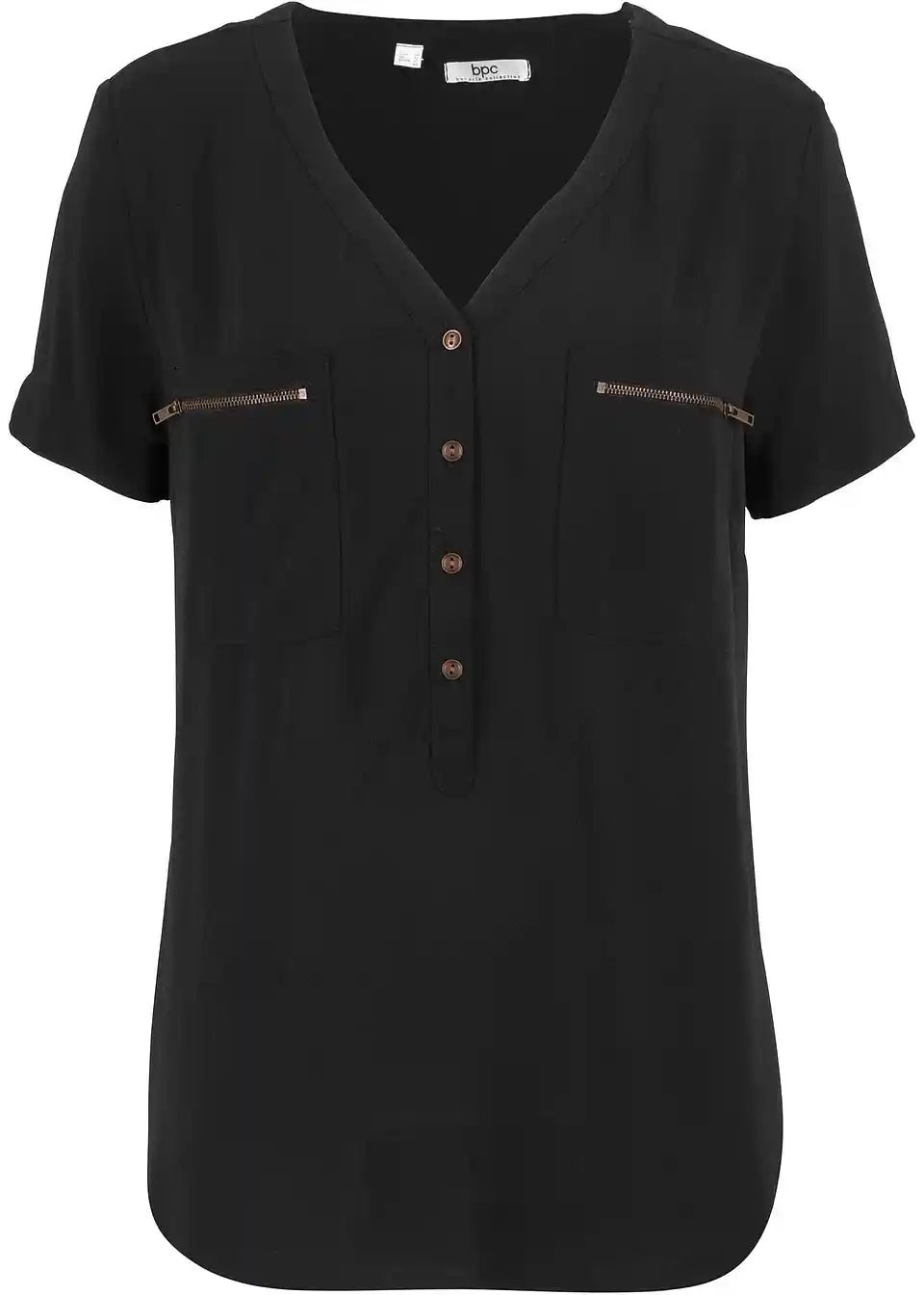Ohlapen kroj in prijetna viskozna kakovost naredita to bluzo znamke bpc v priljubljen kos oblačila za vsak dan. Privlačen V-izrez se nadaljuje v kratko vrstico gumbov, s katerimi ga lahko individualno prilagodite. Dodatni poudarki so žepa na prsih z zadrgo. Rahlo zaobljen zadnji rob dopolnjuje privlačen dizajn viskozne bluze s polovičnimi rokavi.