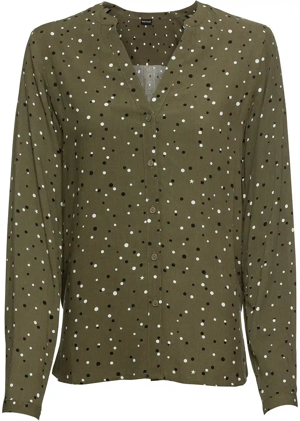 Bluza z modernimi pikicami. Bluza je zadaj nekoliko daljša. Dolžina v št. 38 približno 70 cm.