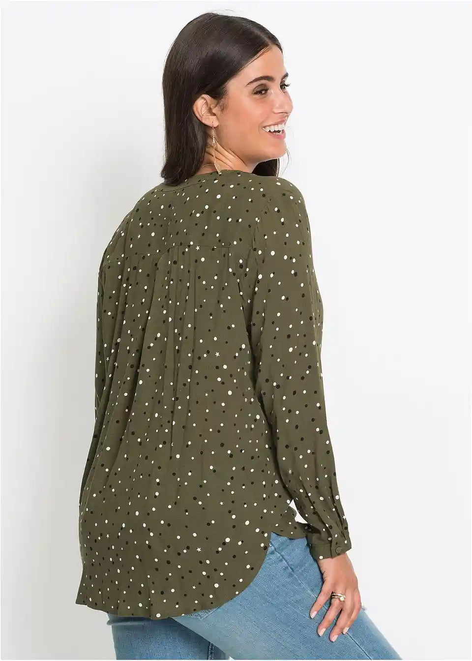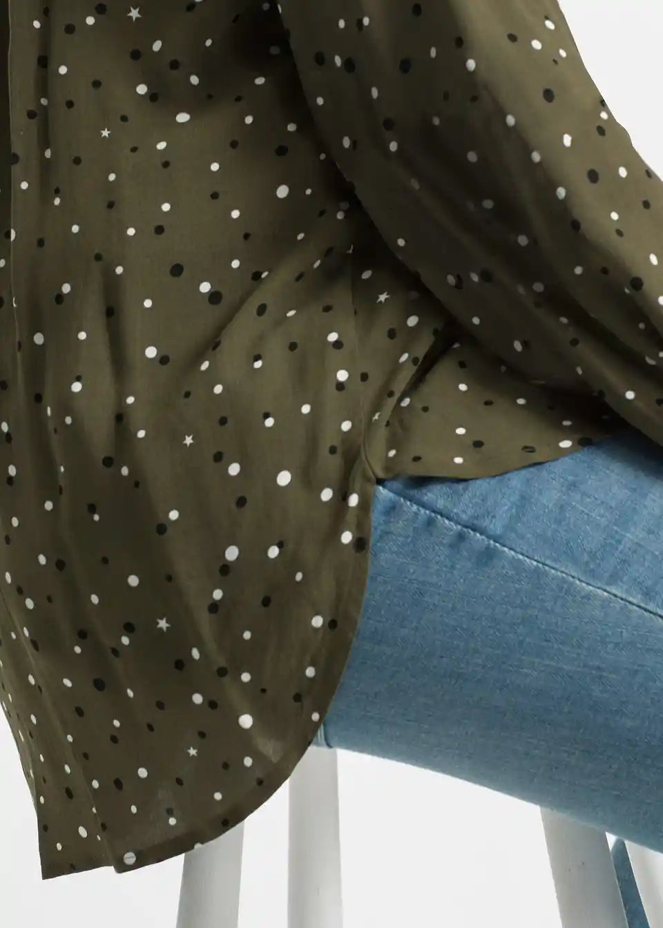 Privlačna bluza s pikicami z zapenjanjem na gumbe in očarljivim V-izrezom.