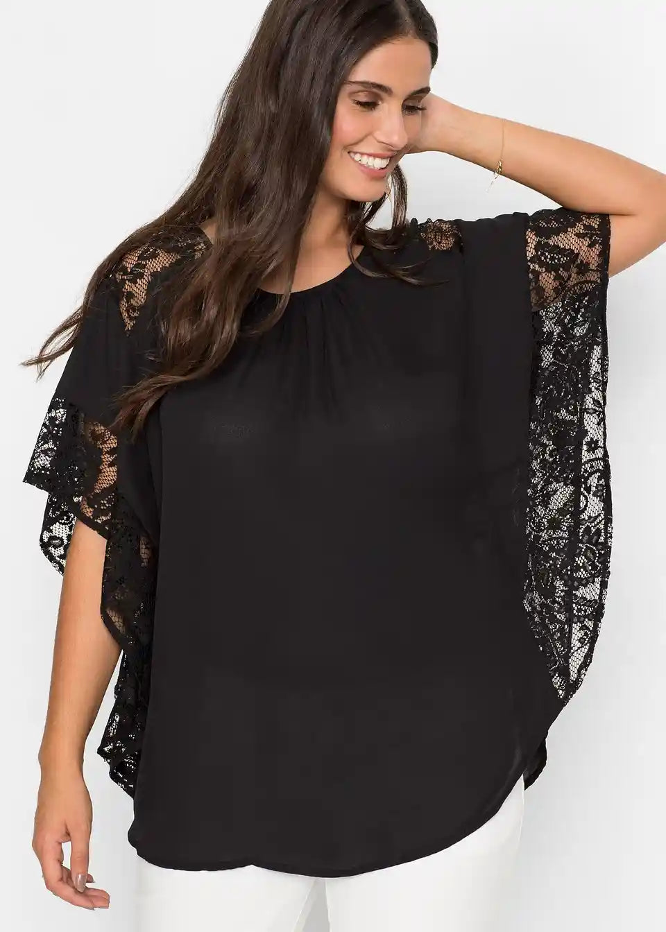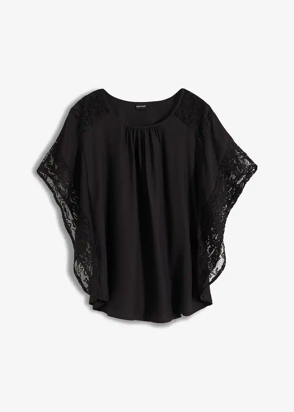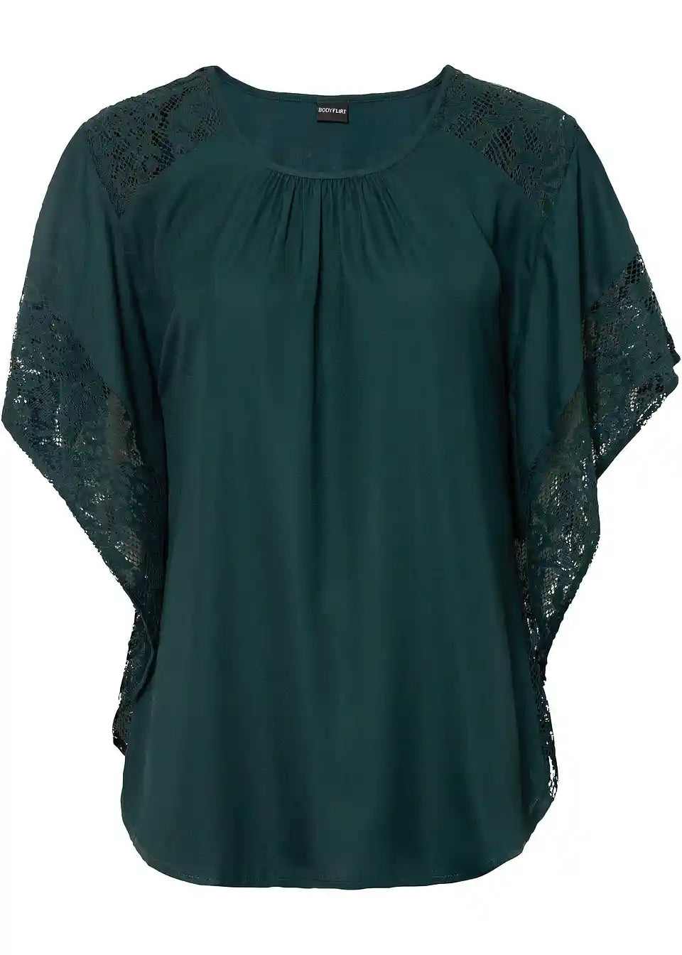 Ta bluza na privlačen način poudari žensko postavo in s svojim ženstvenim šarmom poskrbi za očarljiv videz. Široki netopirski rokavi dodajo lahkotnemu modelu bluze znamke BODYFLIRT romantično noto. Nežne čipkaste aplikacije vzdolž rokavov in nad rameni ustvarjajo igrive poudarke. Lažje naborke vzdolž izreza poudarijo bluzo z detajli iz čipke in jo naredijo prefinjen najljubši kos.