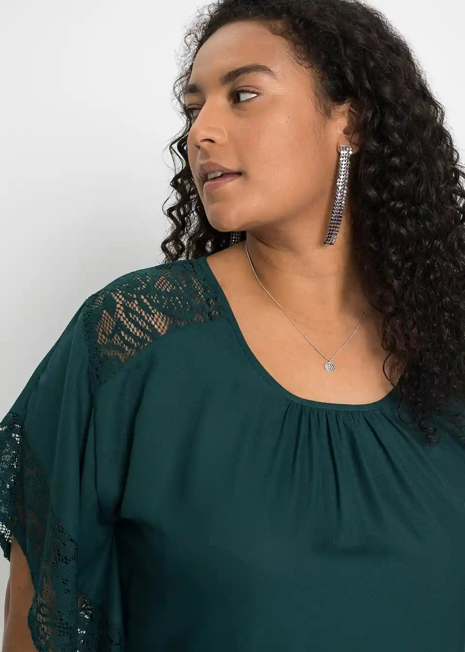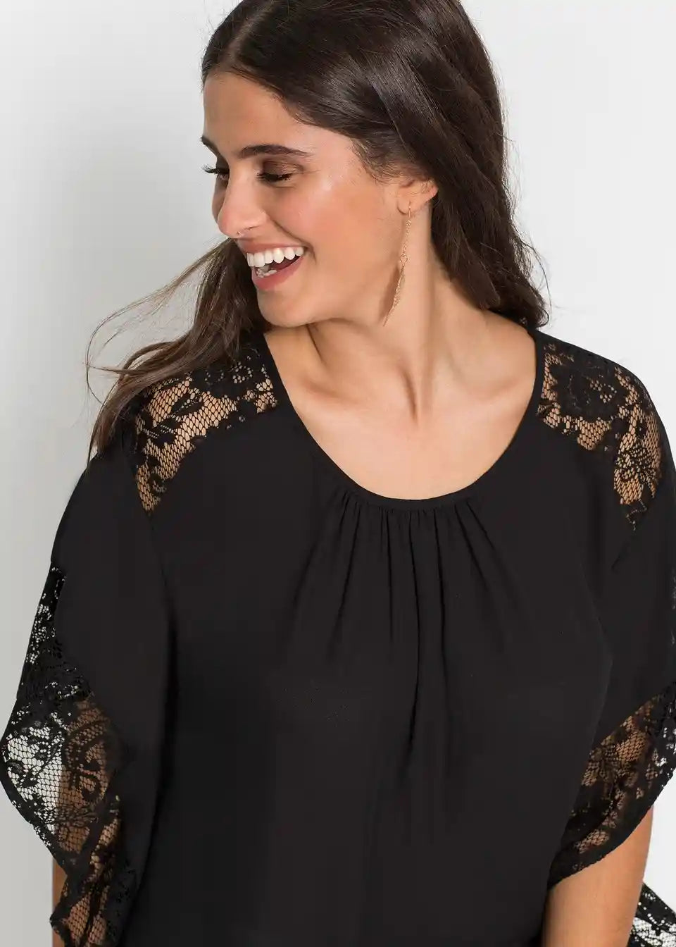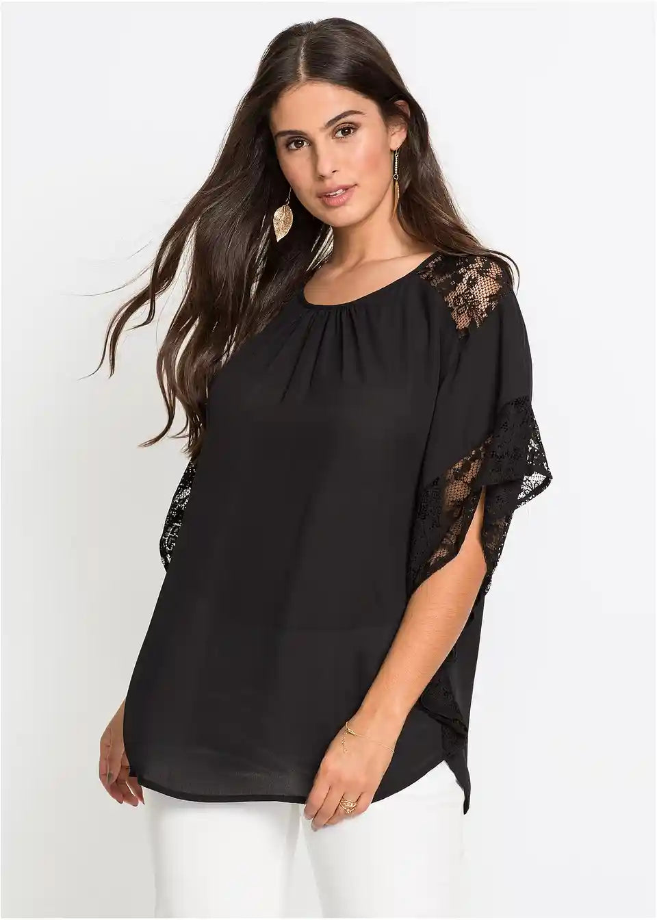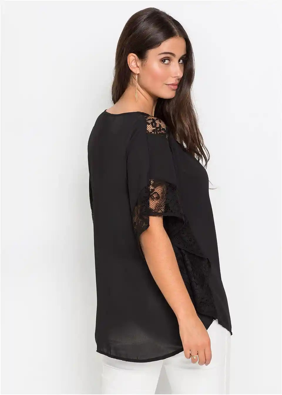 Ta bluza na privlačen način poudari žensko postavo in s svojim ženstvenim šarmom poskrbi za očarljiv videz. Široki netopirski rokavi dodajo lahkotnemu modelu bluze znamke BODYFLIRT romantično noto. Nežne čipkaste aplikacije vzdolž rokavov in nad rameni ustvarjajo igrive poudarke. Lažje naborke vzdolž izreza poudarijo bluzo z detajli iz čipke in jo naredijo prefinjen najljubši kos.