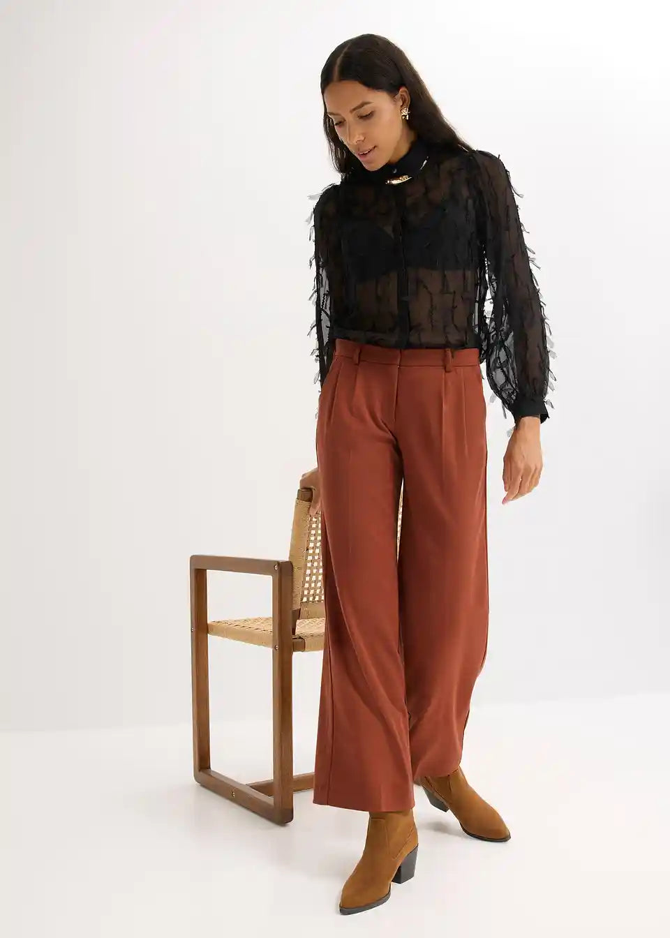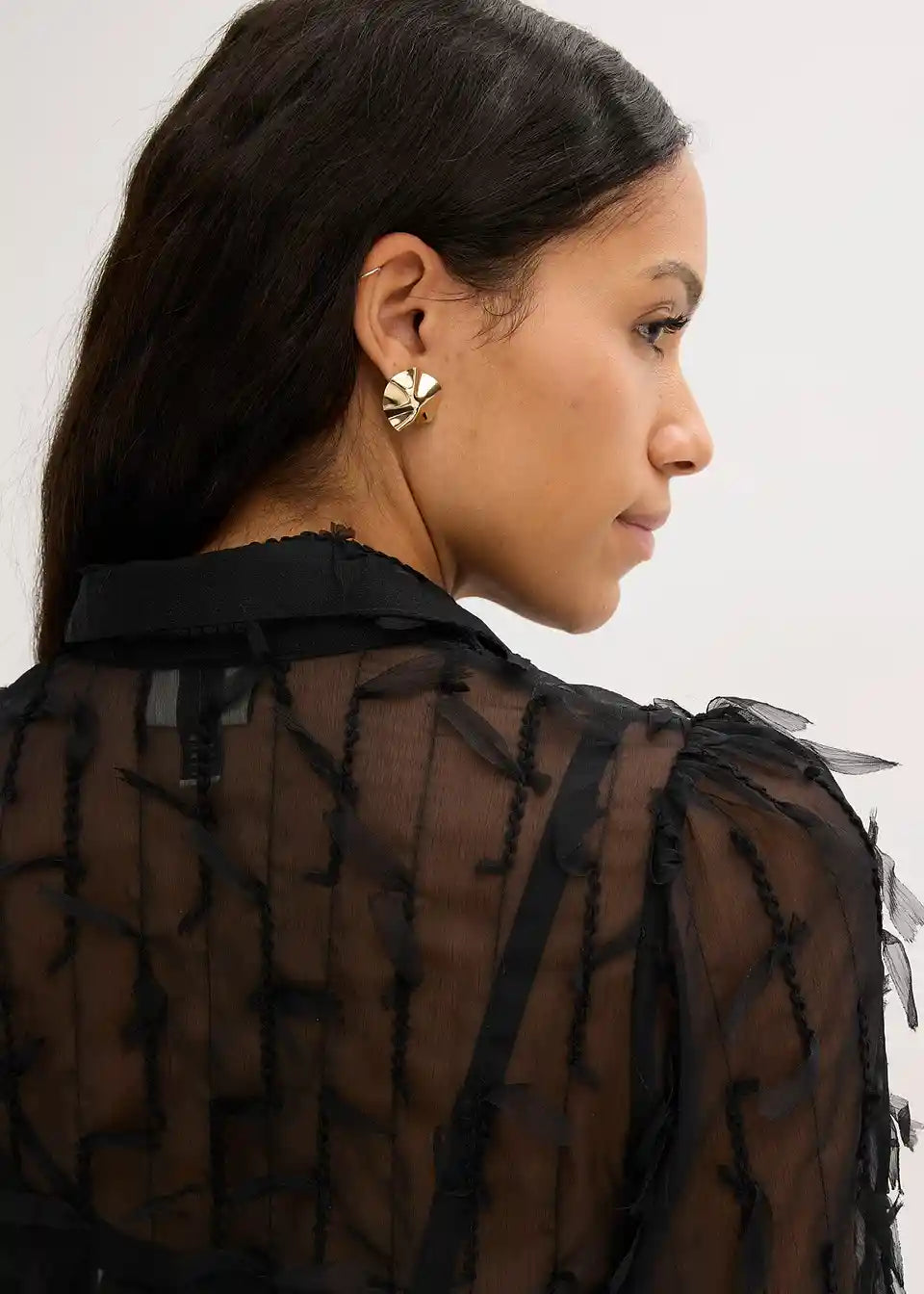 Lahka prosojna modna bluza iz strukturiranega materiala z okrasjem iz resic.