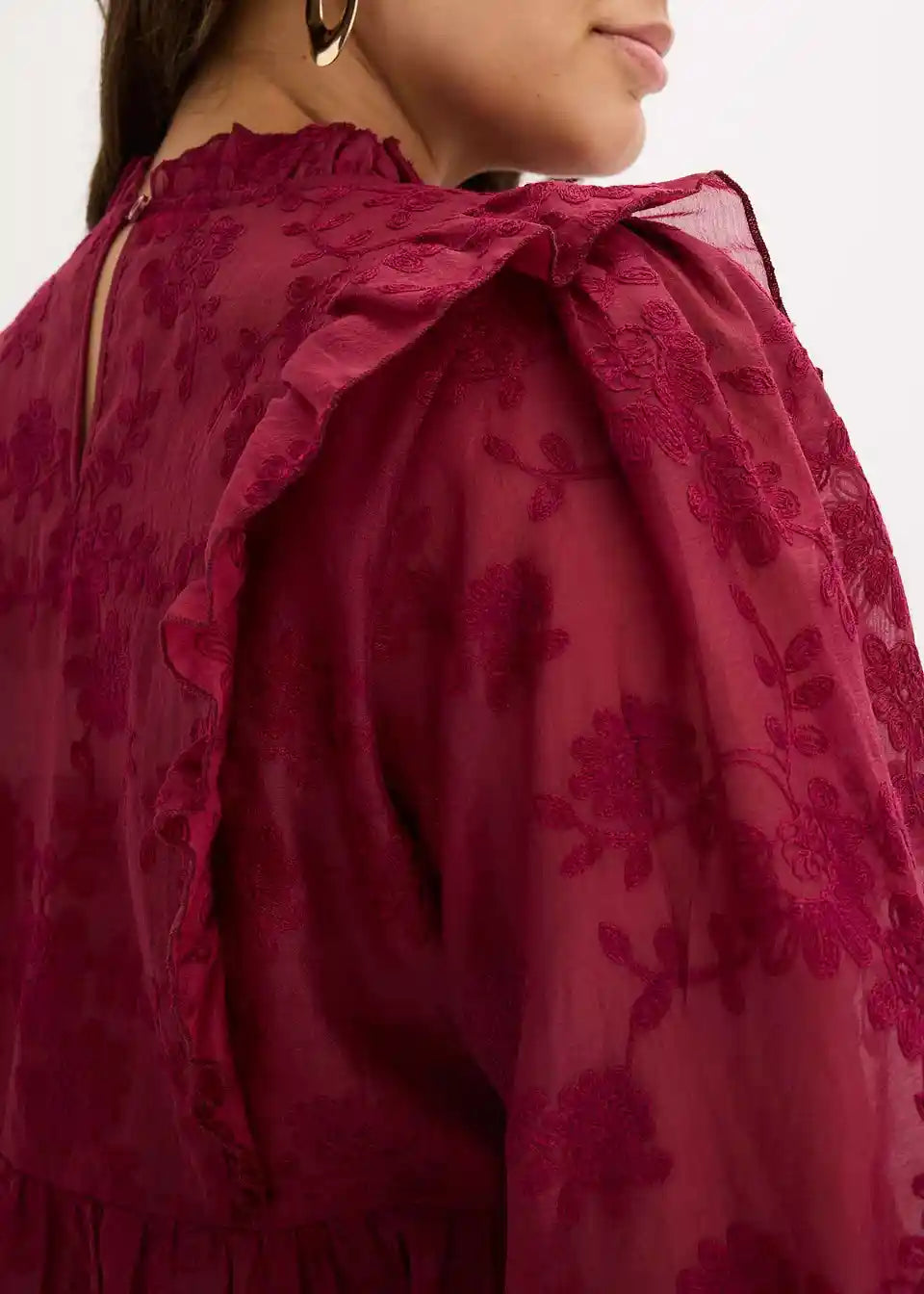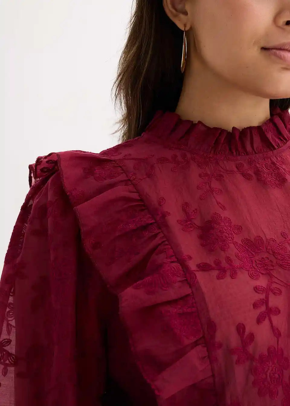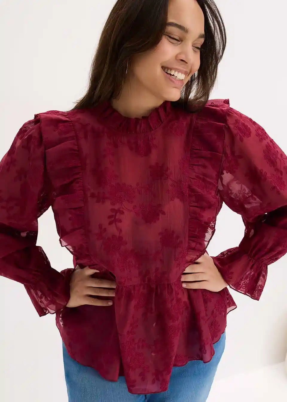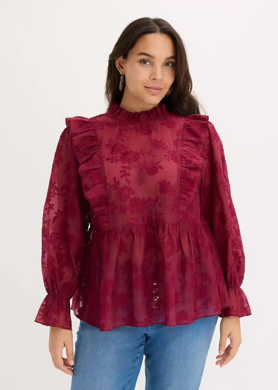 moderna bluza s cvetličnimi vezeninami in volančki.