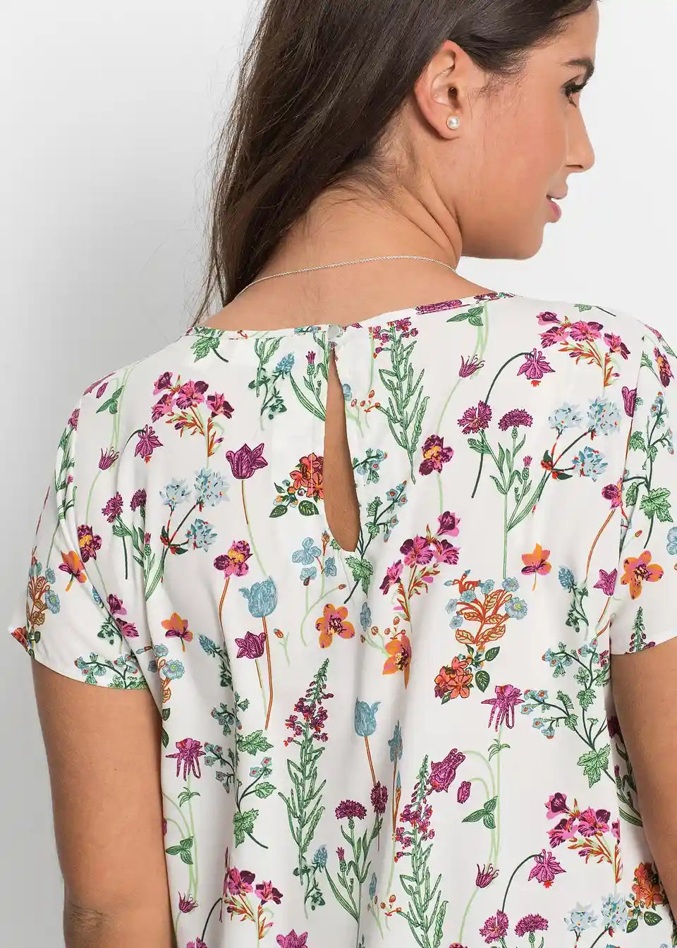 Bluza kroja A-linije, ki se zapenja z majhnim gumbom na zatilju. Dolžina pri št. 38 približno 68 cm.