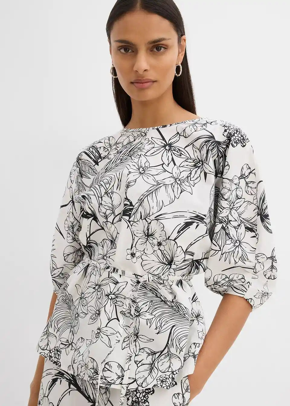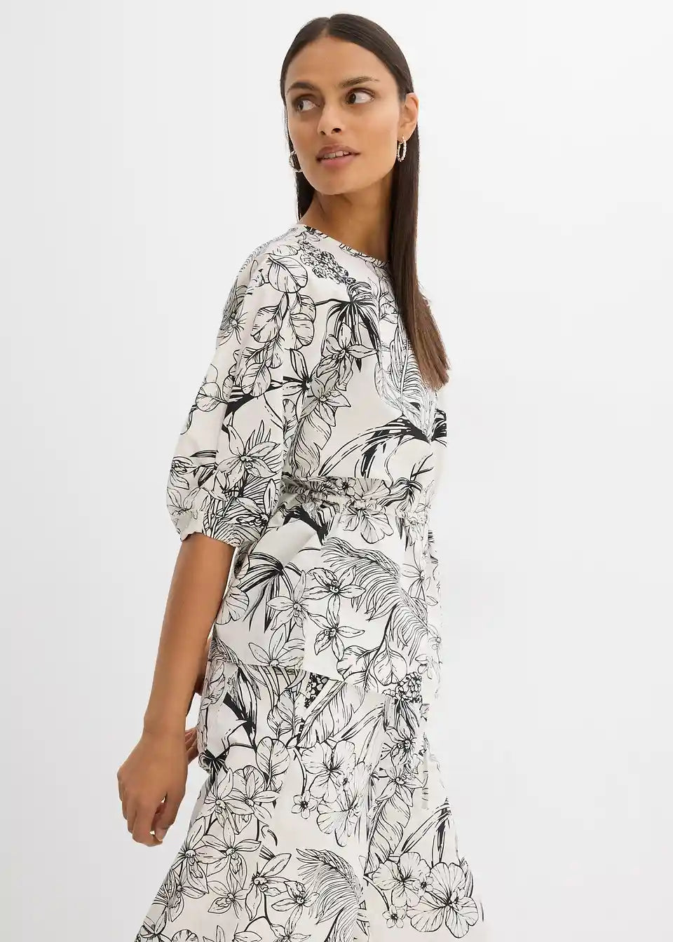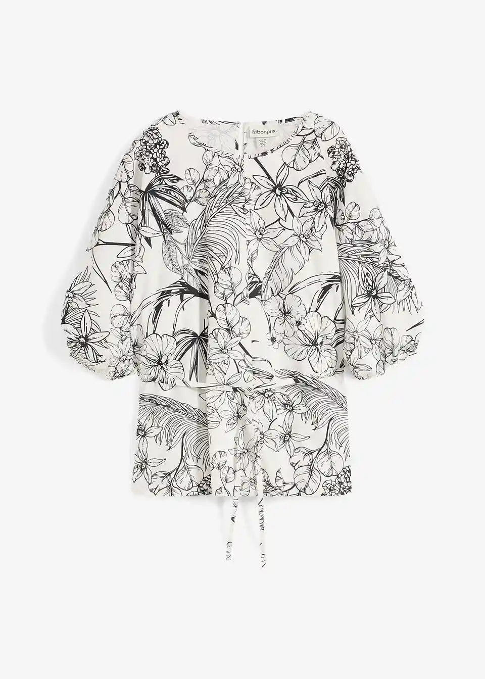 Kratka bluza s kratkimi rokavi, okroglim izrezom ter rokavi s kratko elastiko. Pas za vezanje v pasu in zapenjanje na gumb na hrbtu.