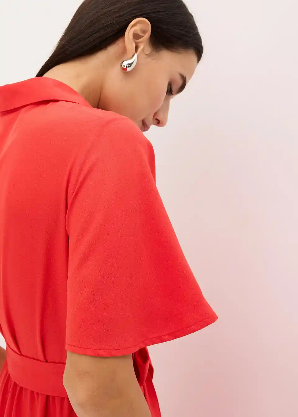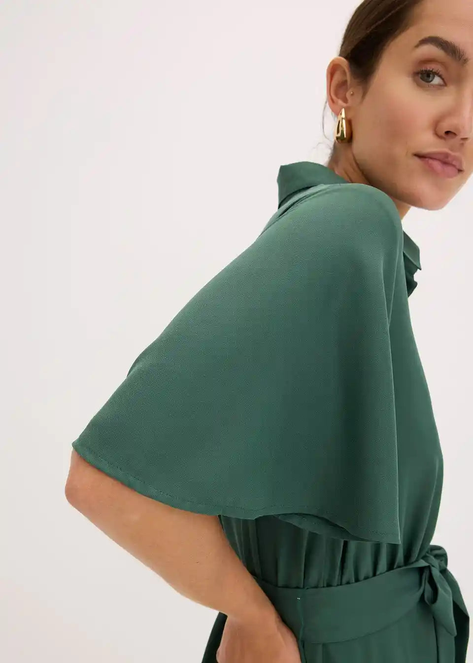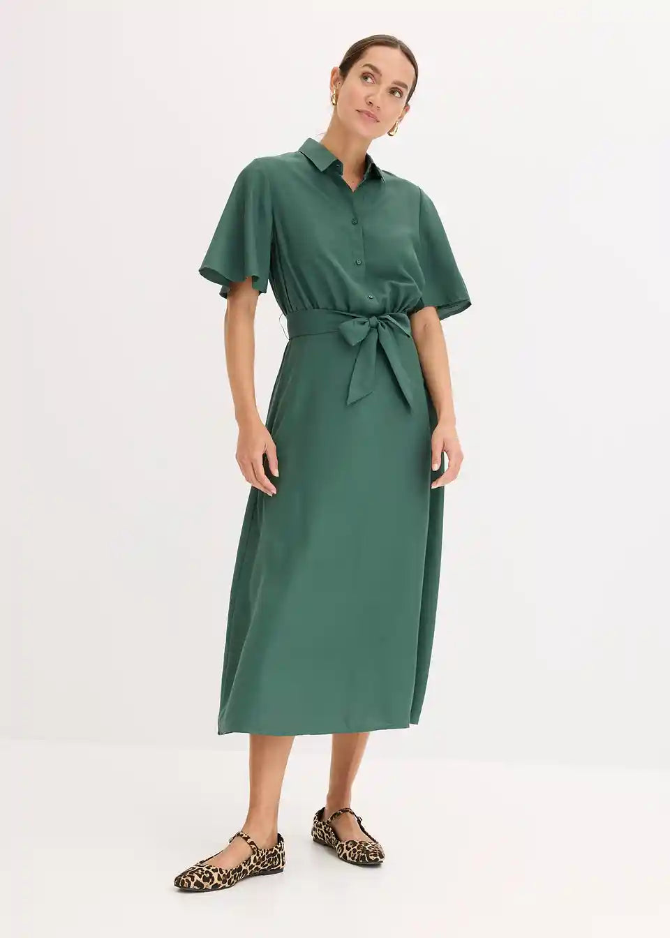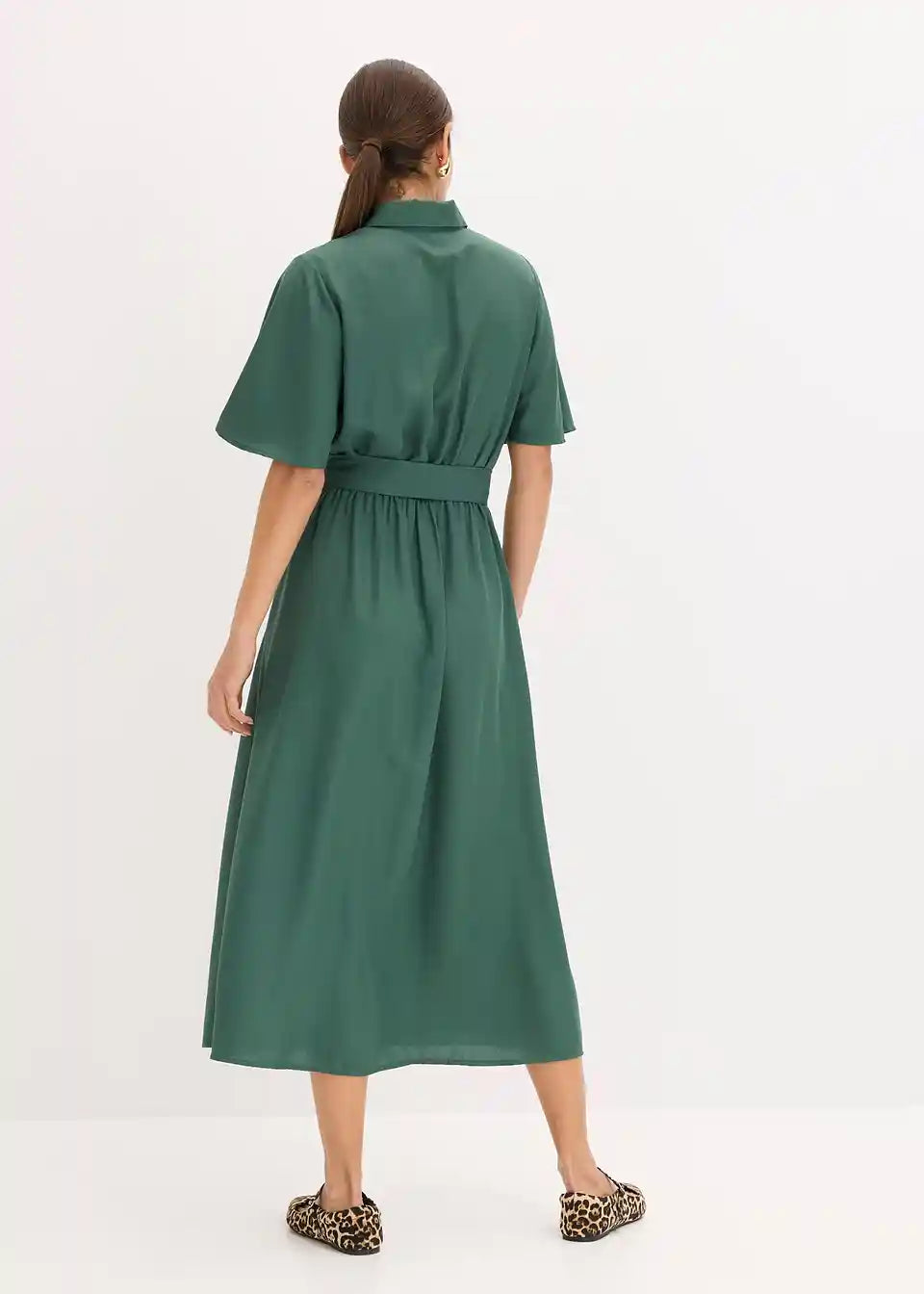 feminina bluzna obleka v midi dolžini z vezalnim pasom v pasu