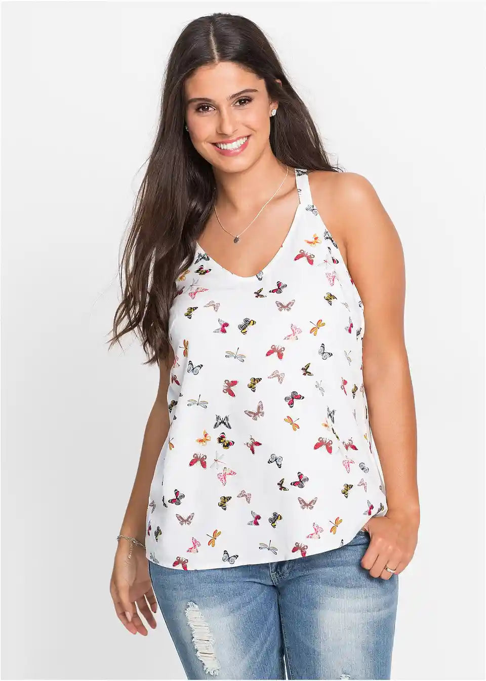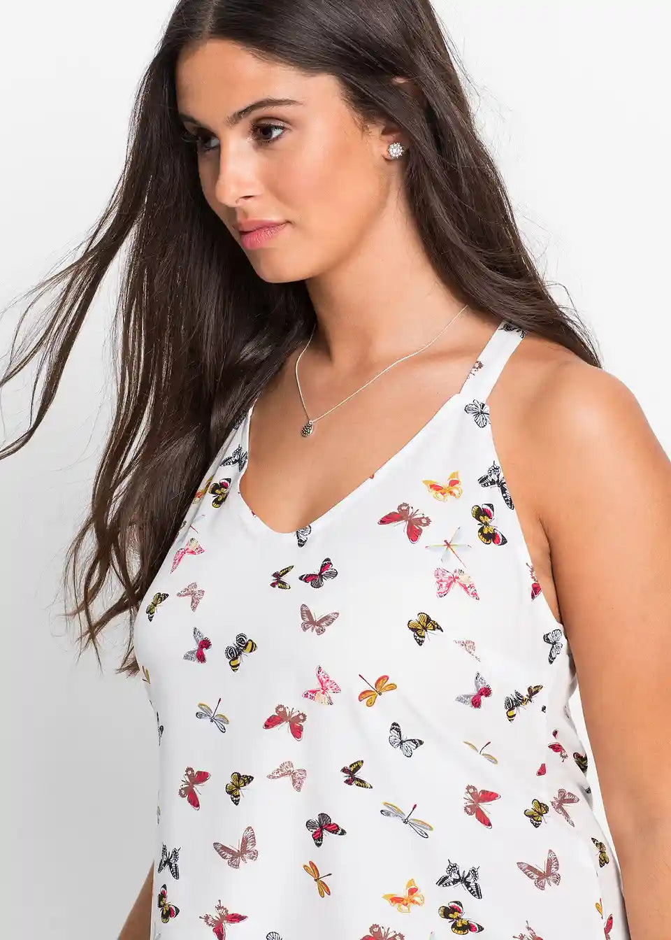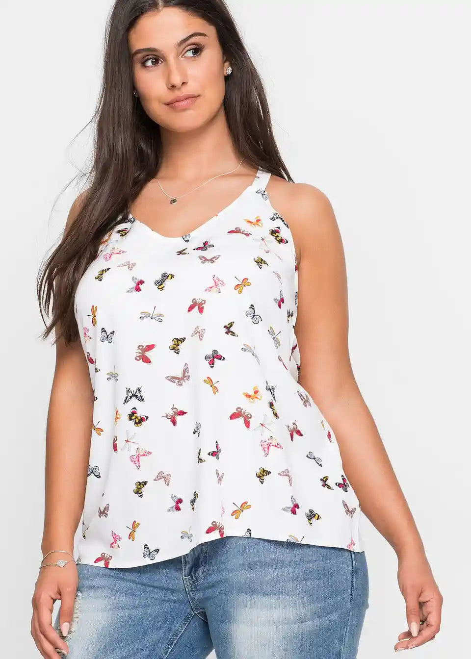Ženski bluzni top v razširjeni obliki in z diskretnim V-izrezom. Dolžina pri št. 38 je približno 53 cm.