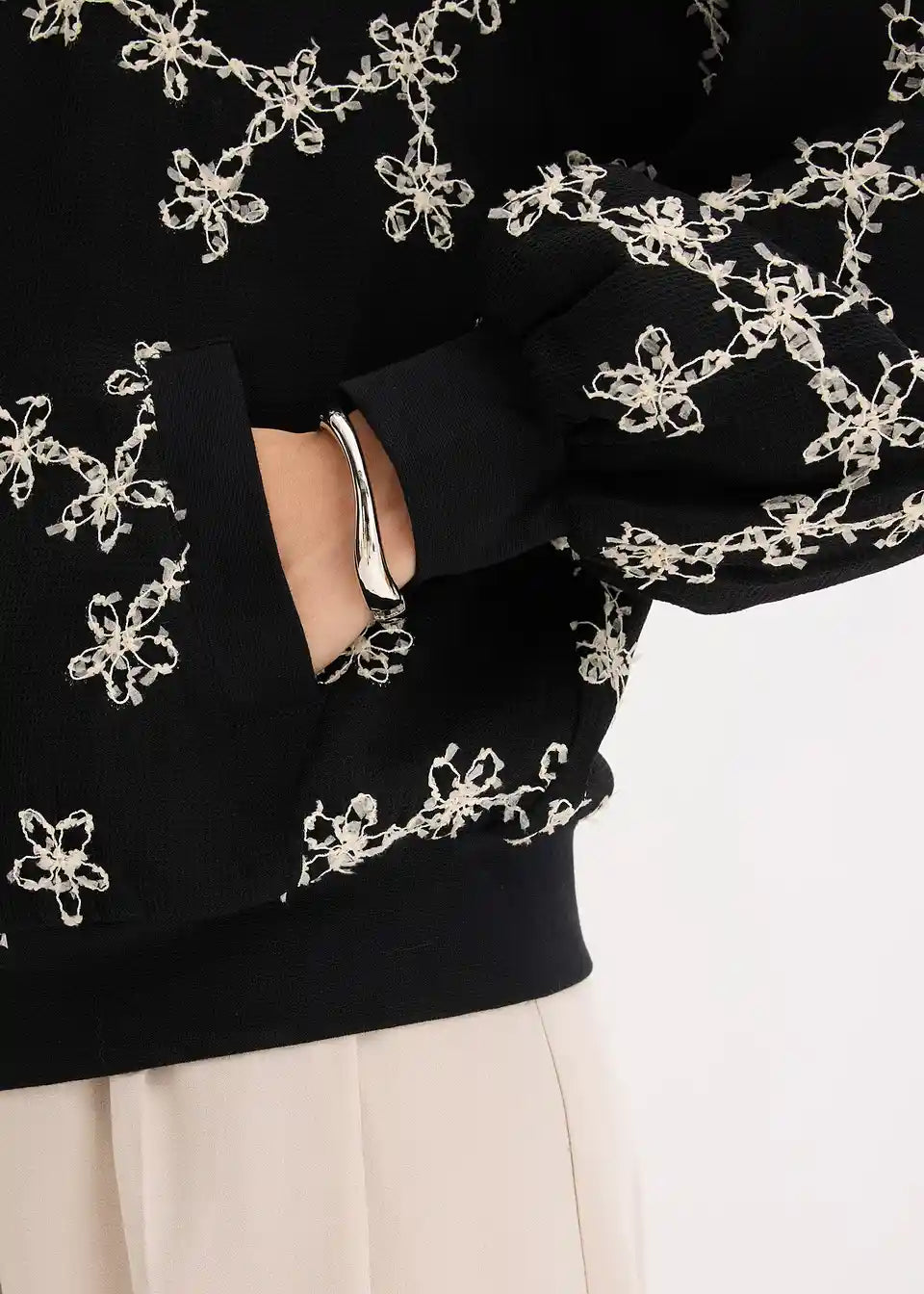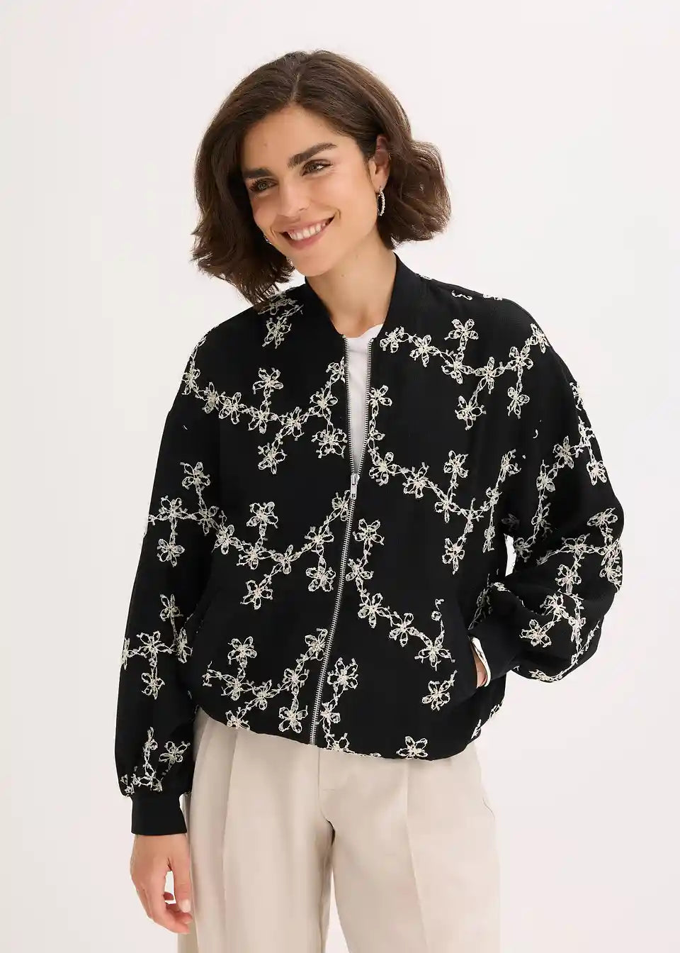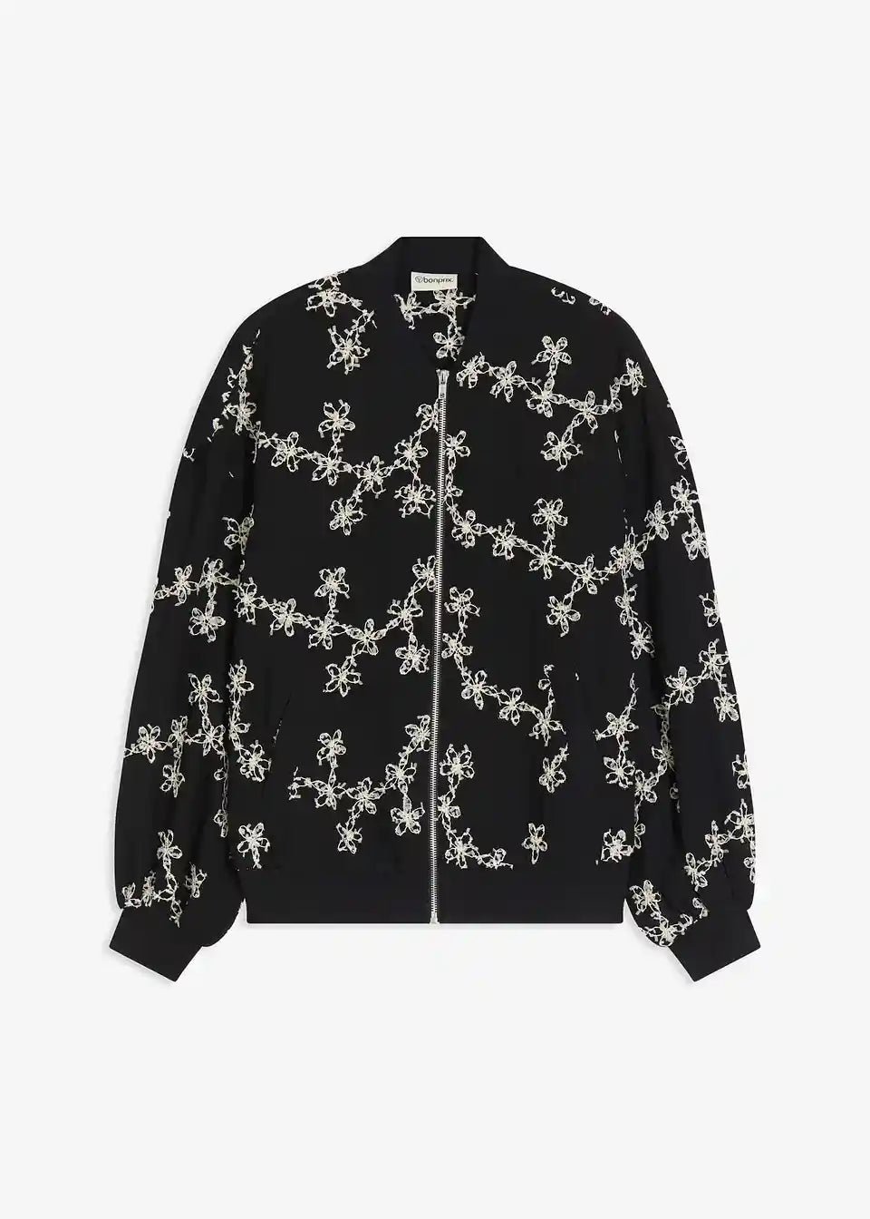 modni bluzon s cvetlično vezenino in zadrgo spredaj