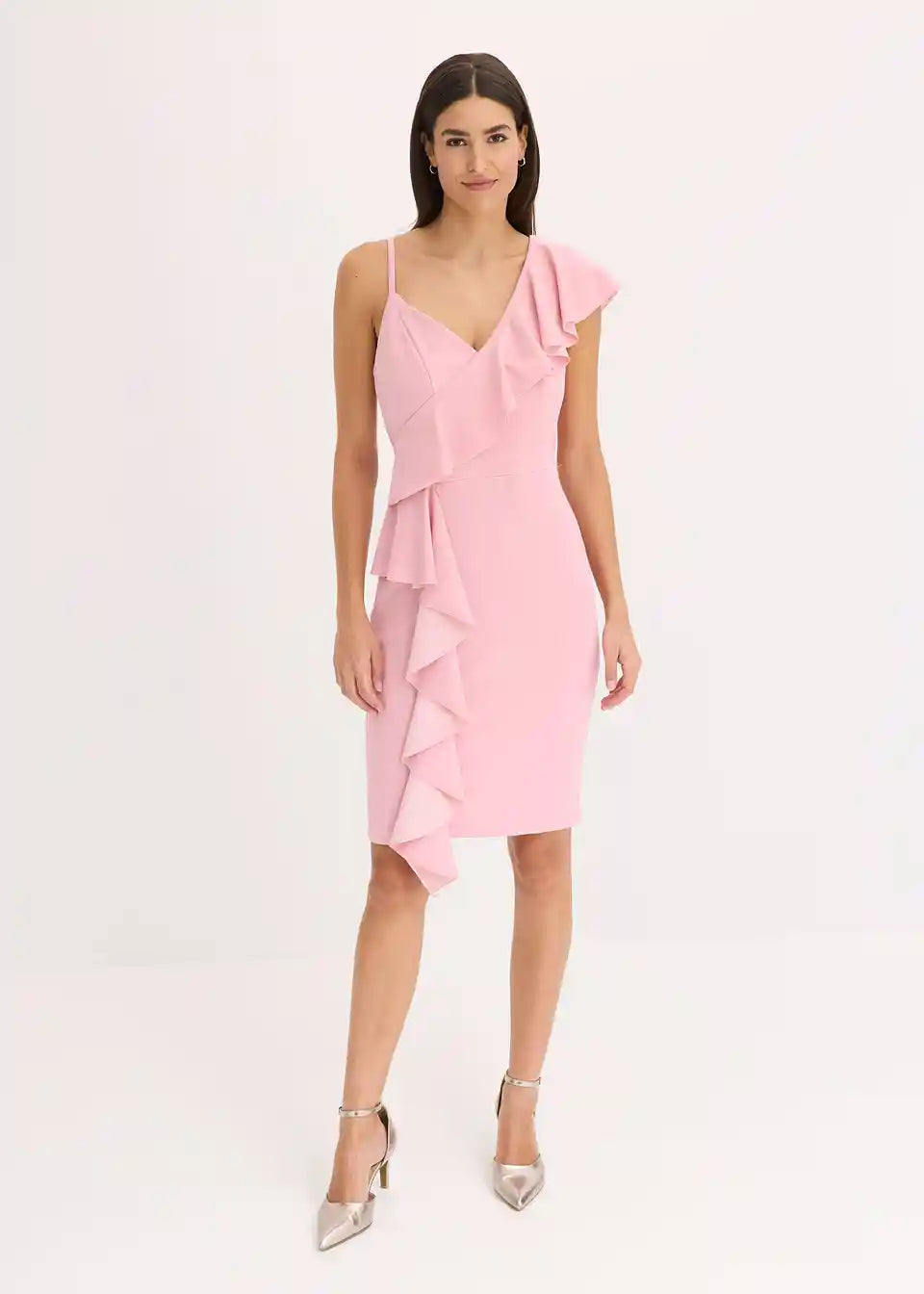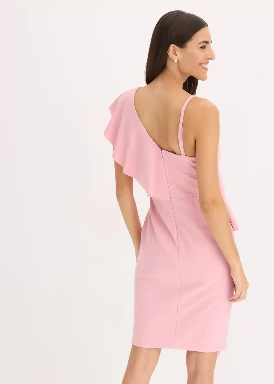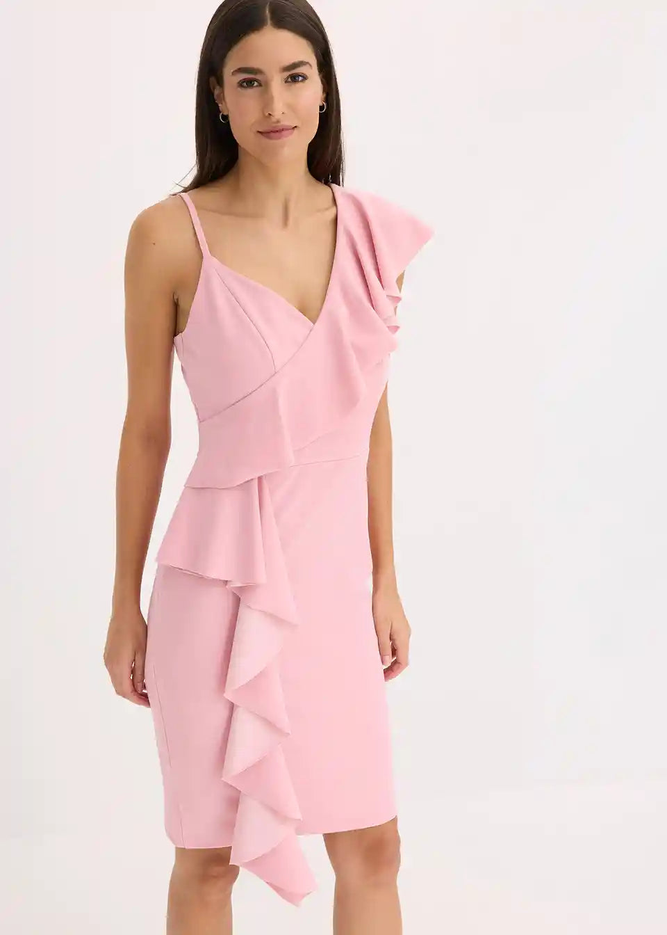 Moderna in ženstvena: oprijeta Bodycon obleka mini dolžine s spaghetti naramnicami in volani.