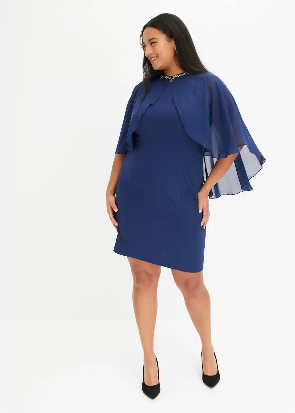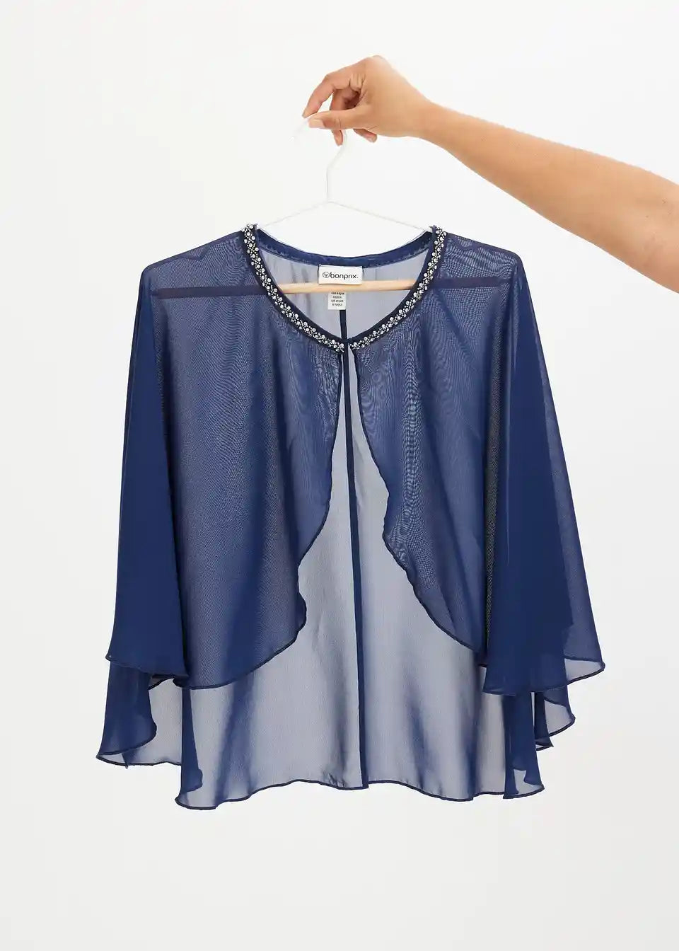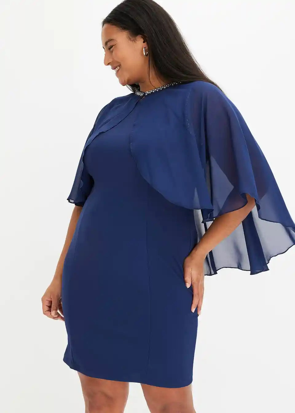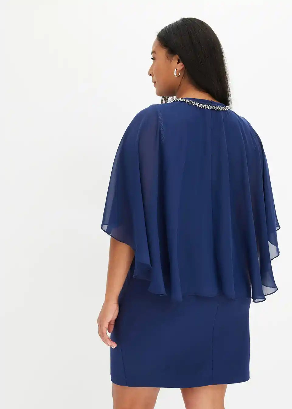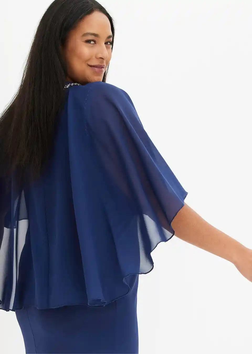 Obleka iz strukturiranega krepa z okrasnimi kristali ob izrezu rokavov ter odstranljivim plaščem z okrasnimi kristali na izrezu.