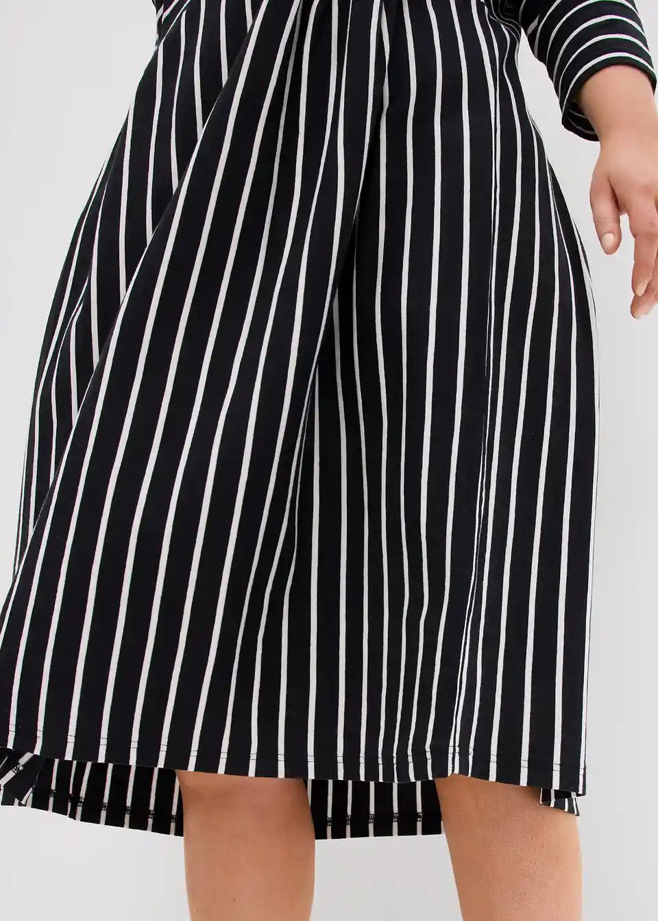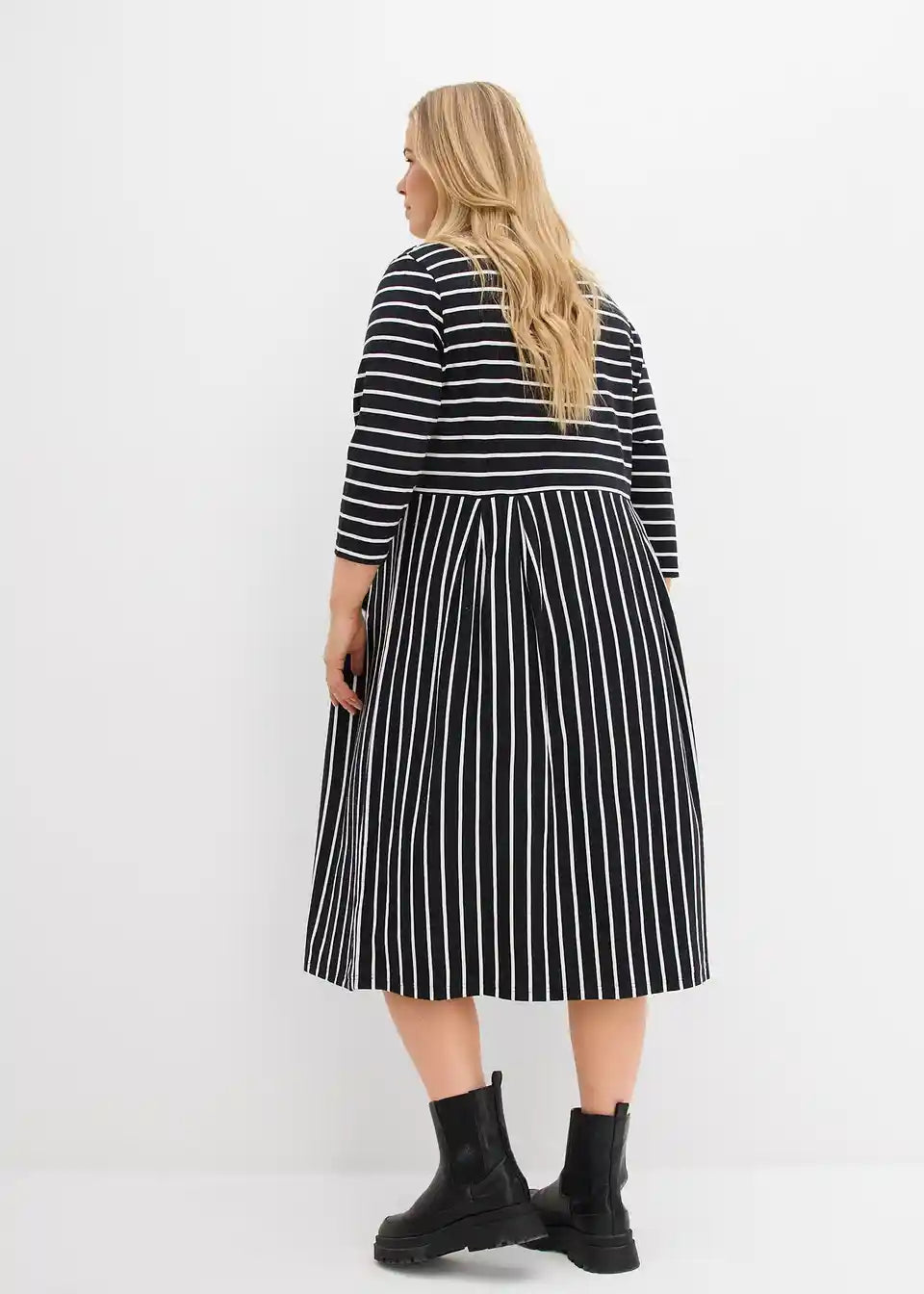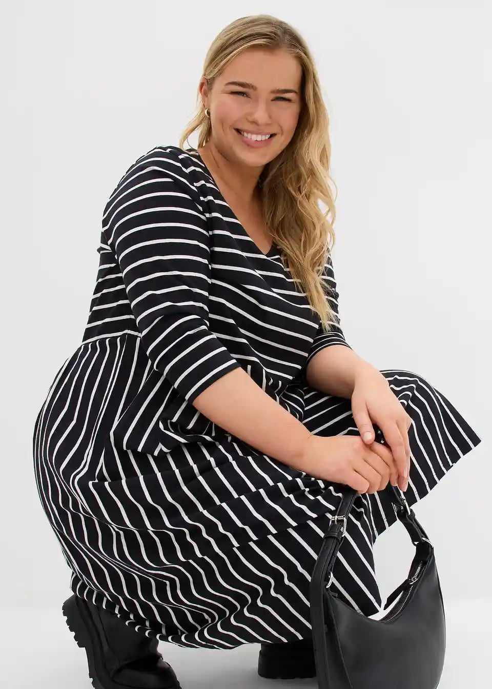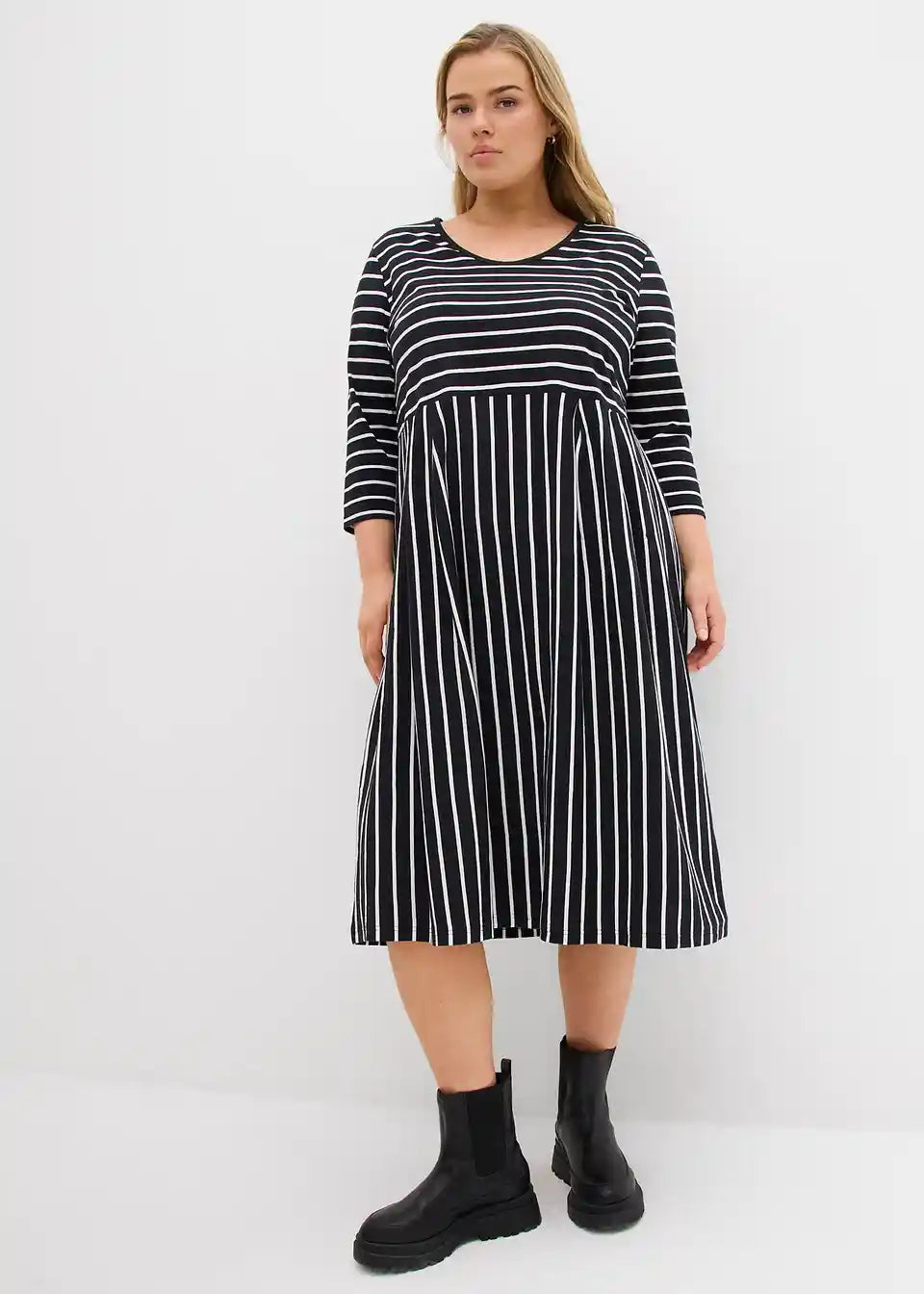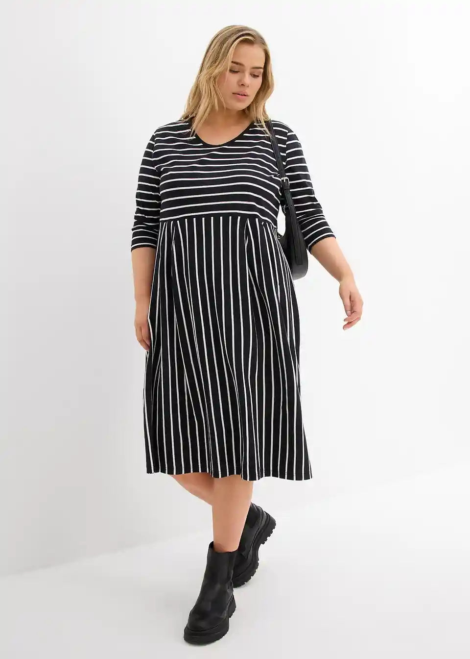 Kolenom pokrivajoča jersey obleka s krojem, ki lepo oblikuje postavo