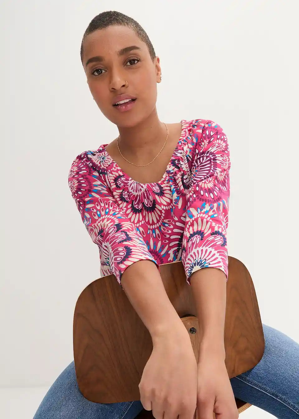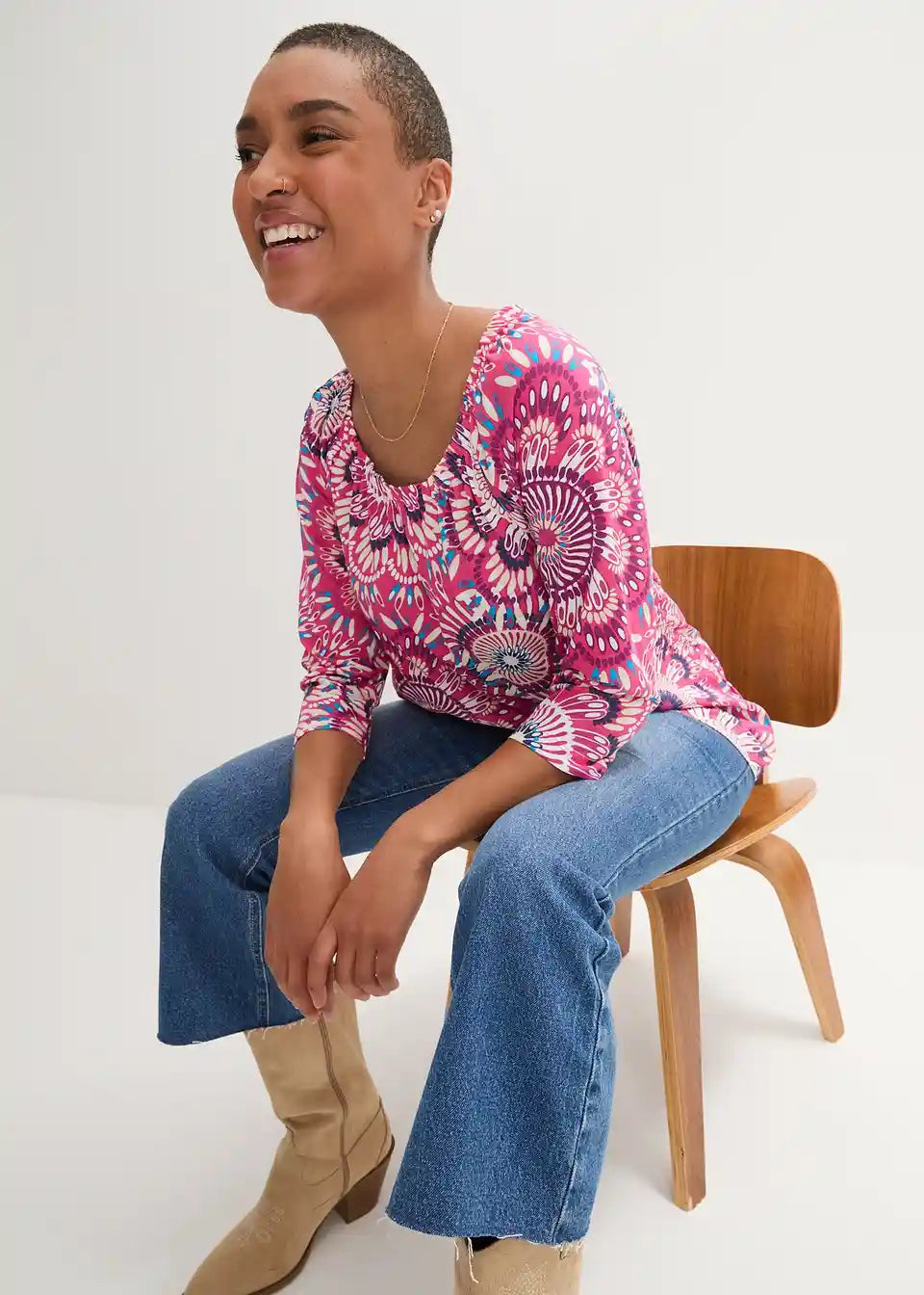 Zaradi čudovitega kroja majica s 3/4 rokavi elegantno poudari silhueto in navdušuje z izjemnim občutkom nošenja. Zgornji del znamke bpc je krojen v maskirajoči A-liniji in daje opravi lahkoten videz. Udobna oblika naredi model za vsestranski najljubši kos za vsakdan. Okrogel izrez je na tem zgornjem delu rahlo guban z gumijastim trakom. V kombinaciji z udobnimi kavbojkami je ženska odlično oblečena.