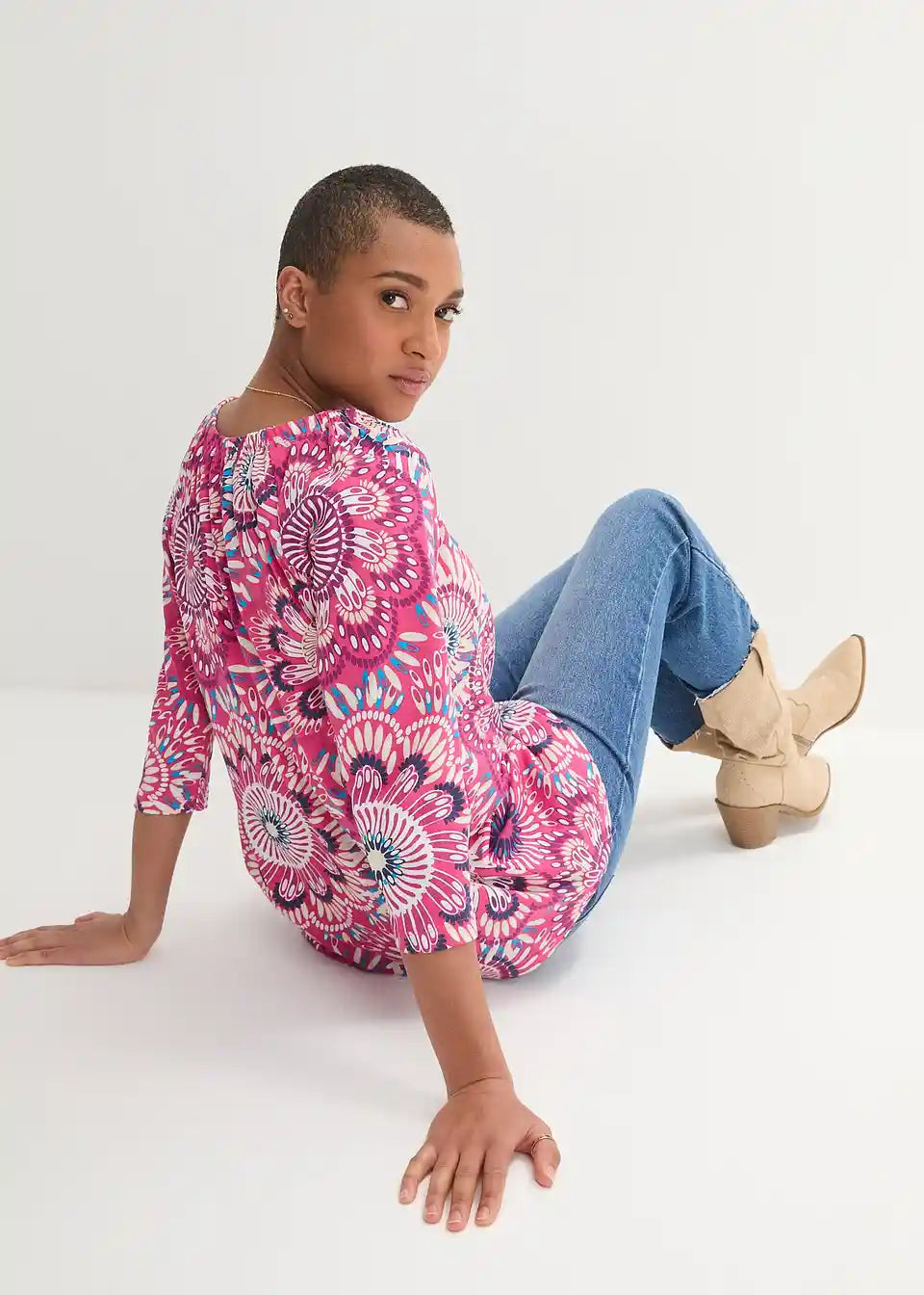 S svojo lepo prileganjem majica s 3/4 rokavi elegantno poudari silhueto in prepriča s čudovitim občutkom nošenja. Zgornji del znamke bpc je krojen v prikrivajoči A-liniji in daje oblačilu lahkoten pridih. Udobna oblika naredi model vsestransko priljubljen del za vsakdanjo rabo. Okrogel izrez je pri tej majici rahlo nabran z elastiko. V kombinaciji z udobnimi kavbojkami se ženska pokaže odlično oblečena.