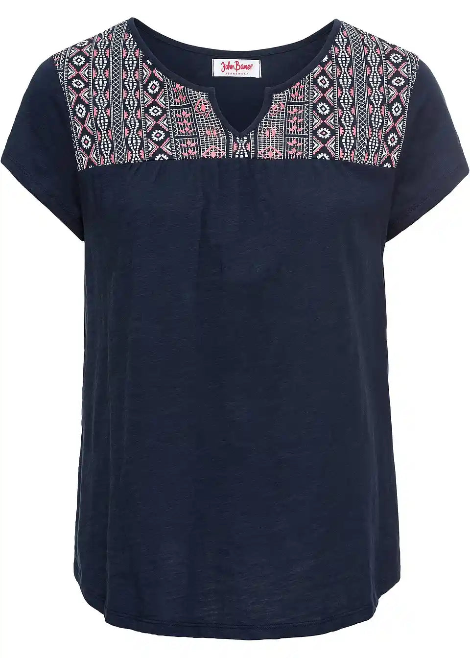 Hipno prekrivajoča majica s kratkimi rokavi v figuri laskavem A-kroju stavi na majhne detajle. Sem spadata manjši V-izrez na visokem okroglem izrezu ter kul potisk na zgornjem delu. Nato sledi tkanina, ki je nabrana v majhne gube. Vsak od teh modelov znamke John Baner je unikat. Potiskana majica s kratkimi rokavi v A-kroju s Henley ovratnikom izgleda še posebej privlačno v kombinaciji z oprijetimi kavbojkami in balerinkami.