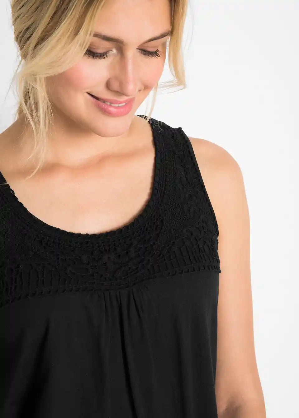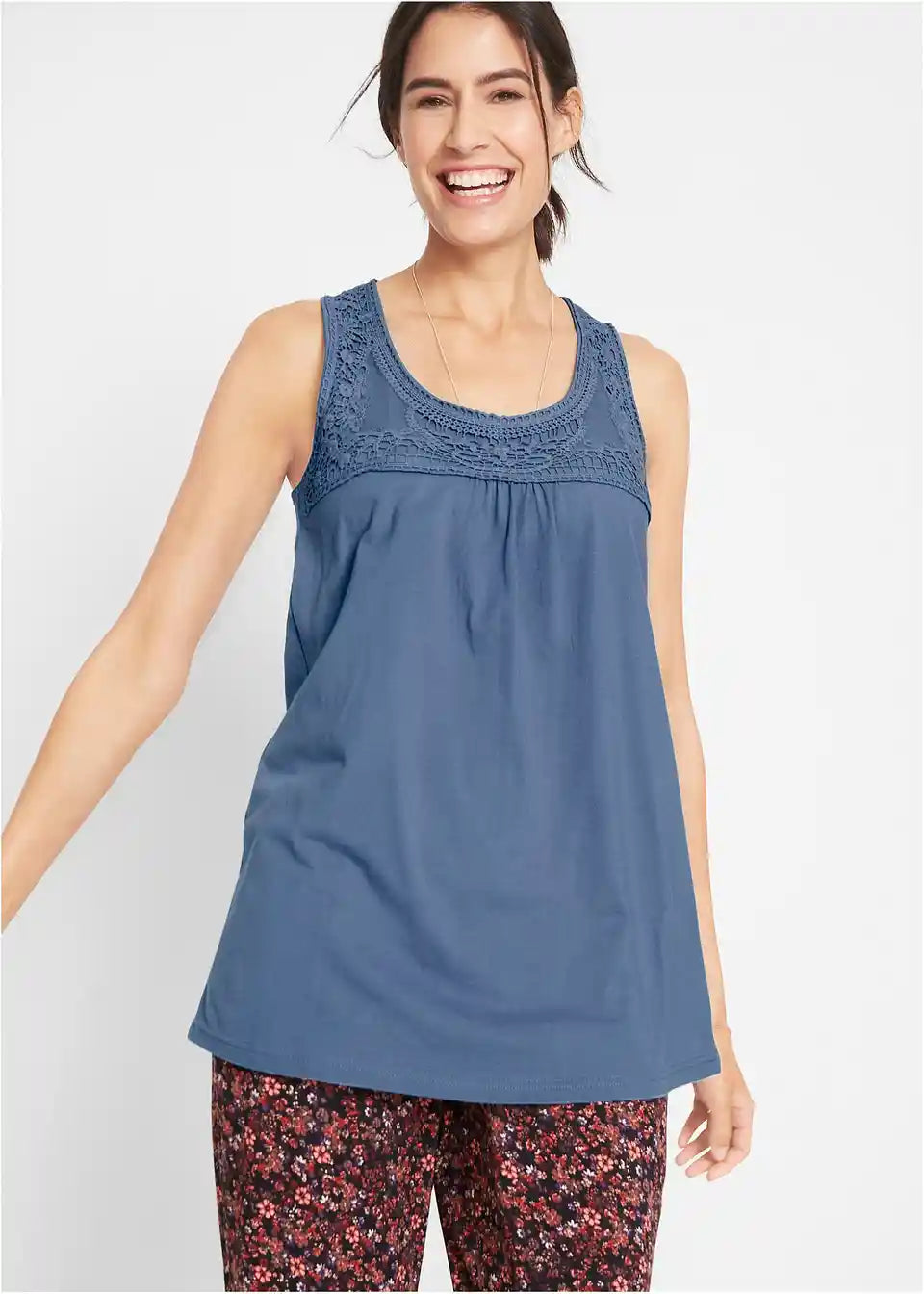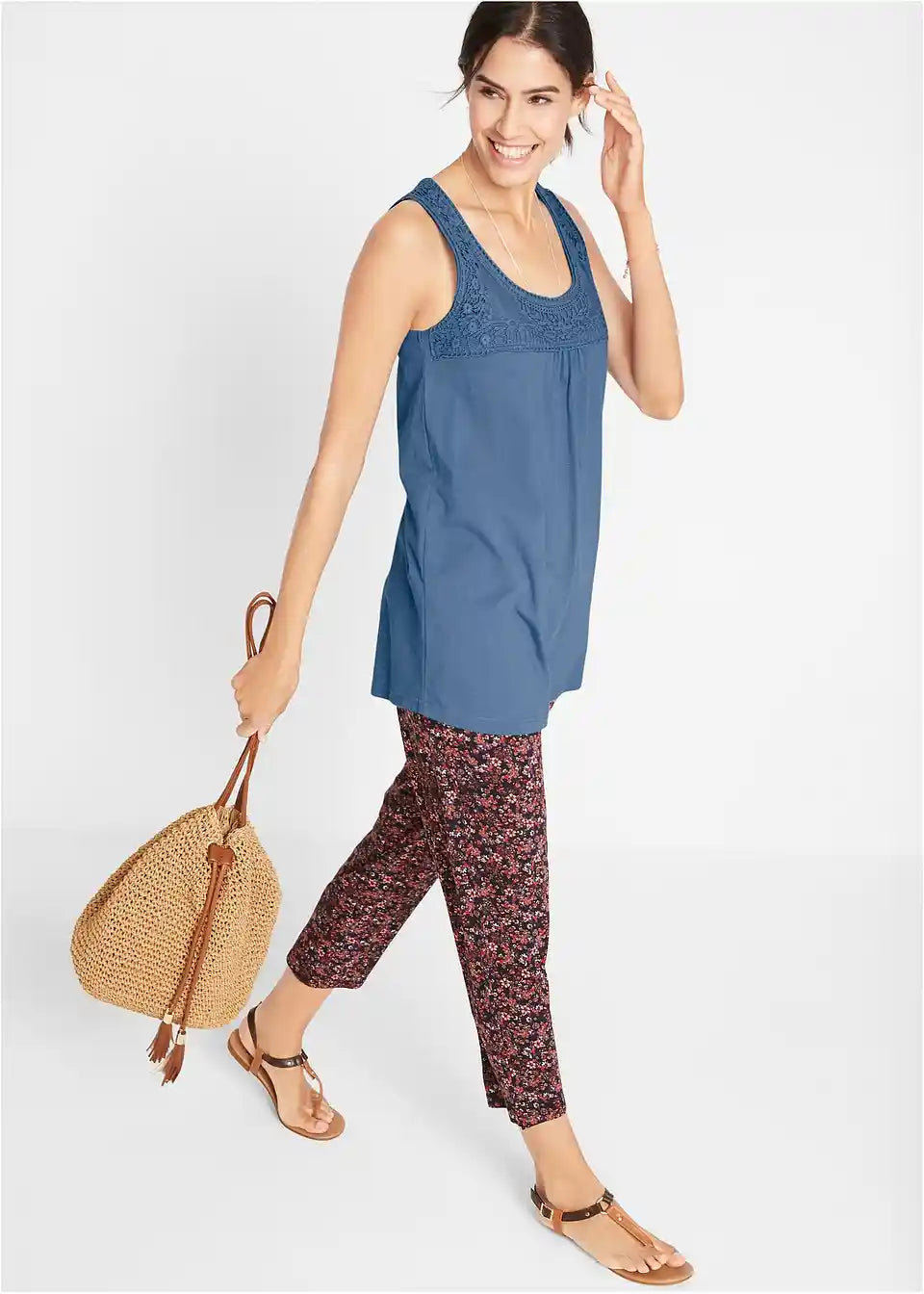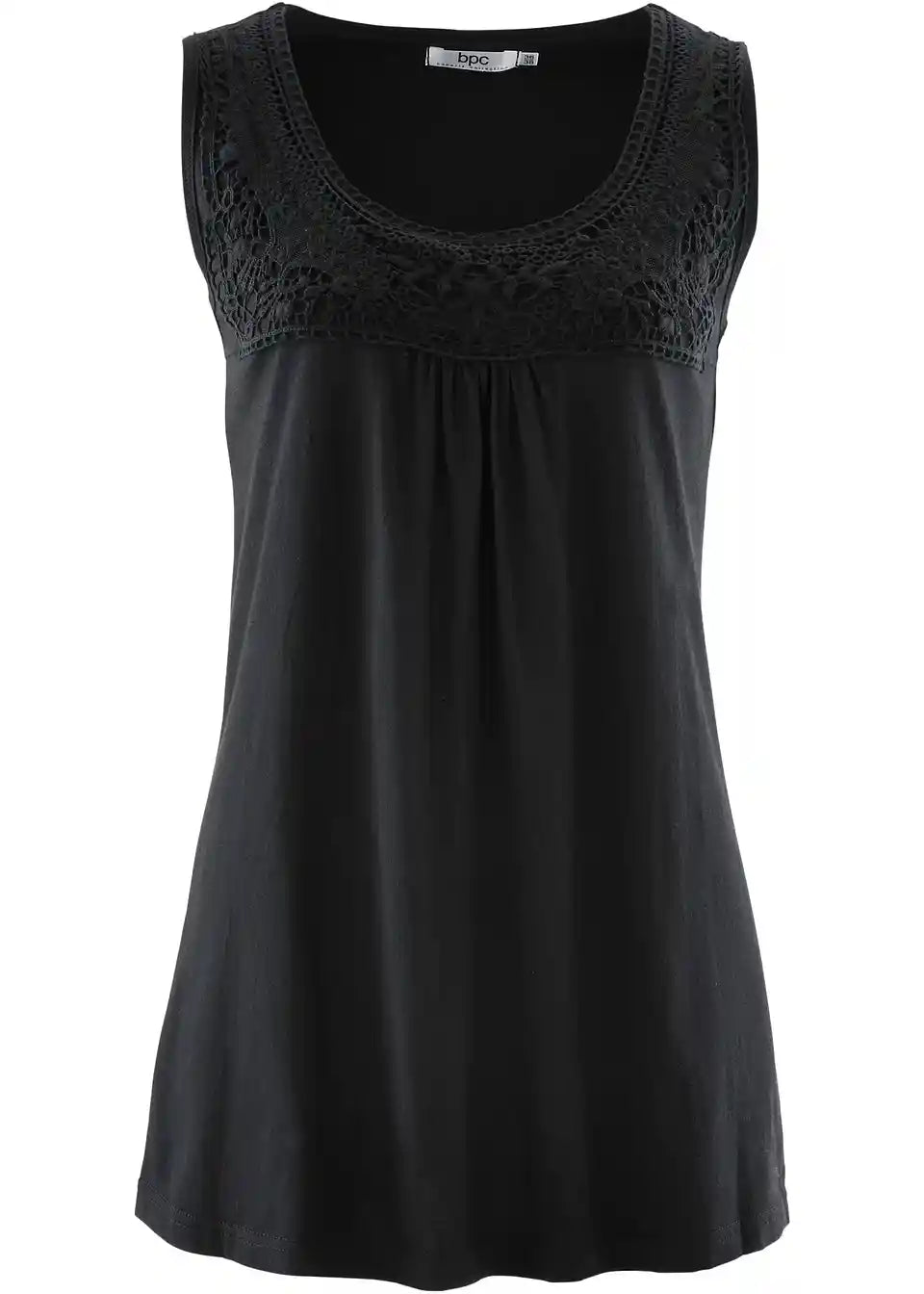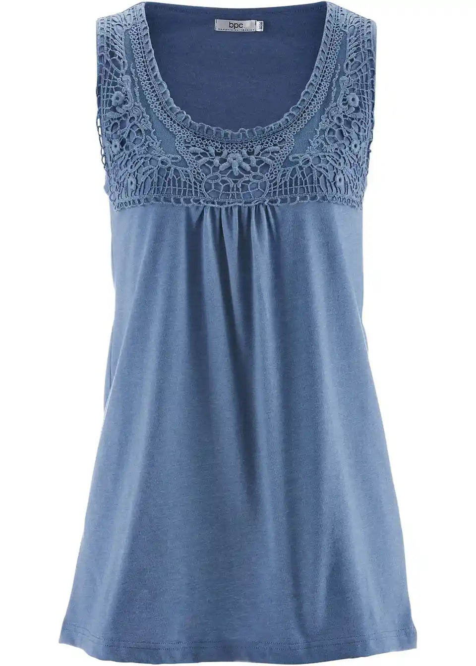 Ton na ton dodatek iz čipke krasi zračen top od ramen do prsi in ustvarja poseben okvir za dekolte. Z diskretnim naborkom pod prsmi in rahlo razširjenim robom prispeva top znamke bpc k laskavi ženski postavi. Lahek material zagotavlja prijeten občutek nošenja tudi v vročih dneh.